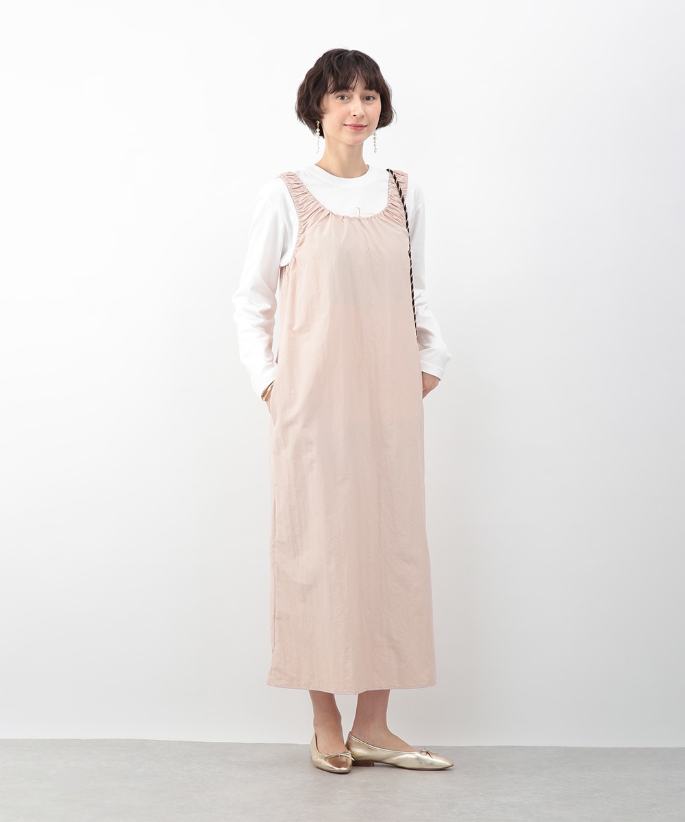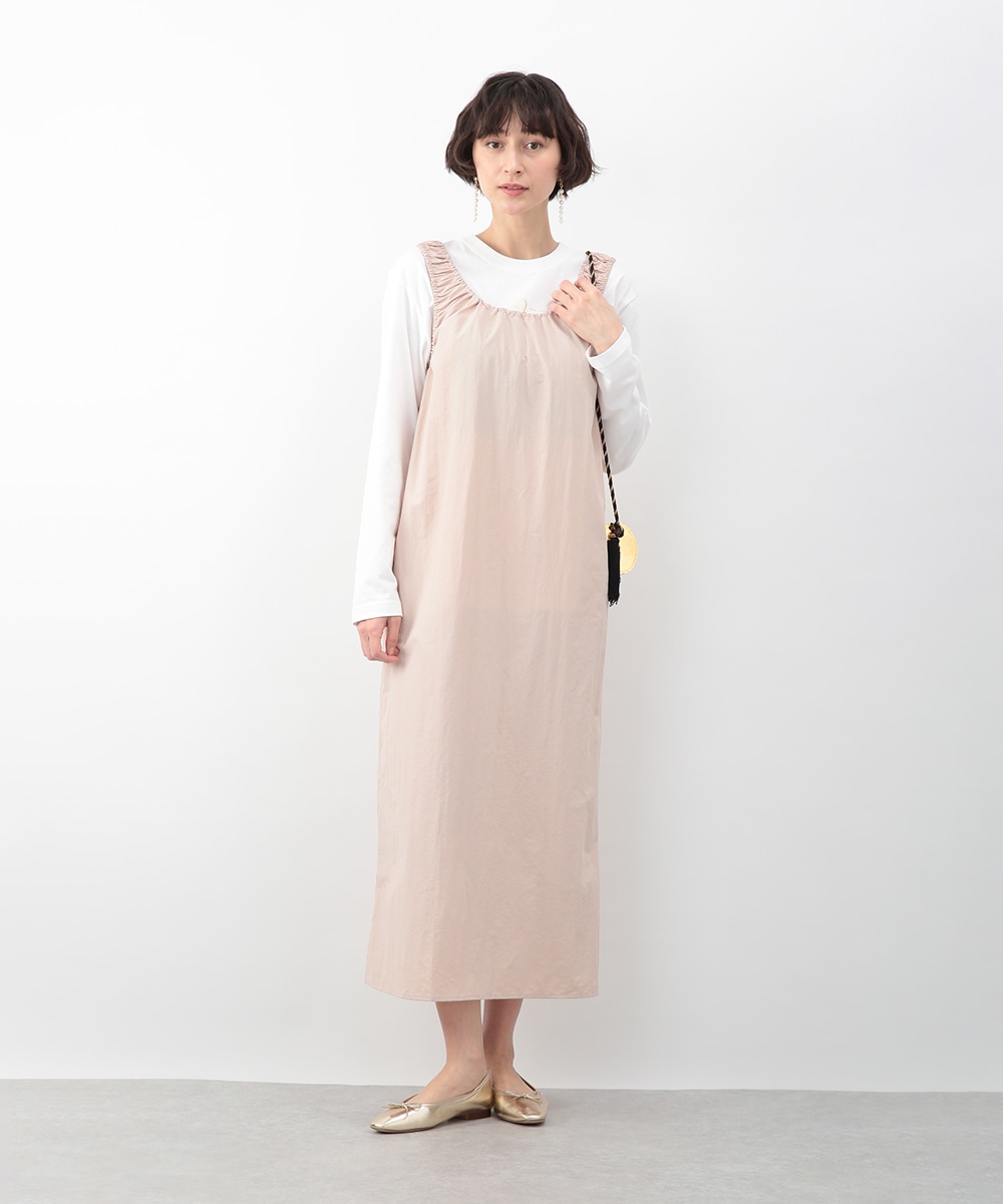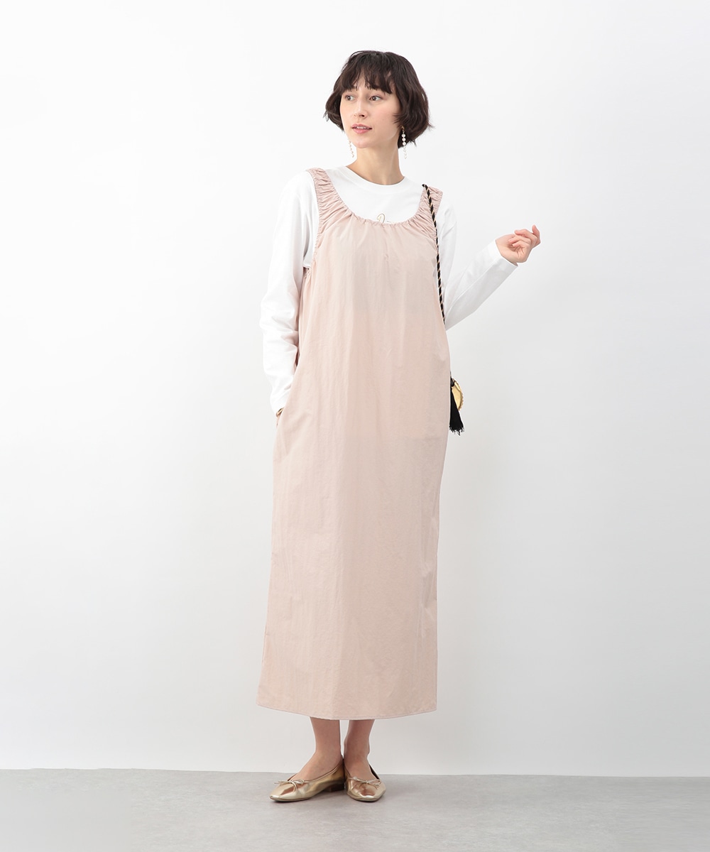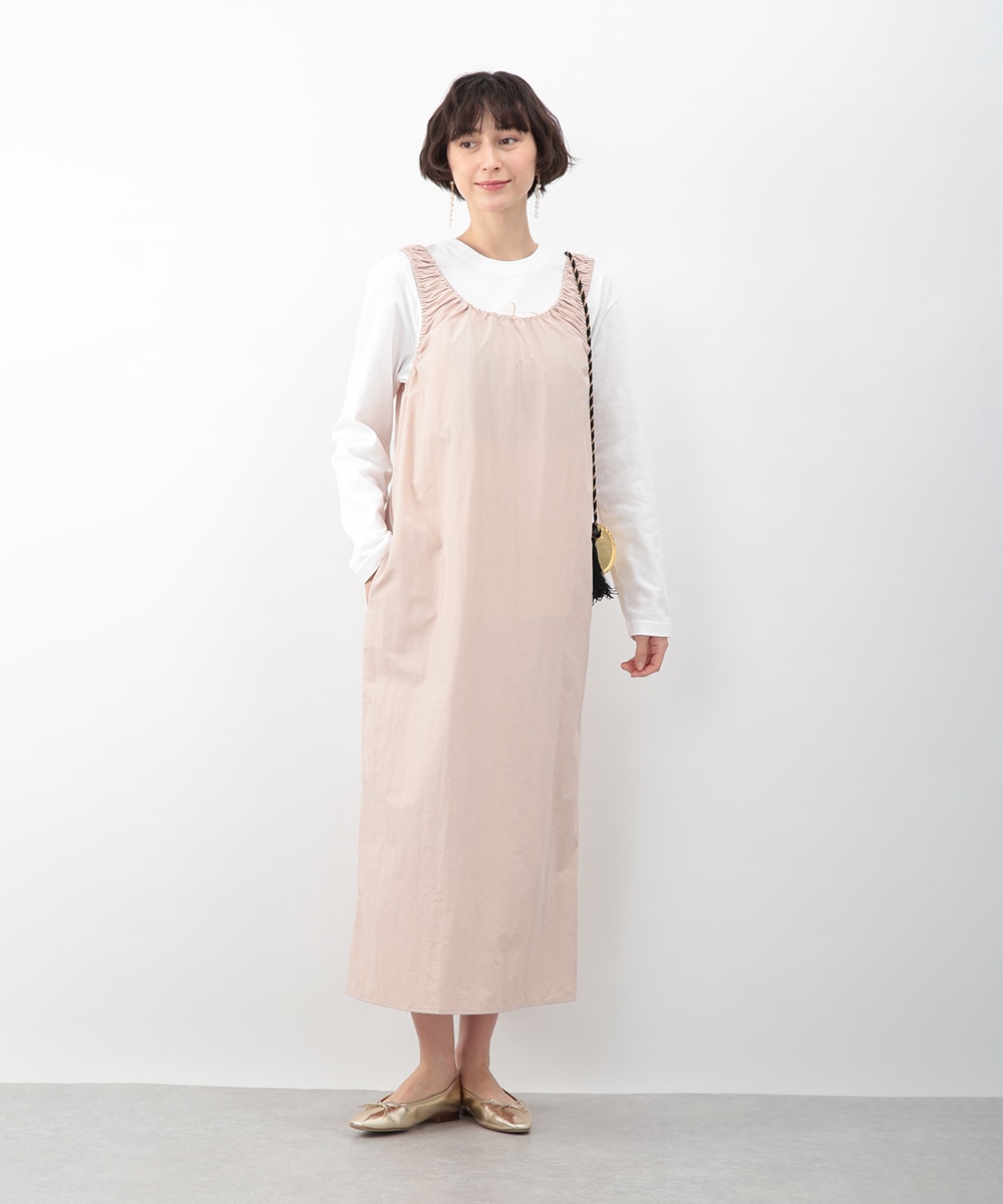 肩に施したギャザーがさりげないアクセントになるIラインワンピース。すっきりとしたシルエットが縦のラインを引き立て、落ち着いた印象に仕上げます。優しいピンクベージュのカラーが女性らしさを添え、インナー次第でさまざまな着こなしに対応。春先から夏の装いまで、幅広いシーズンで活躍するアイテムです。