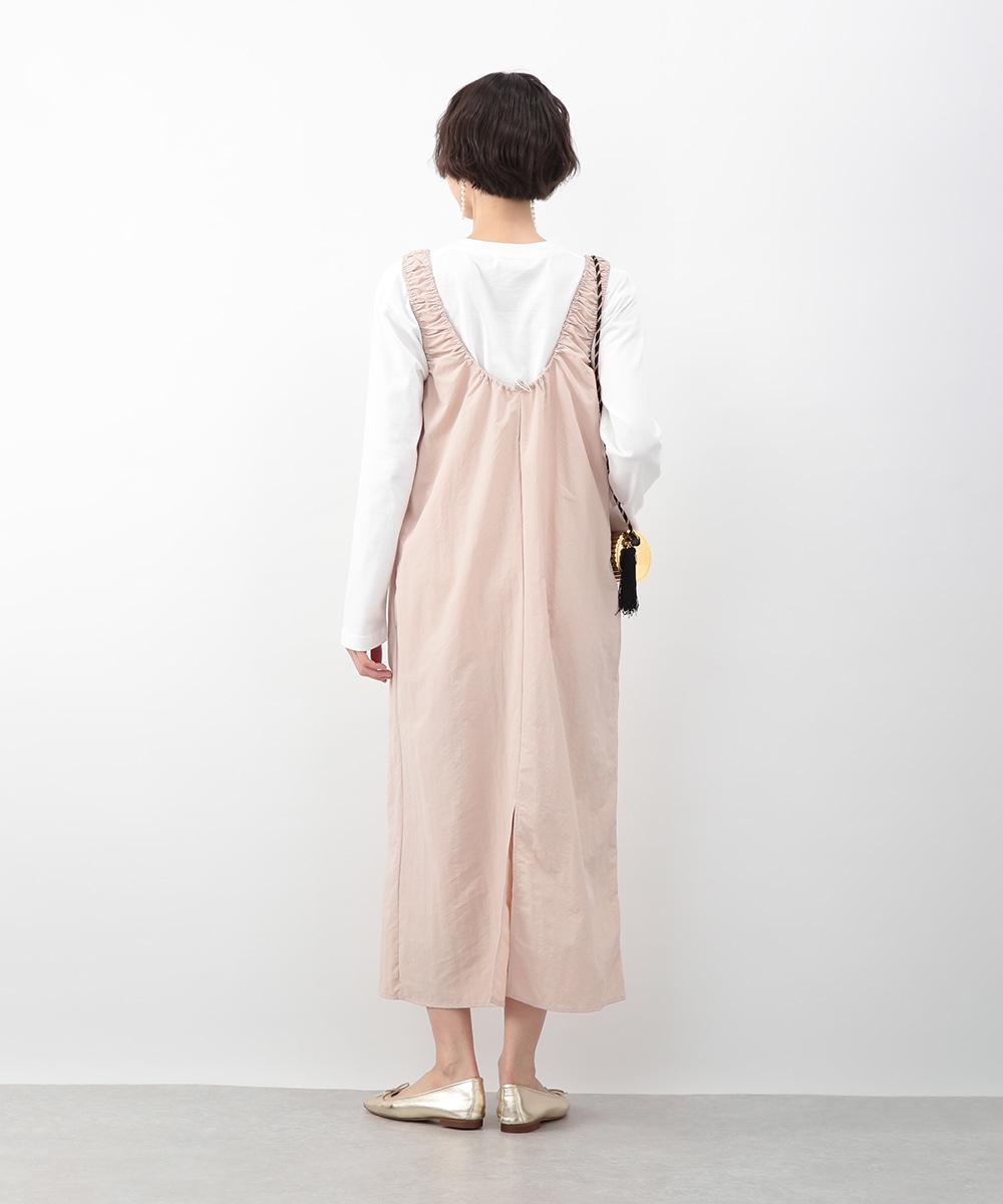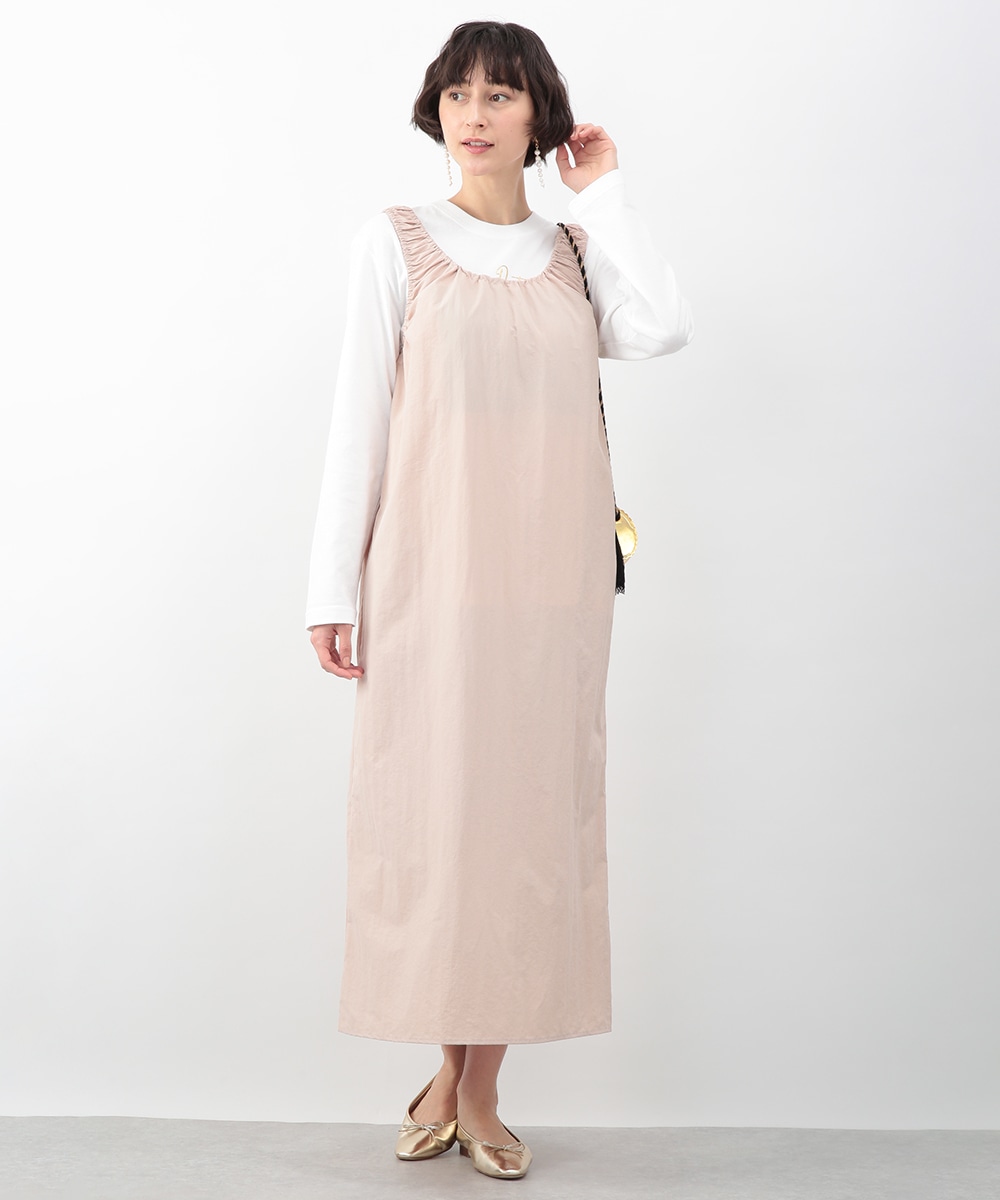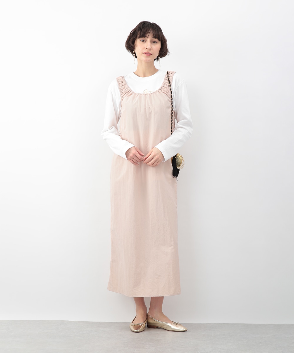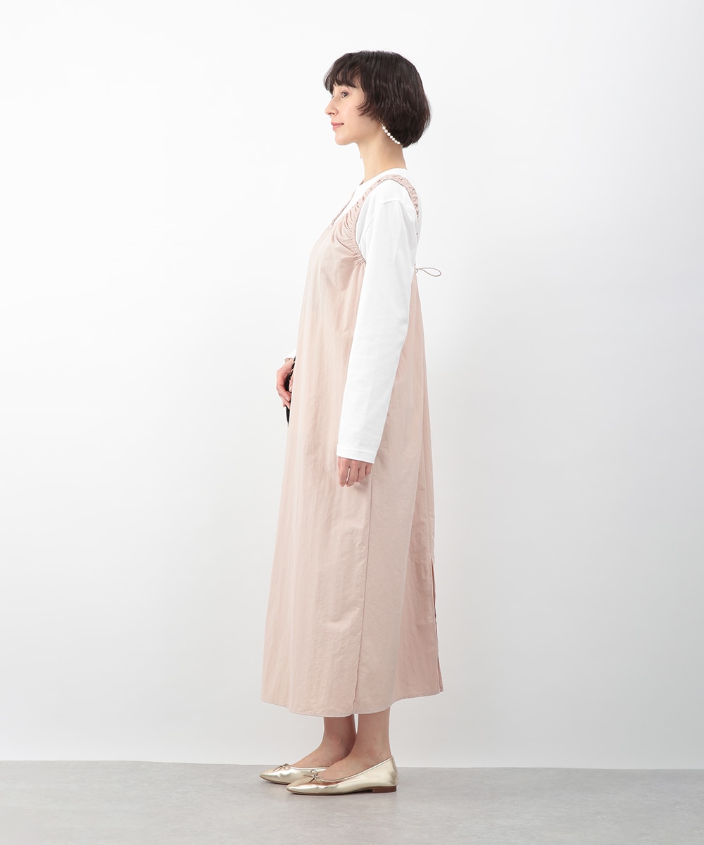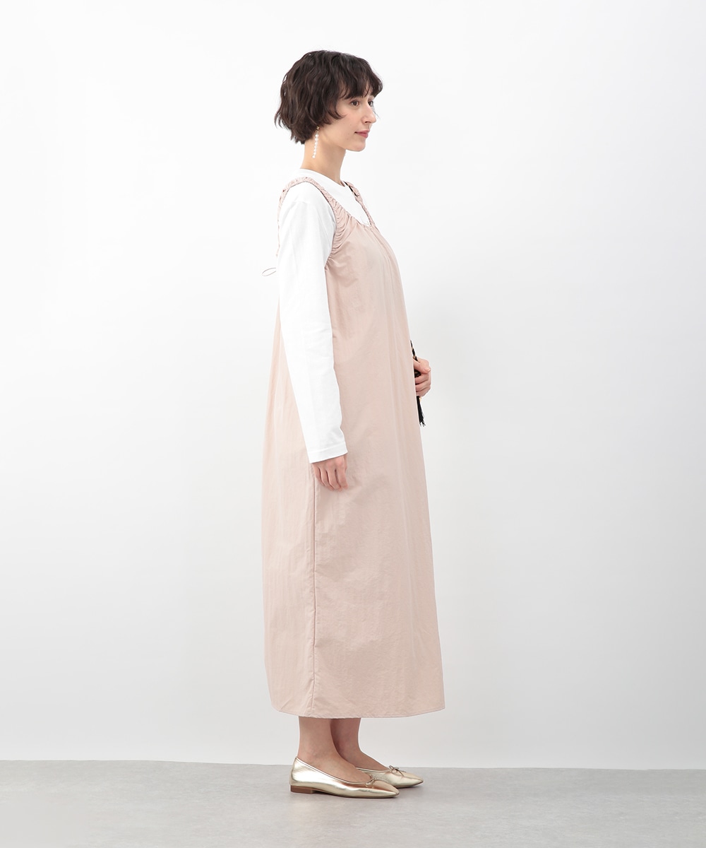 肩に施したギャザーがさりげないアクセントになるIラインワンピース。すっきりとしたシルエットが縦のラインを引き立て、落ち着いた印象に仕上げます。優しいピンクベージュのカラーが女性らしさを添え、インナー次第でさまざまな着こなしに対応。春先から夏の装いまで、幅広いシーズンで活躍するアイテムです。