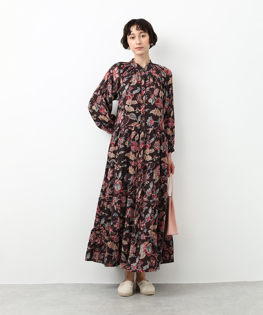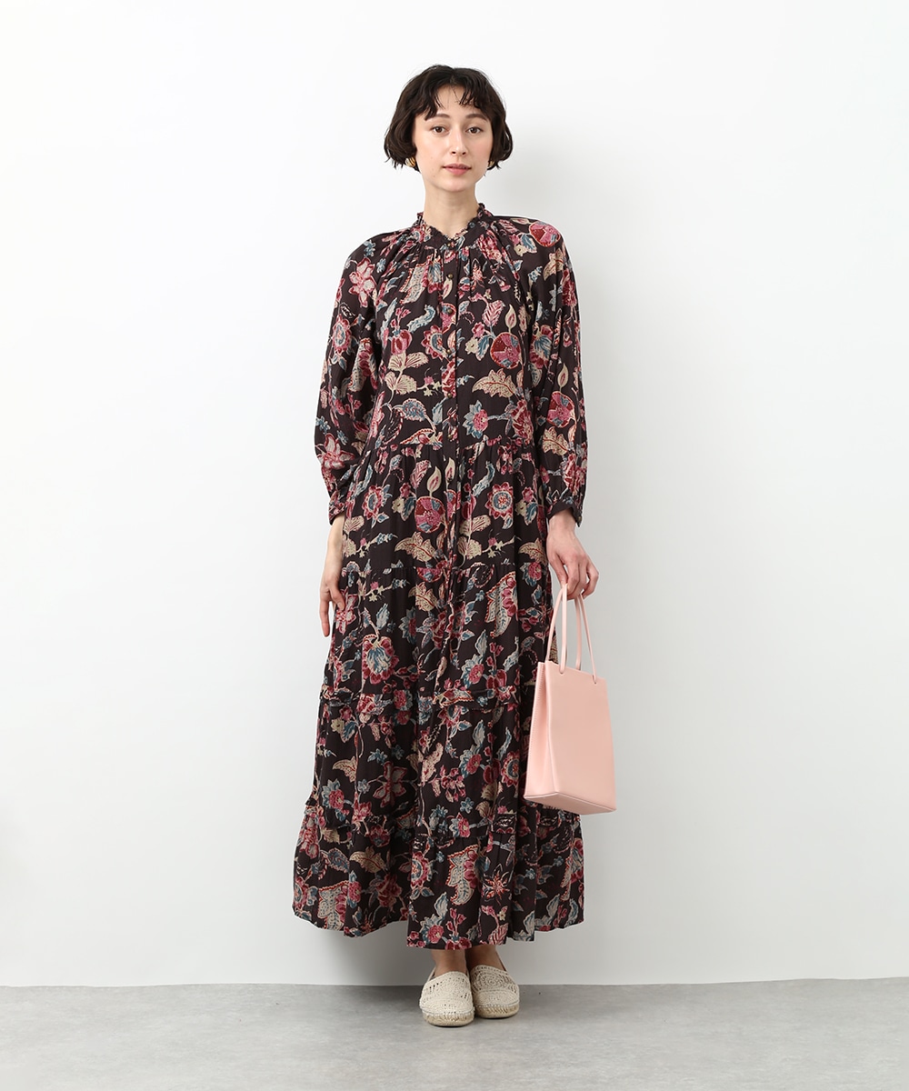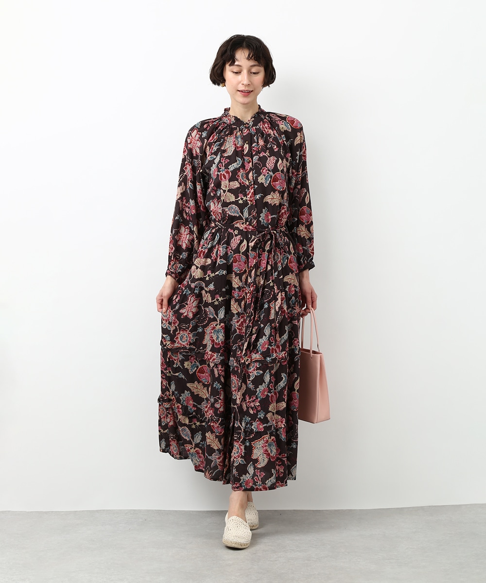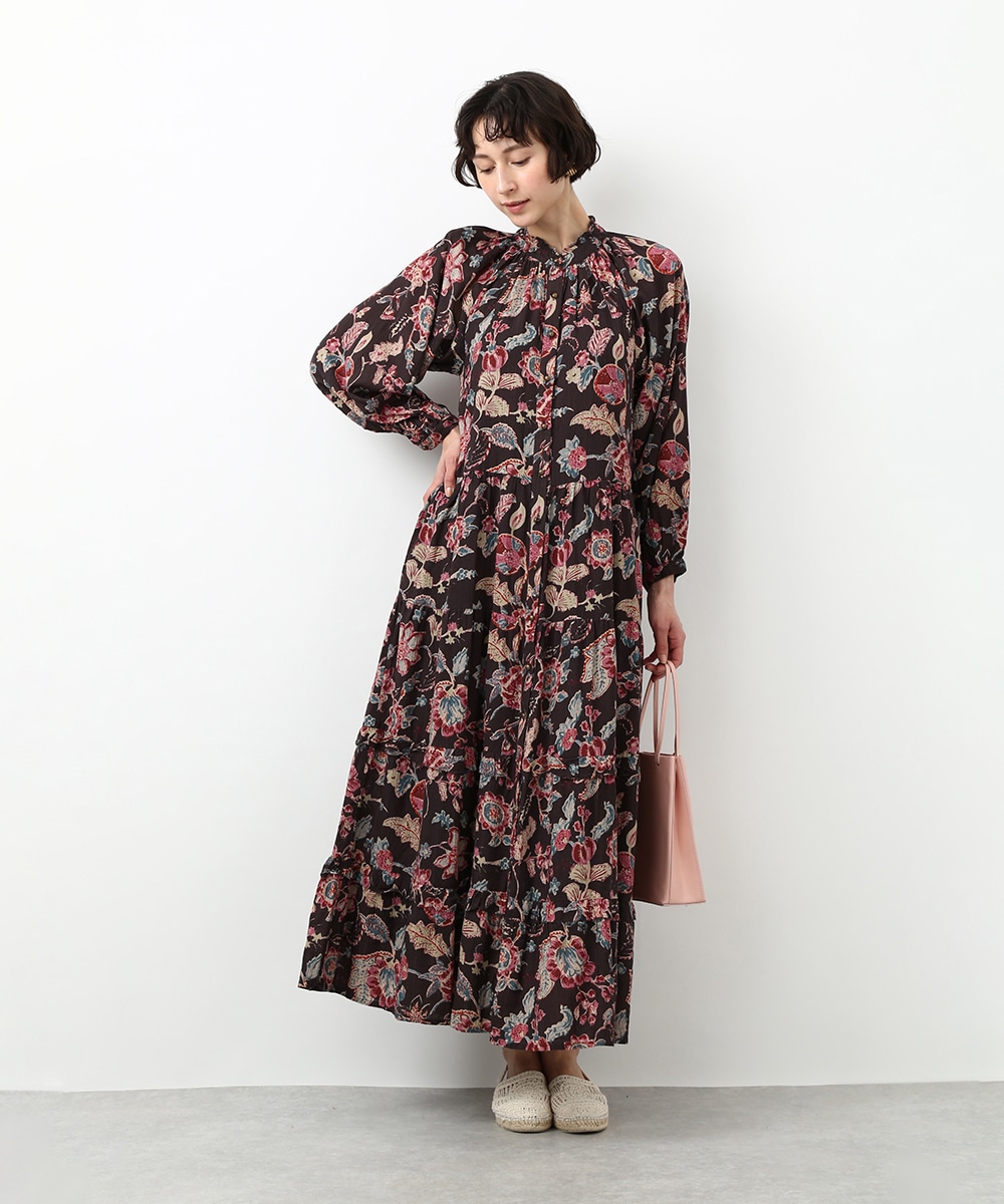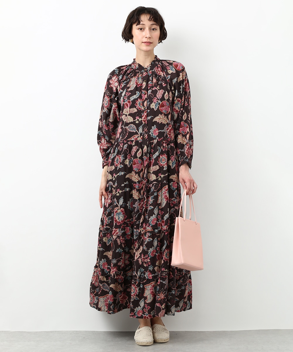 ブラック地にピンクを効かせたボタニカルプリントが目を引くロングワンピース。軽やかな素材で動きのあるシルエットが楽しめ、リラックス感がありながらも上品に着られるのがポイント。フラットシューズを合わせて軽やかにまとめた、抜け感のある着こなしもおすすめです。