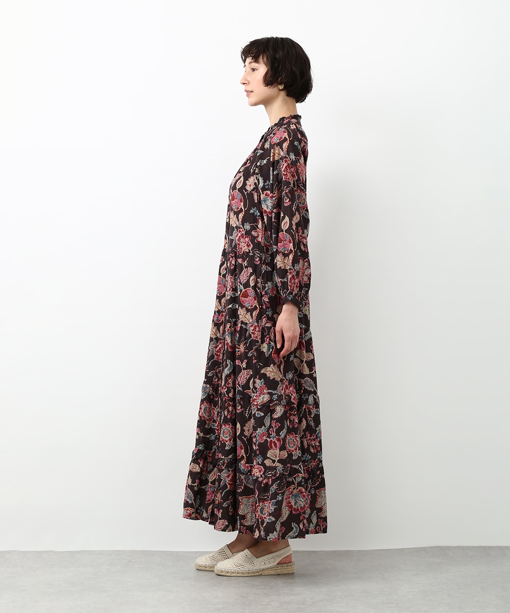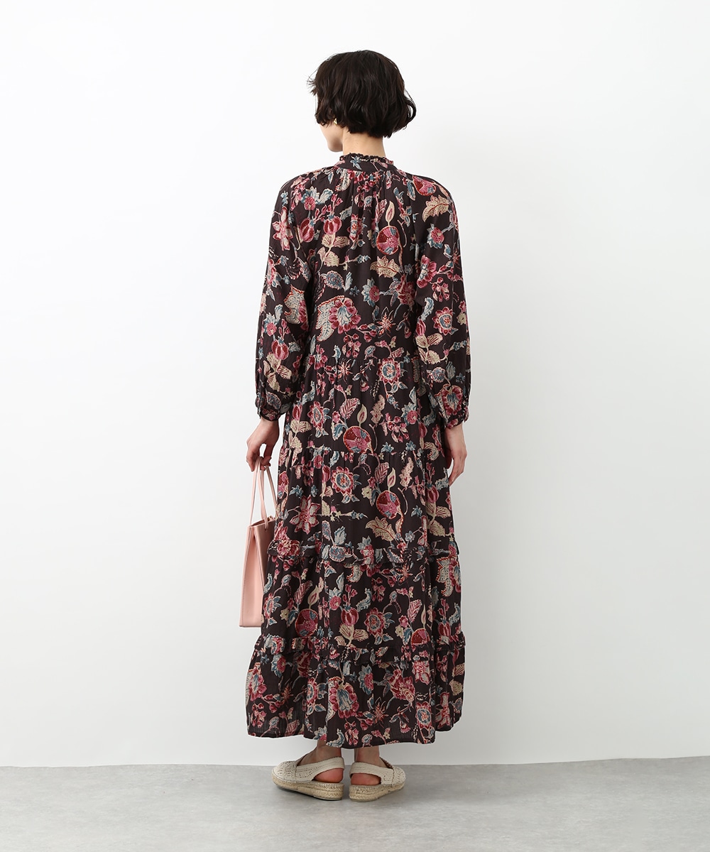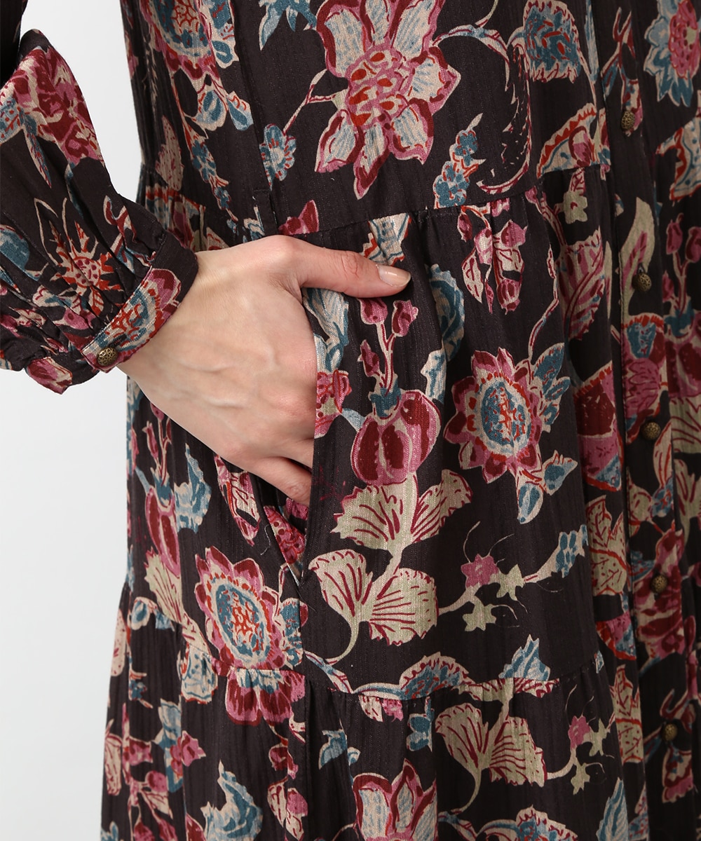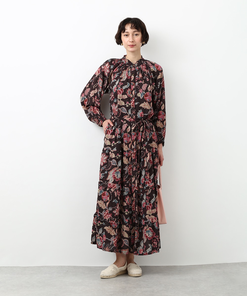ブラック地にピンクを効かせたボタニカルプリントが目を引くロングワンピース。軽やかな素材で動きのあるシルエットが楽しめ、リラックス感がありながらも上品に着られるのがポイント。フラットシューズを合わせて軽やかにまとめた、抜け感のある着こなしもおすすめです。