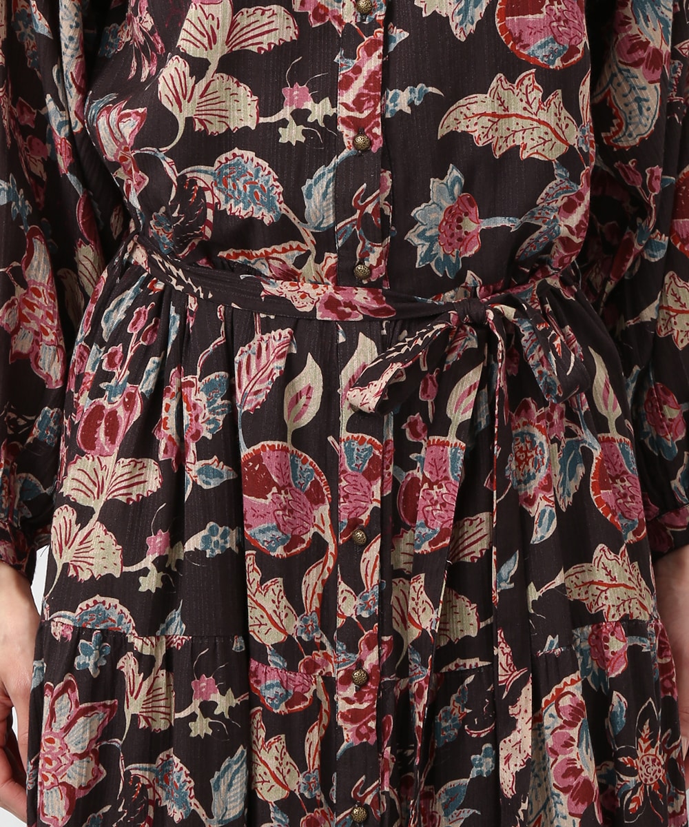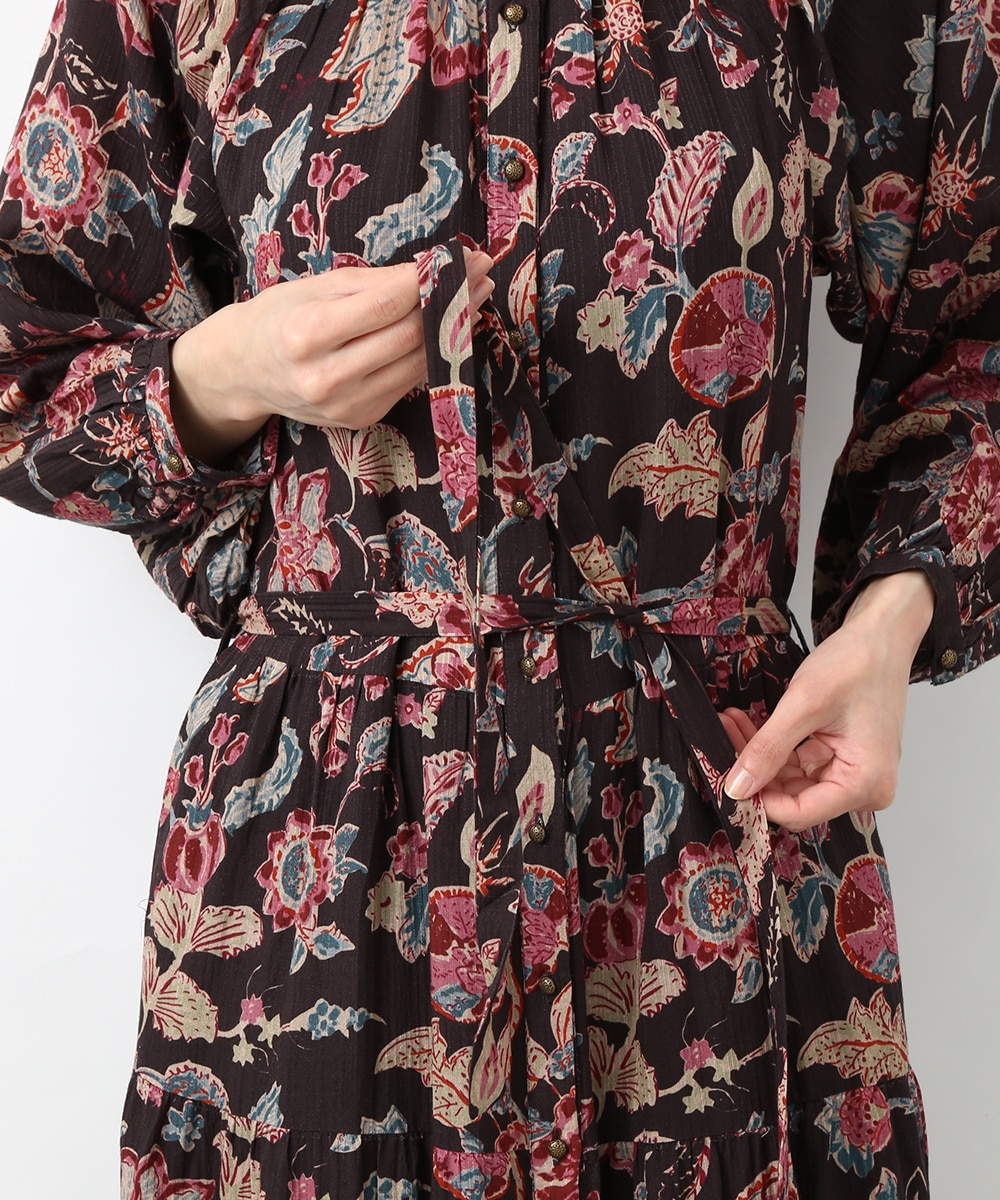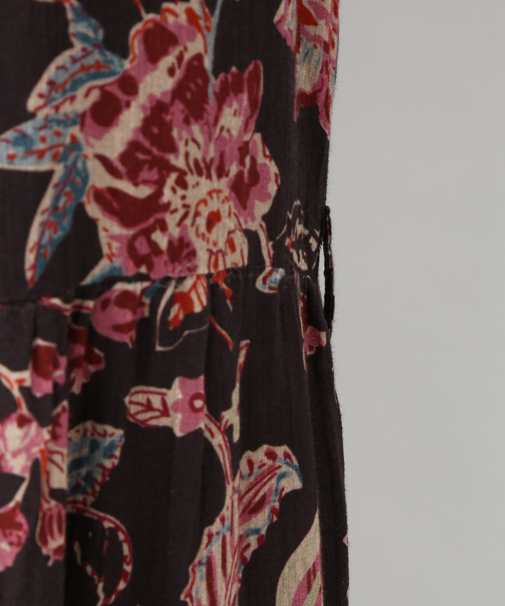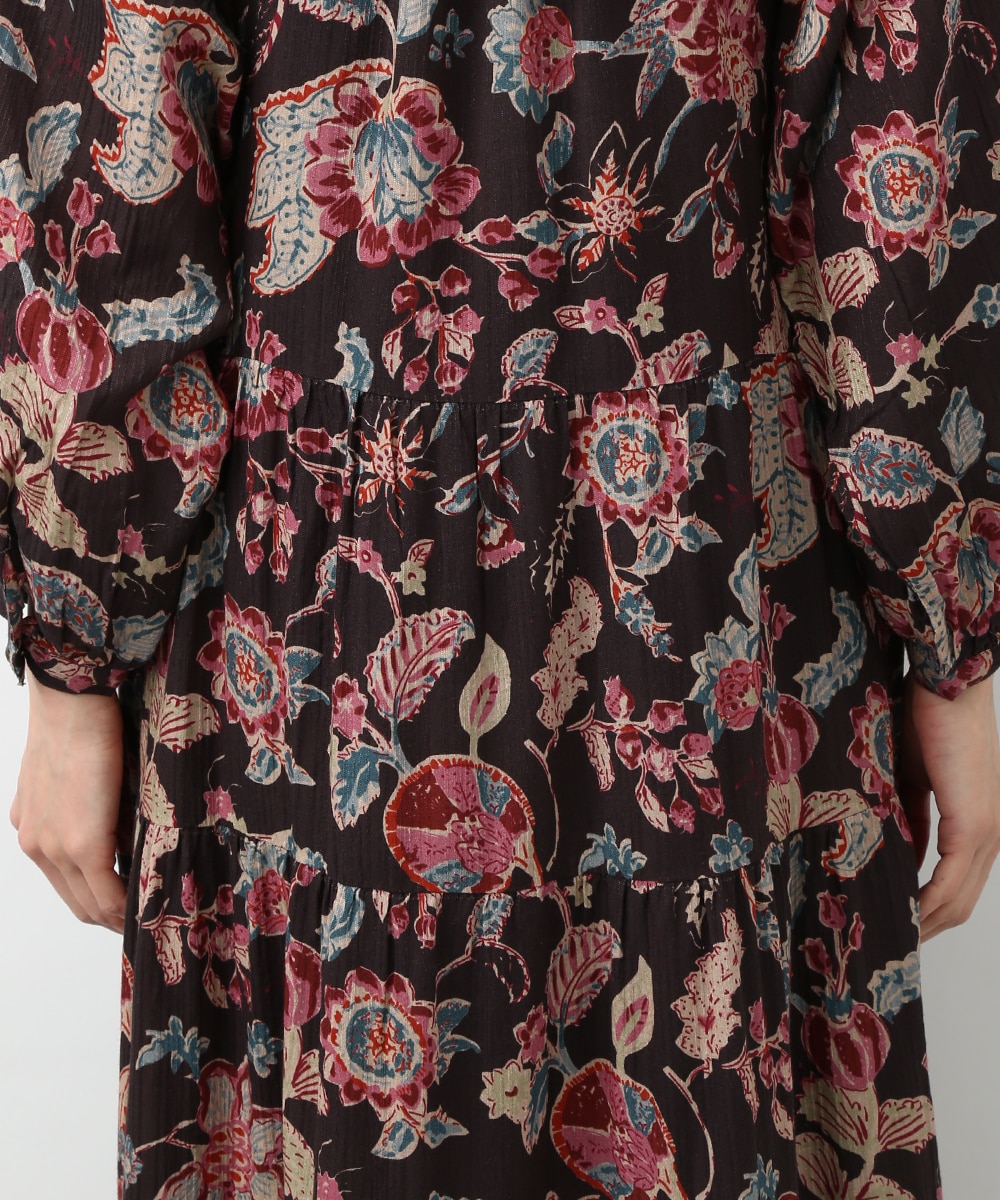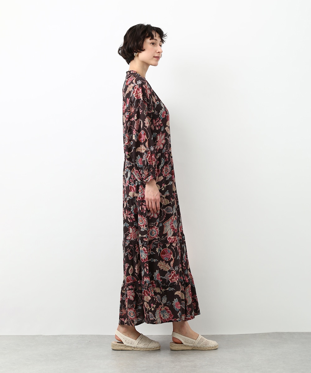 ブラック地にピンクを効かせたボタニカルプリントが目を引くロングワンピース。軽やかな素材で動きのあるシルエットが楽しめ、リラックス感がありながらも上品に着られるのがポイント。フラットシューズを合わせて軽やかにまとめた、抜け感のある着こなしもおすすめです。