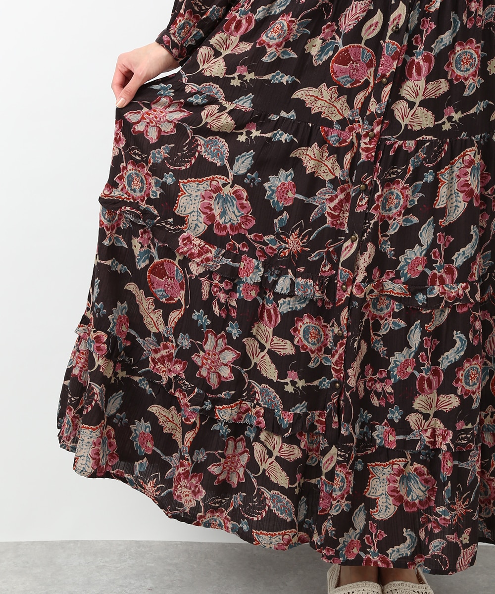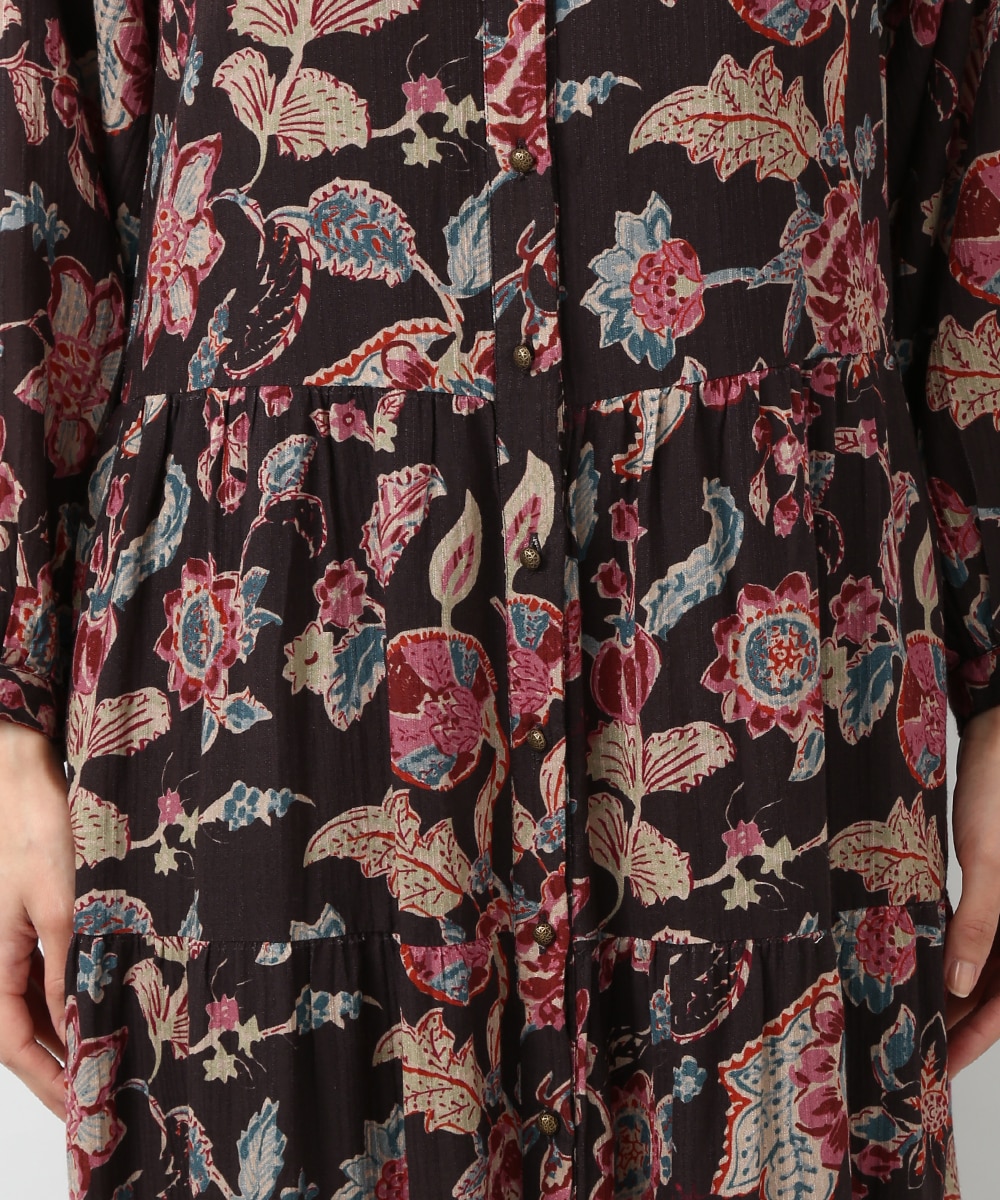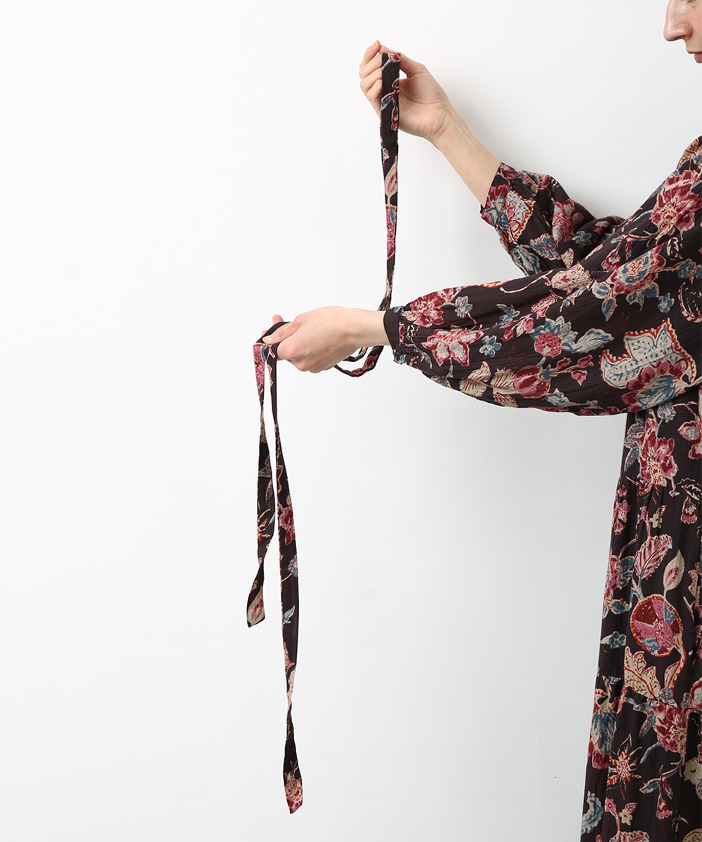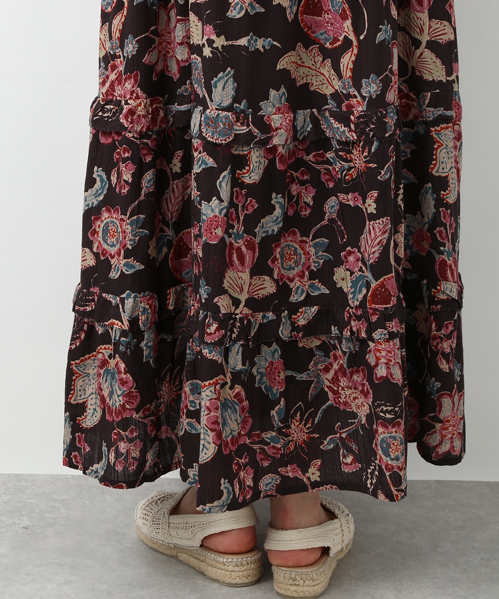 ブラック地にピンクを効かせたボタニカルプリントが目を引くロングワンピース。軽やかな素材で動きのあるシルエットが楽しめ、リラックス感がありながらも上品に着られるのがポイント。フラットシューズを合わせて軽やかにまとめた、抜け感のある着こなしもおすすめです。