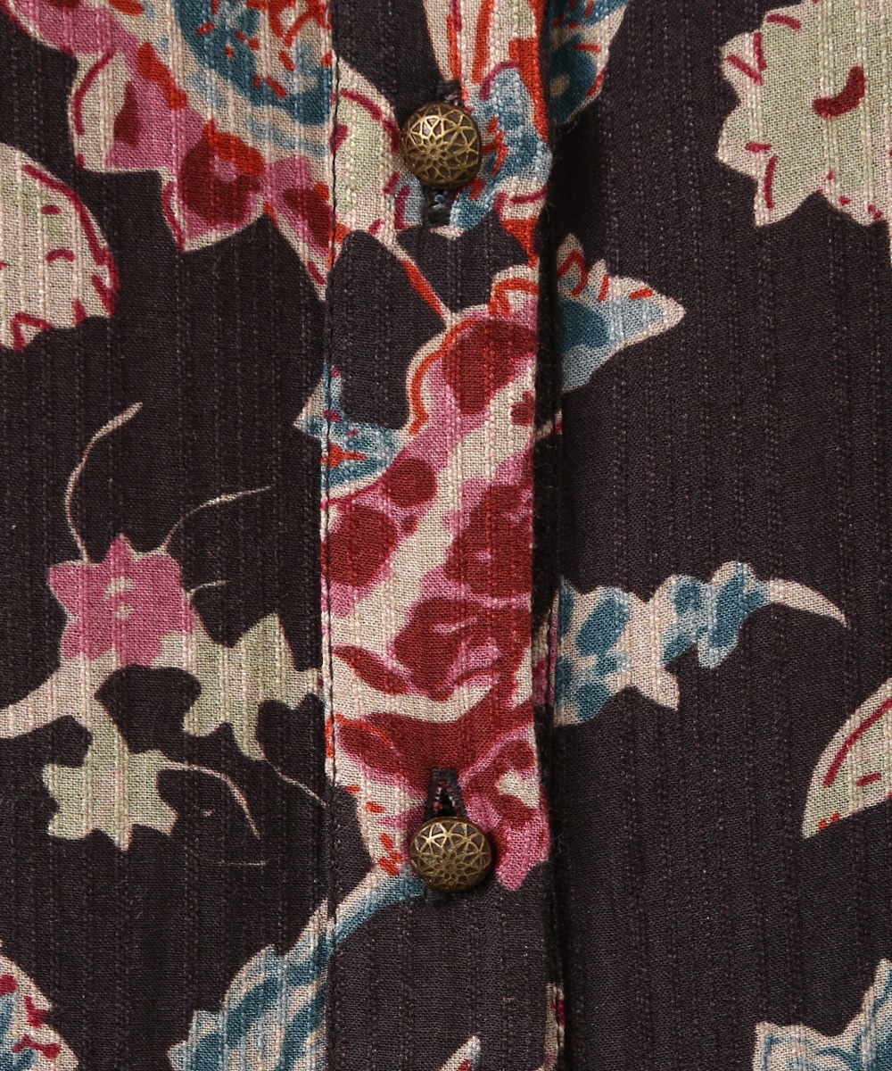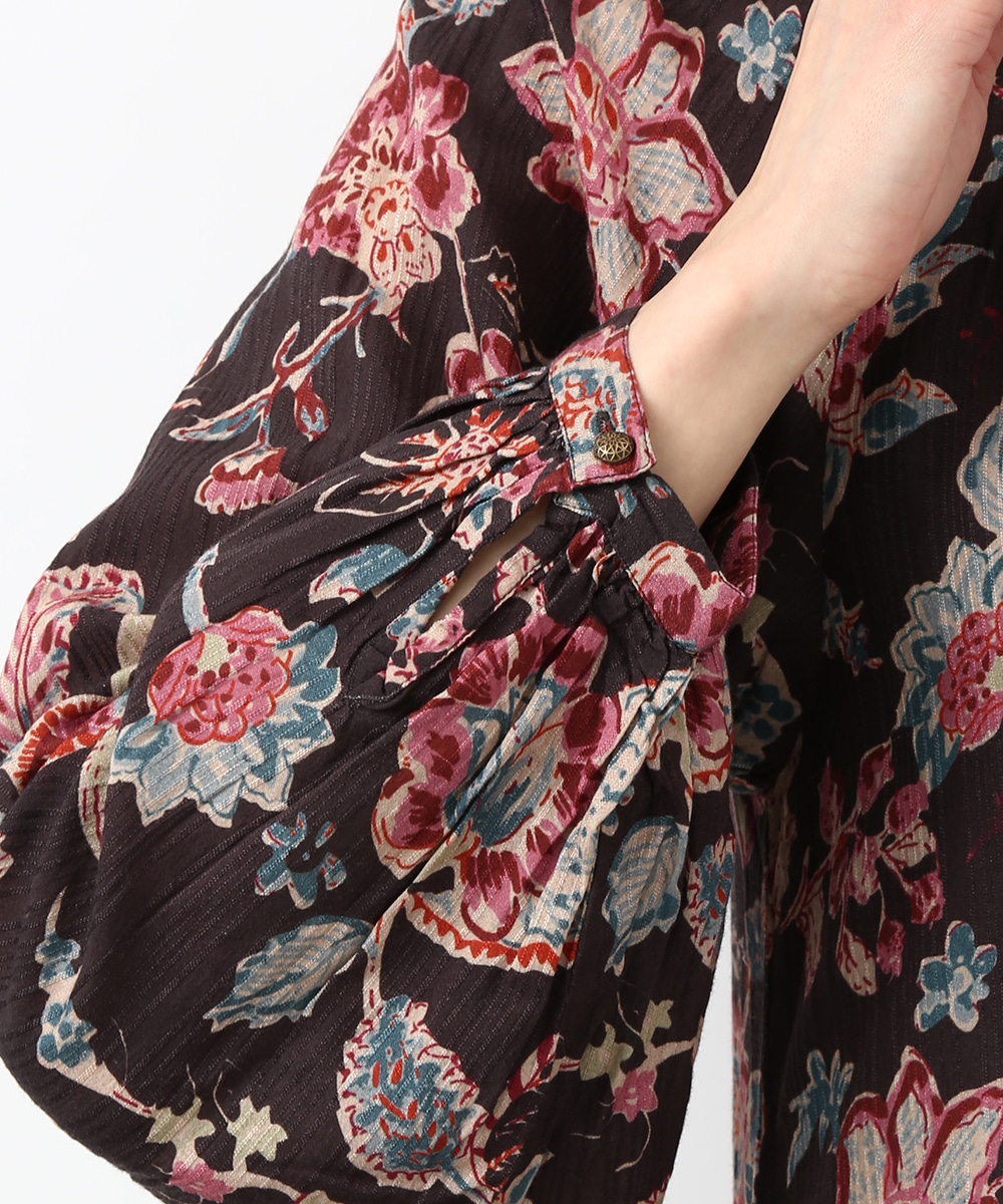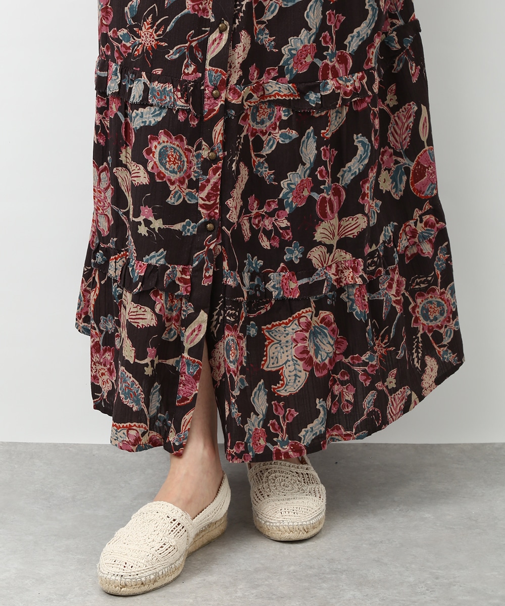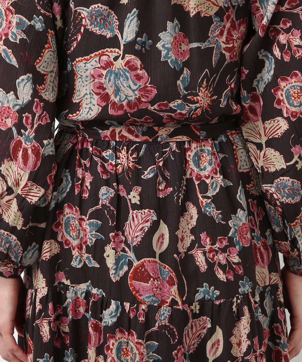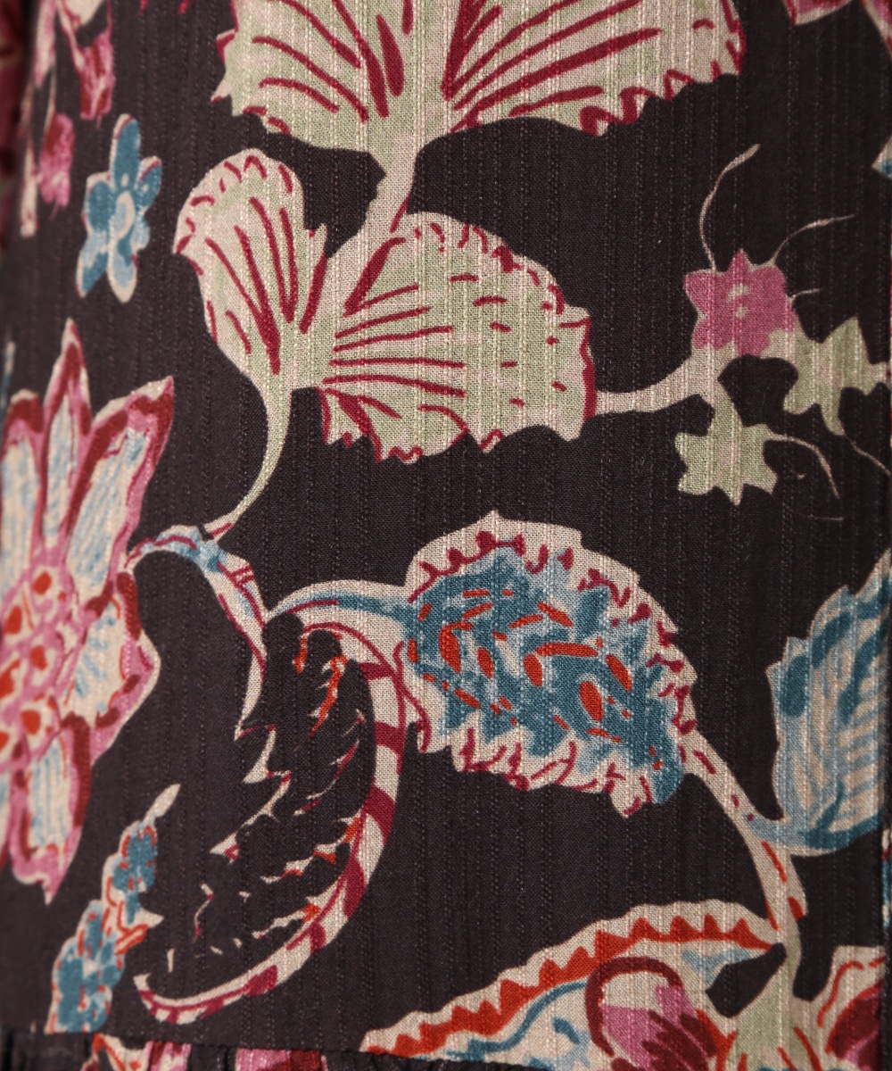 ブラック地にピンクを効かせたボタニカルプリントが目を引くロングワンピース。軽やかな素材で動きのあるシルエットが楽しめ、リラックス感がありながらも上品に着られるのがポイント。フラットシューズを合わせて軽やかにまとめた、抜け感のある着こなしもおすすめです。