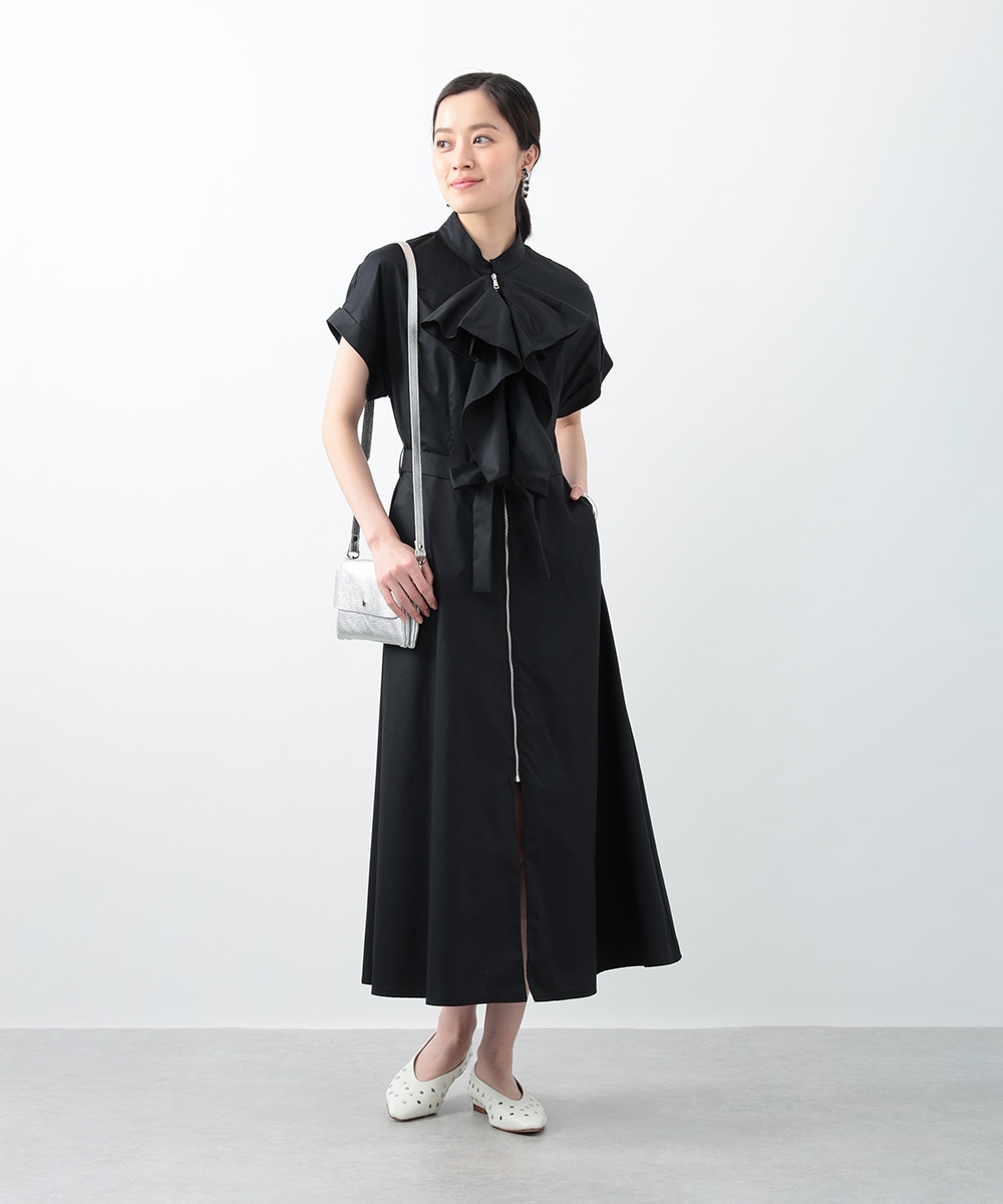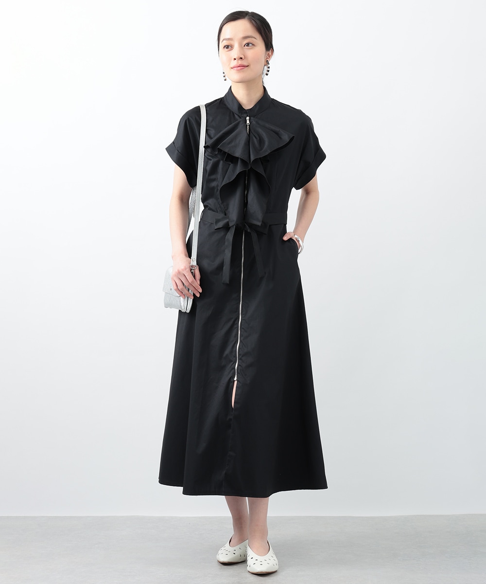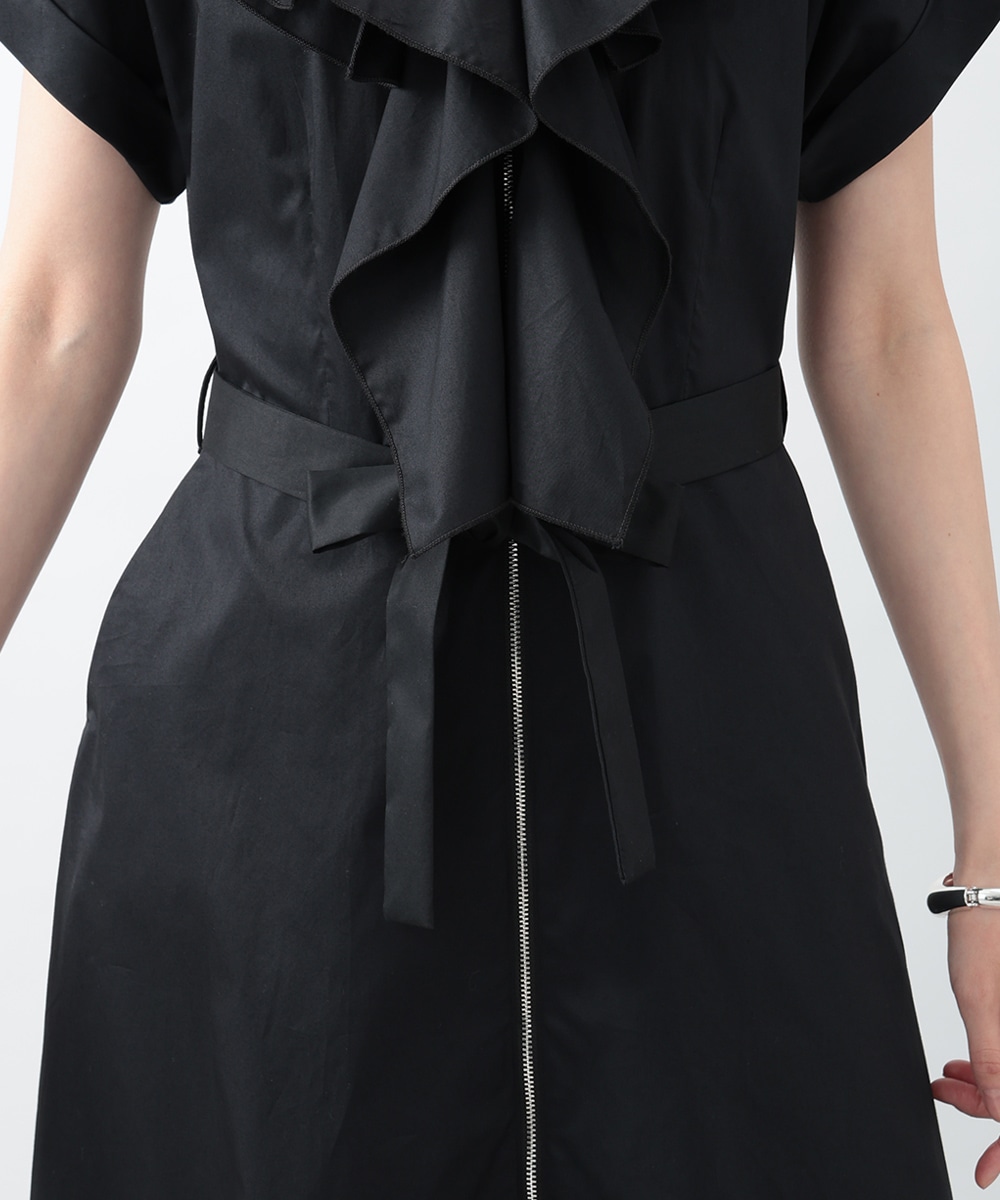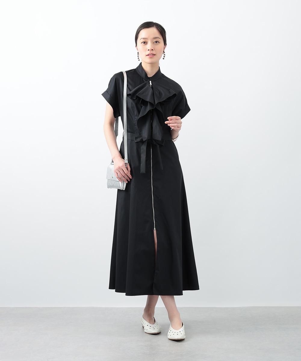 フロントのフリルが華やかなアクセントになるワンピース。エッジの効いたフロントZIP仕様で着脱もスムーズに行えます。ウエストのリボンは取り外しでき、気分やシーンに合わせたスタイリングが可能。休日のお出かけやちょっとしたお呼ばれシーンにも活躍するアイテムです。