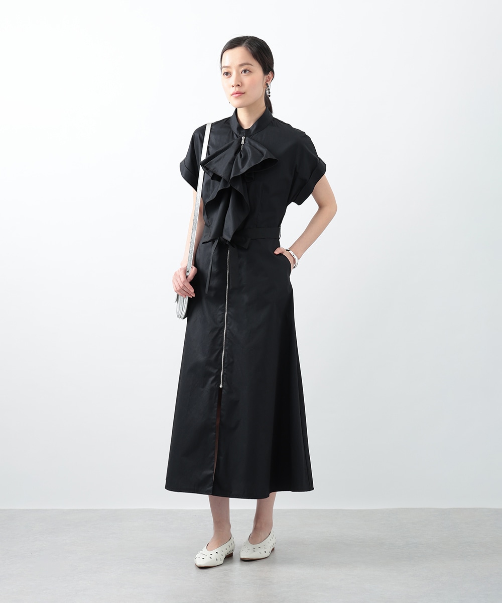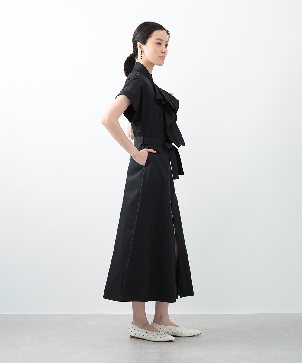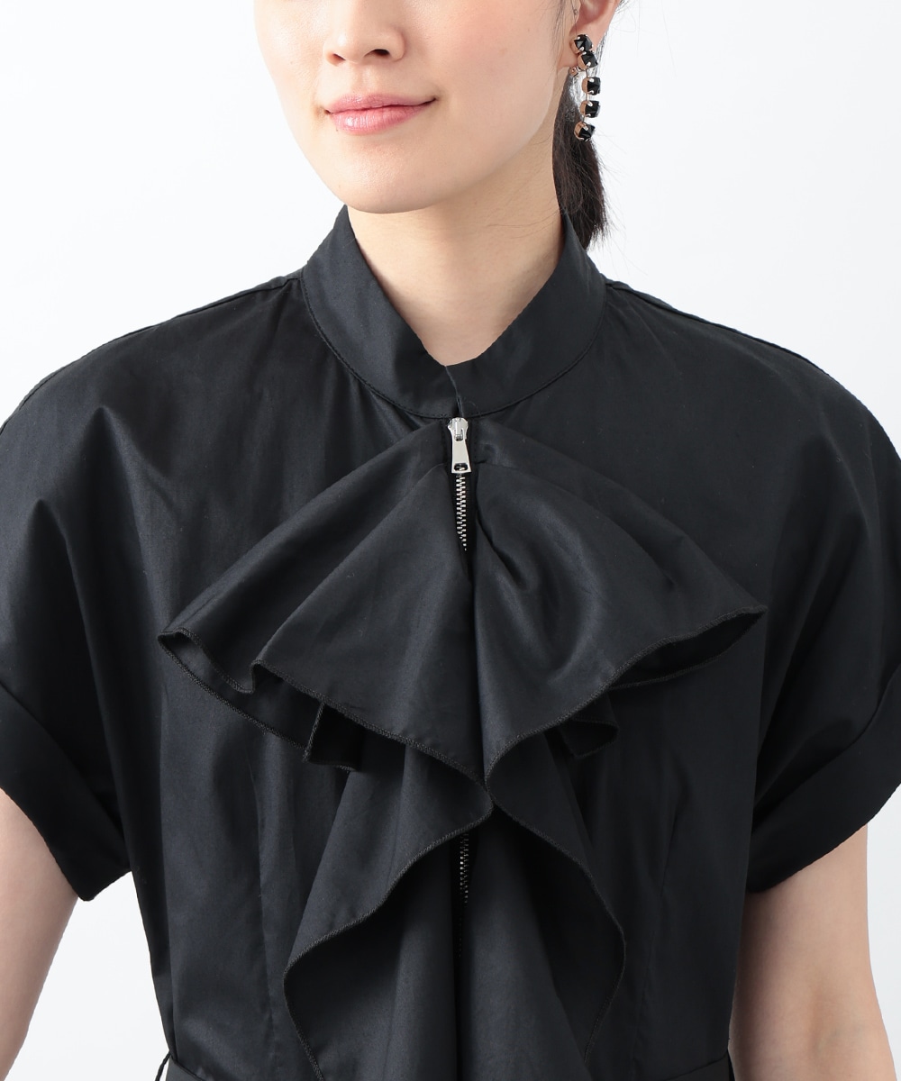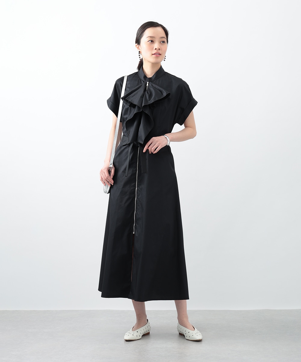 フロントのフリルが華やかなアクセントになるワンピース。エッジの効いたフロントZIP仕様で着脱もスムーズに行えます。ウエストのリボンは取り外しでき、気分やシーンに合わせたスタイリングが可能。休日のお出かけやちょっとしたお呼ばれシーンにも活躍するアイテムです。