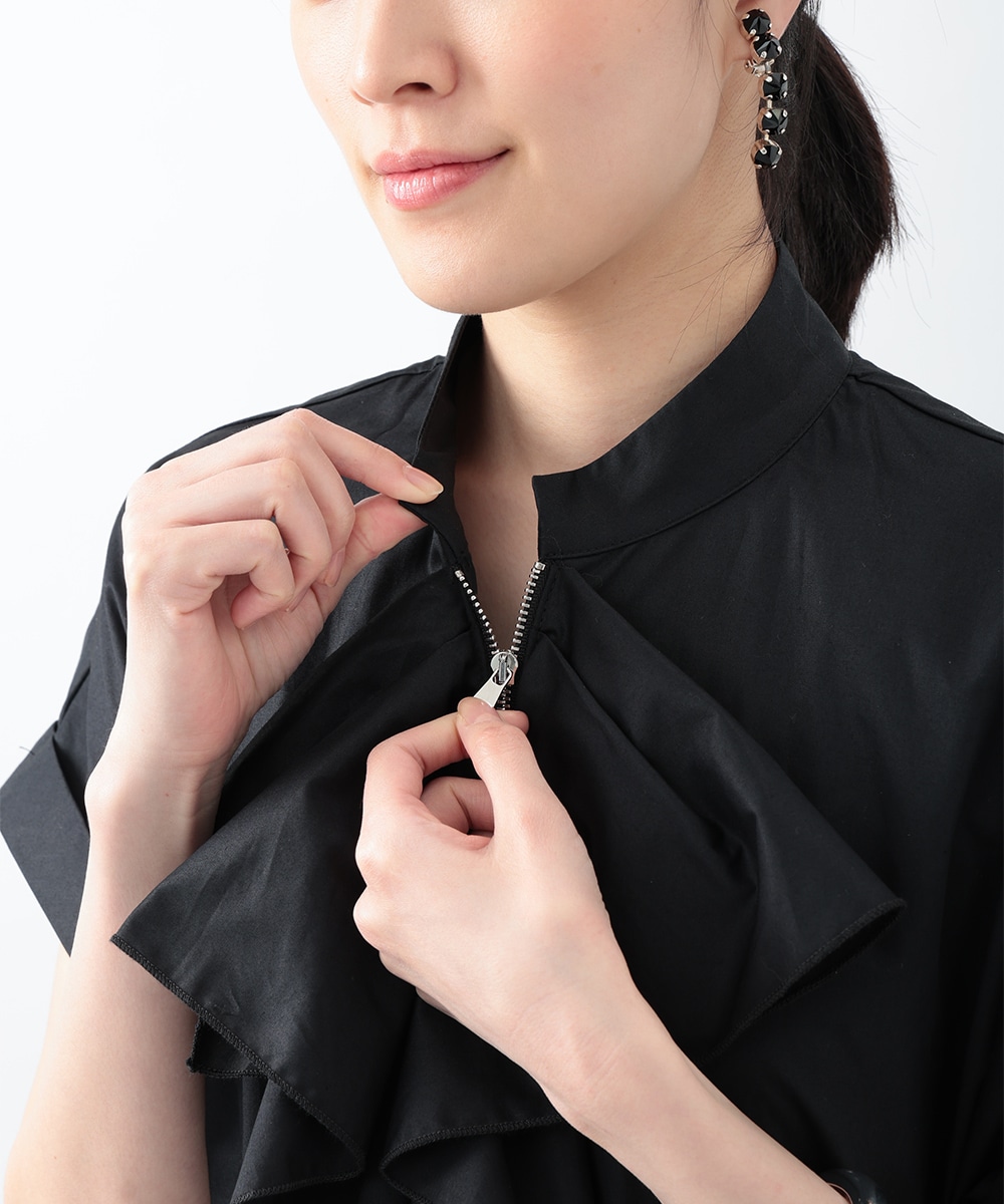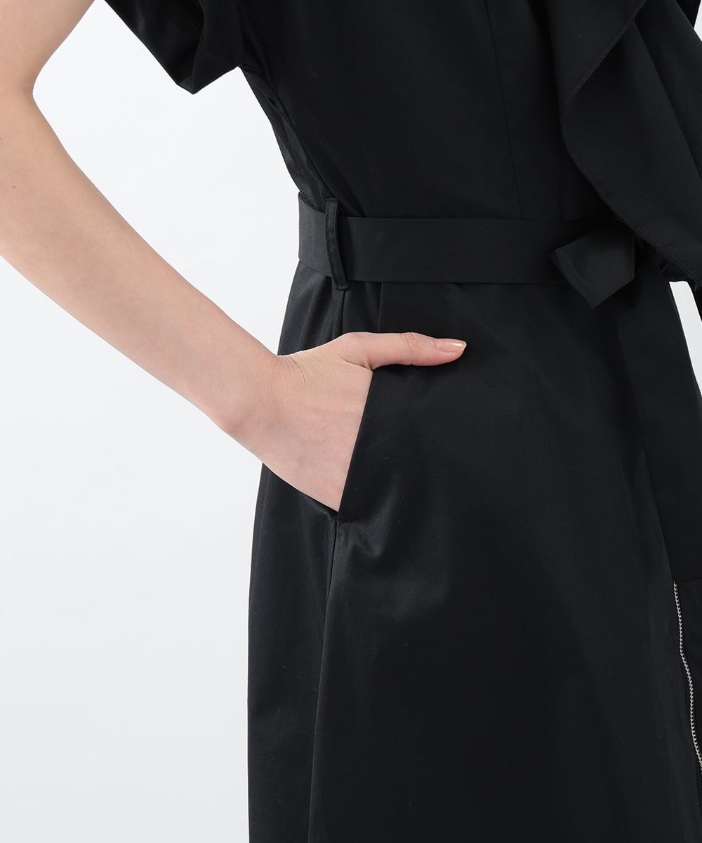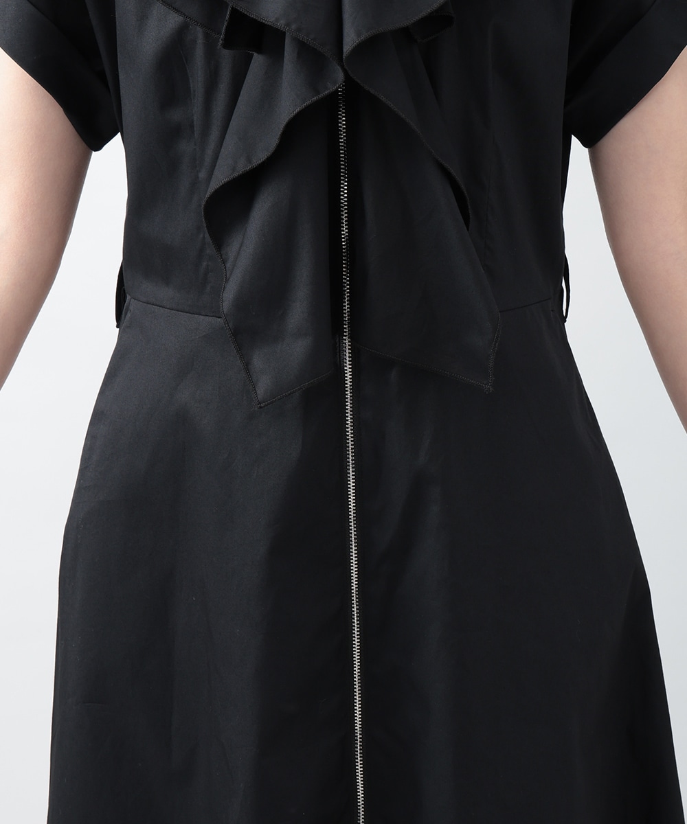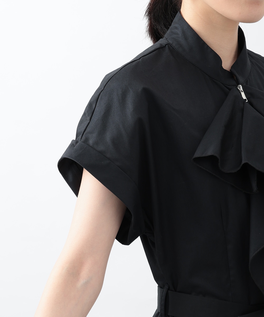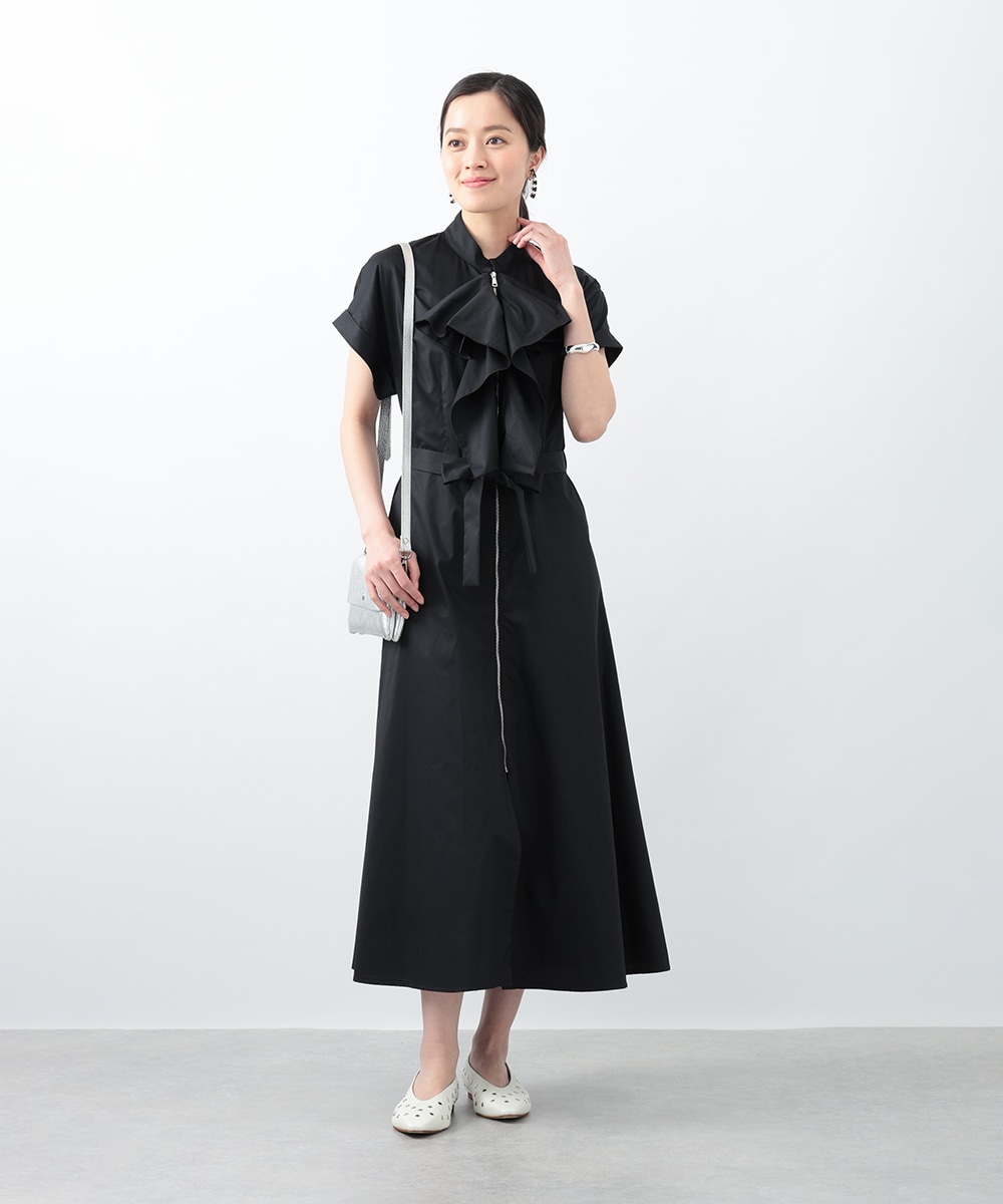 フロントのフリルが華やかなアクセントになるワンピース。エッジの効いたフロントZIP仕様で着脱もスムーズに行えます。ウエストのリボンは取り外しでき、気分やシーンに合わせたスタイリングが可能。休日のお出かけやちょっとしたお呼ばれシーンにも活躍するアイテムです。