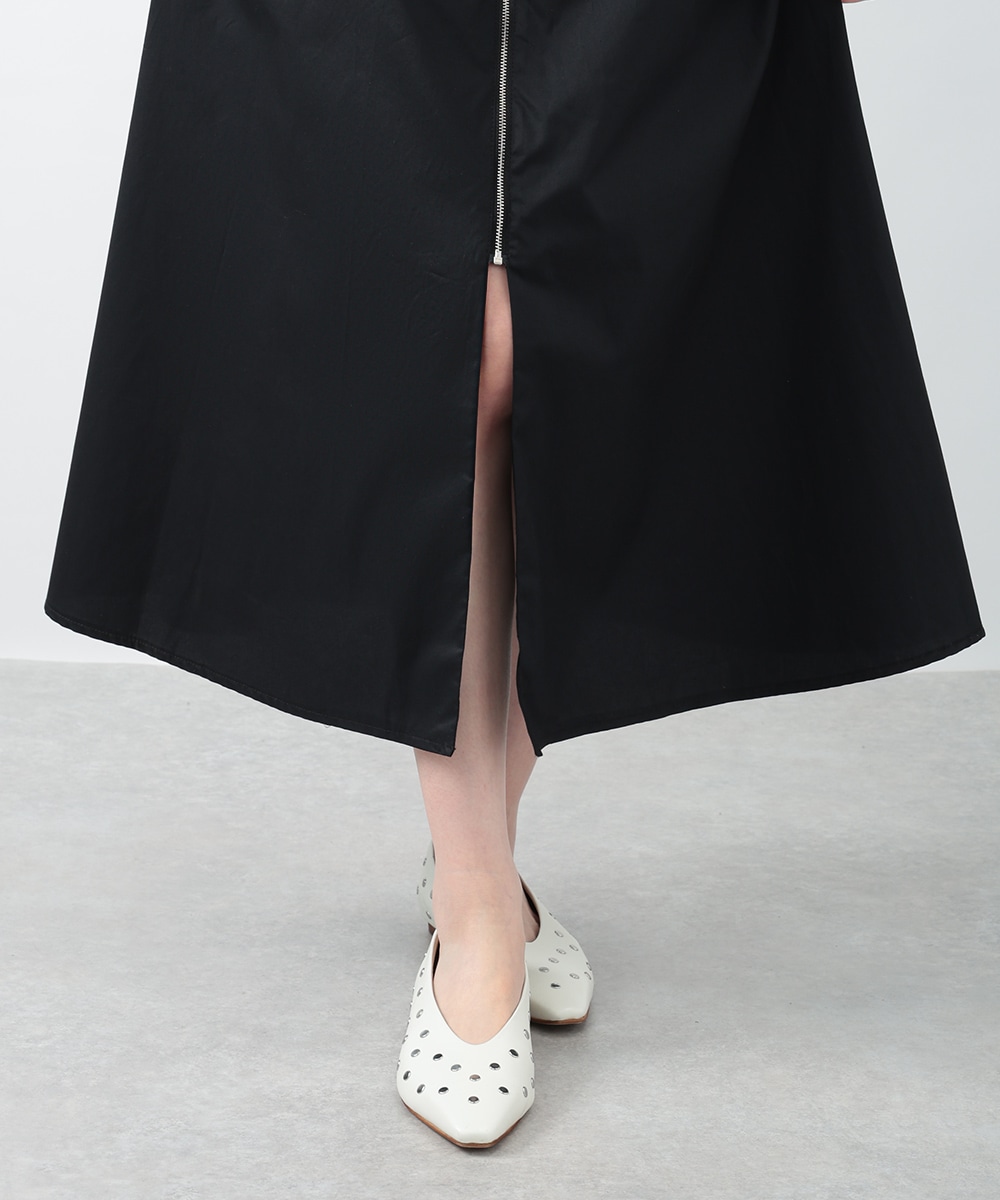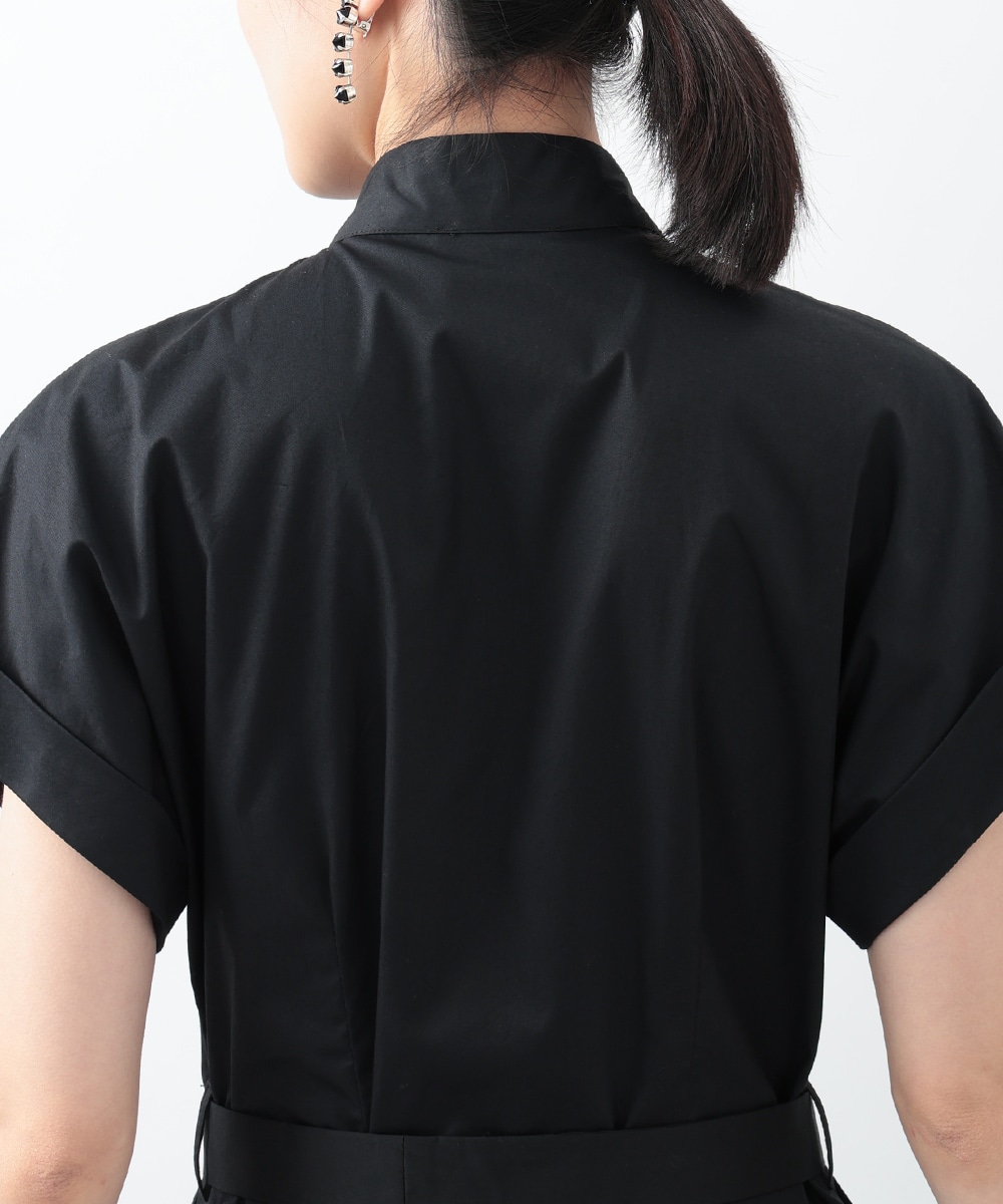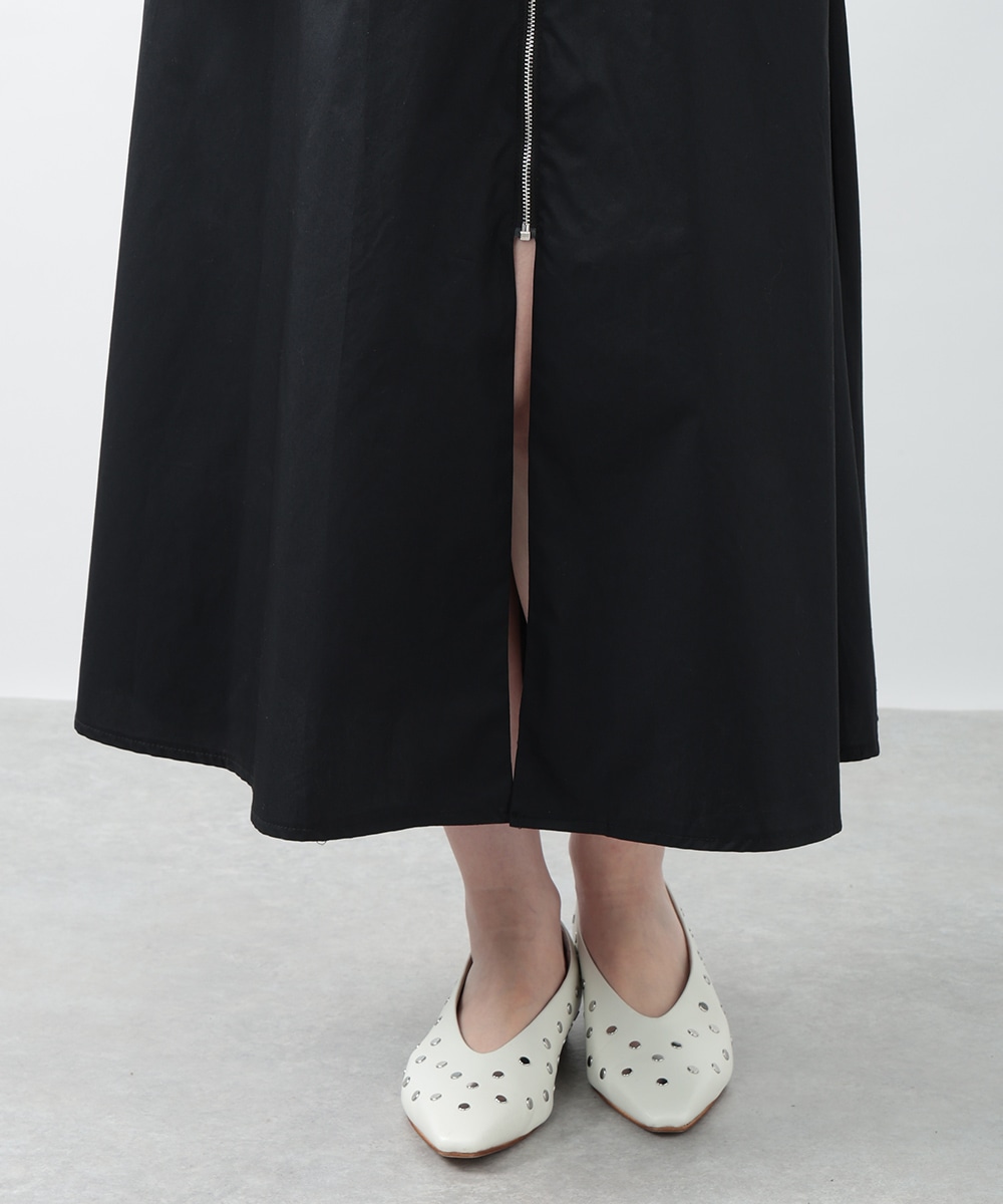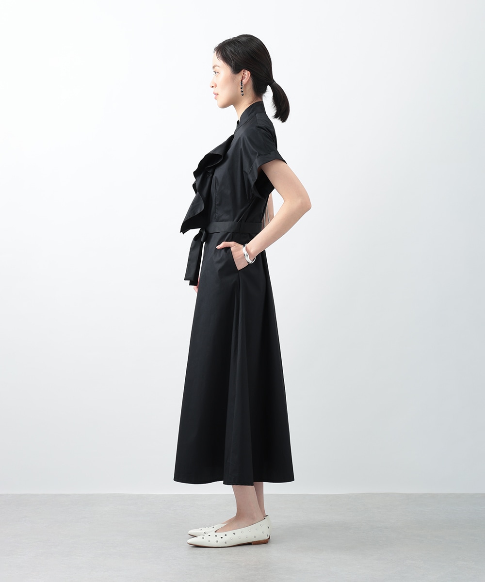 フロントのフリルが華やかなアクセントになるワンピース。エッジの効いたフロントZIP仕様で着脱もスムーズに行えます。ウエストのリボンは取り外しでき、気分やシーンに合わせたスタイリングが可能。休日のお出かけやちょっとしたお呼ばれシーンにも活躍するアイテムです。
