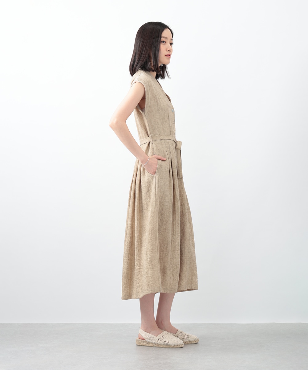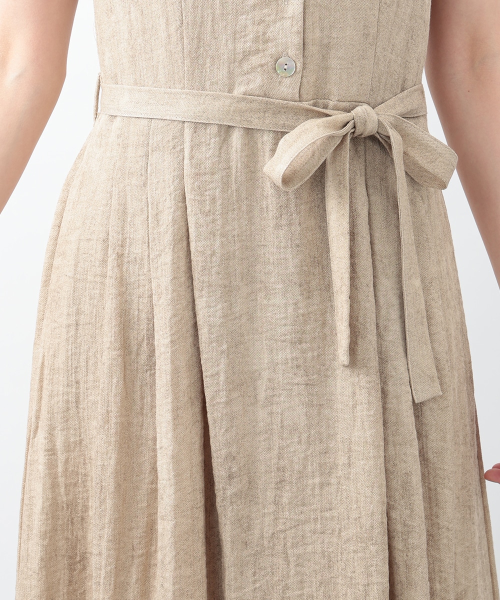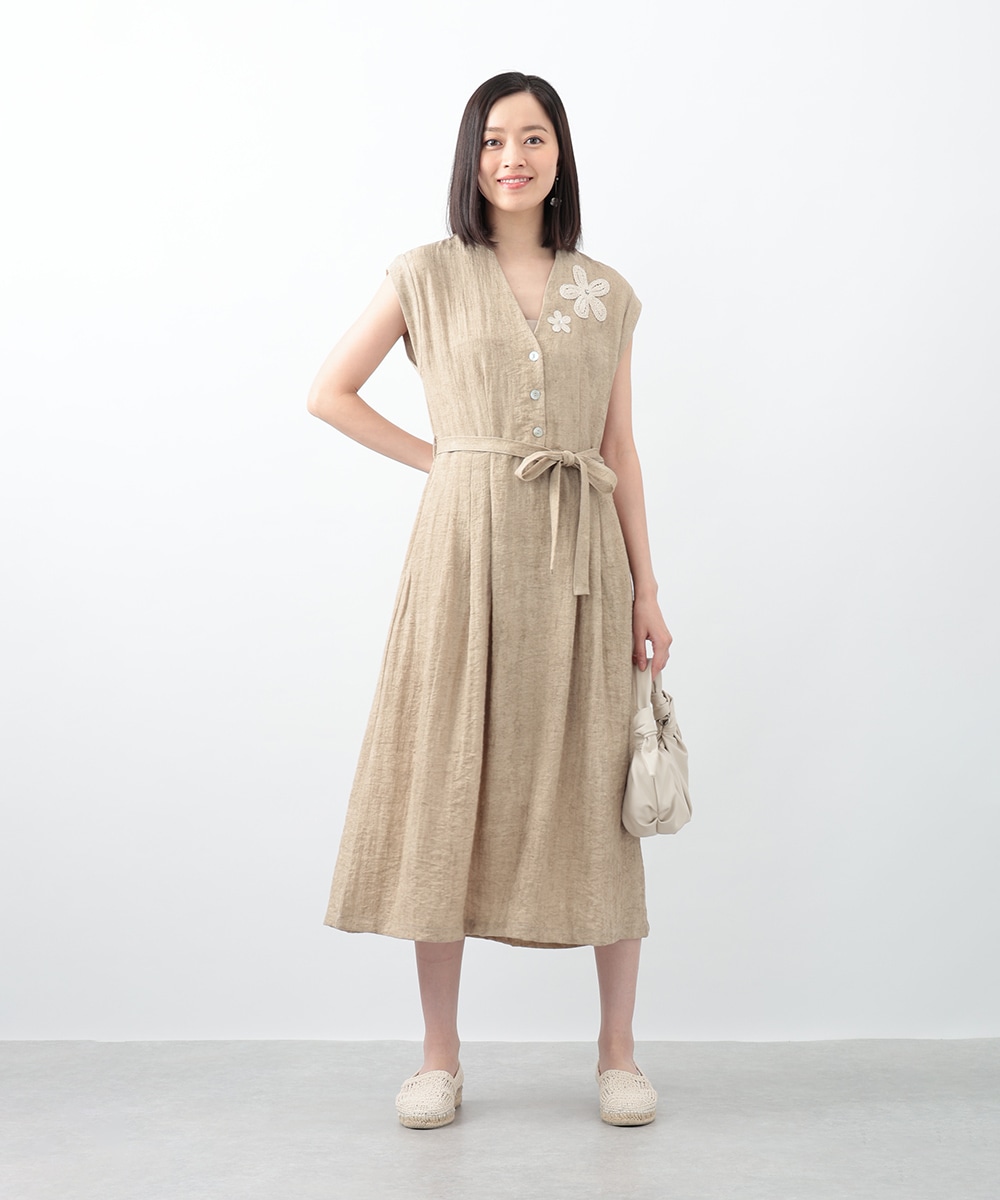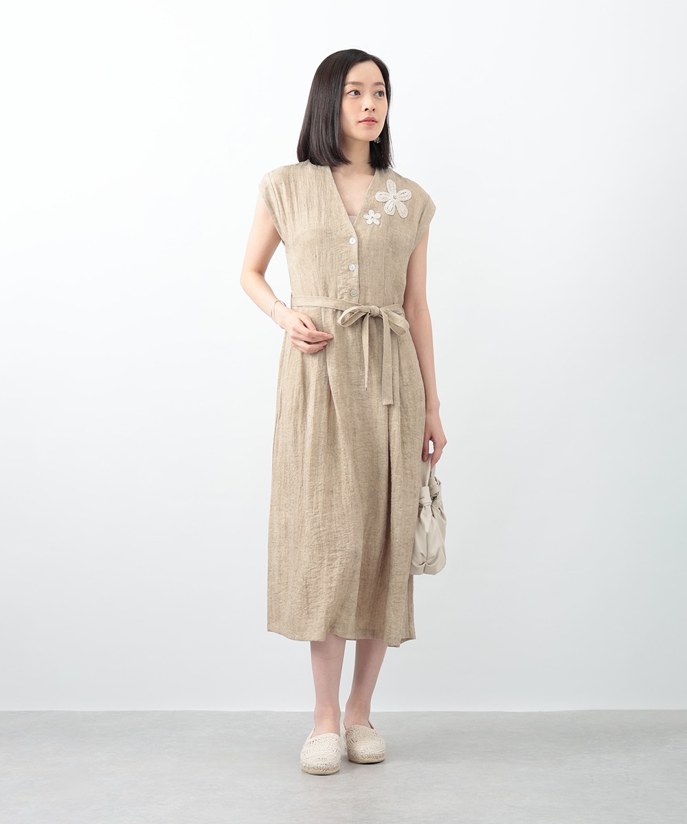 通気性に優れたリネン混素材が軽やかな着心地を演出するワンピース。深めに切り込まれたVネックのデザインがすっきりとした印象を与えます。付属のリボンでウエストマークできるのも魅力。1枚で着用するのはもちろん、中にカットソーをレイヤードしたスタイリングもおすすめです。