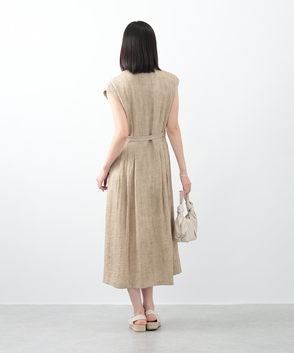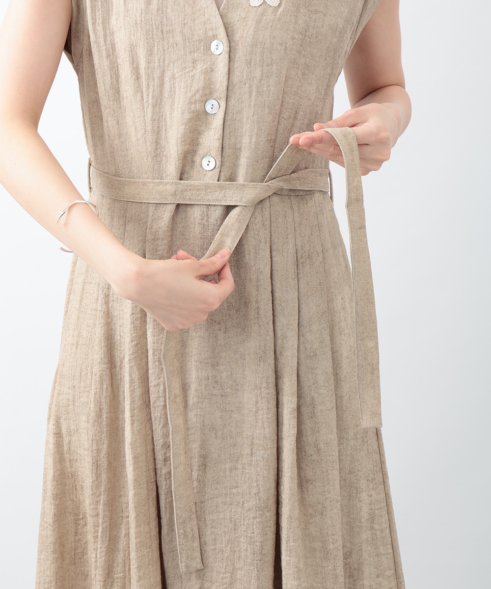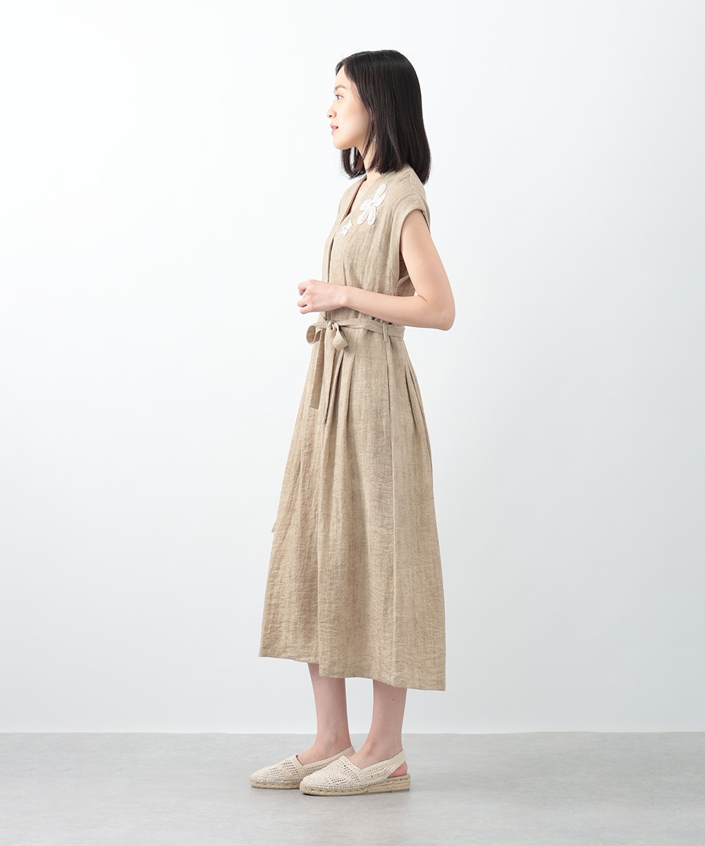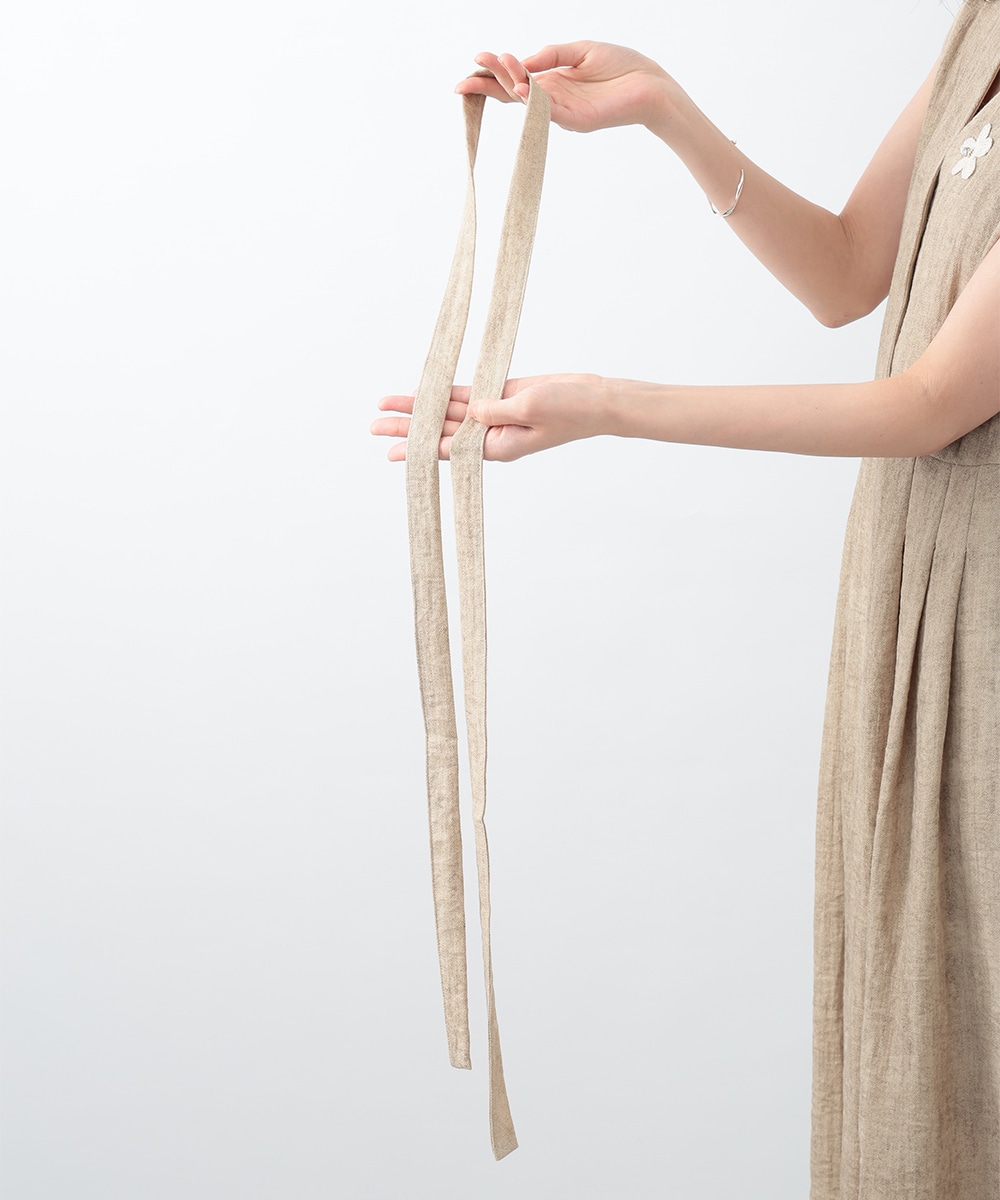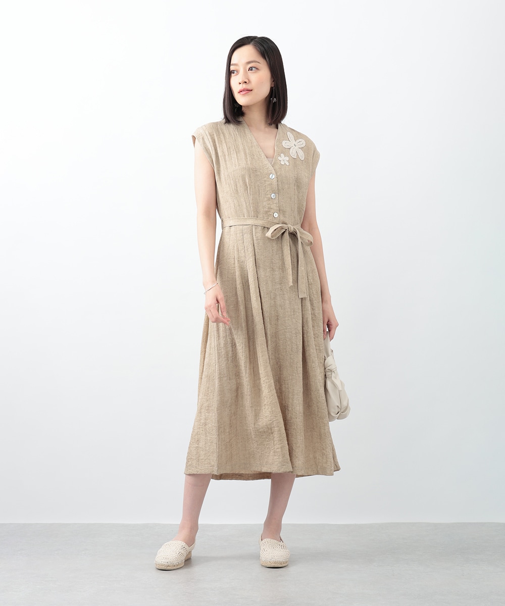 通気性に優れたリネン混素材が軽やかな着心地を演出するワンピース。深めに切り込まれたVネックのデザインがすっきりとした印象を与えます。付属のリボンでウエストマークできるのも魅力。1枚で着用するのはもちろん、中にカットソーをレイヤードしたスタイリングもおすすめです。