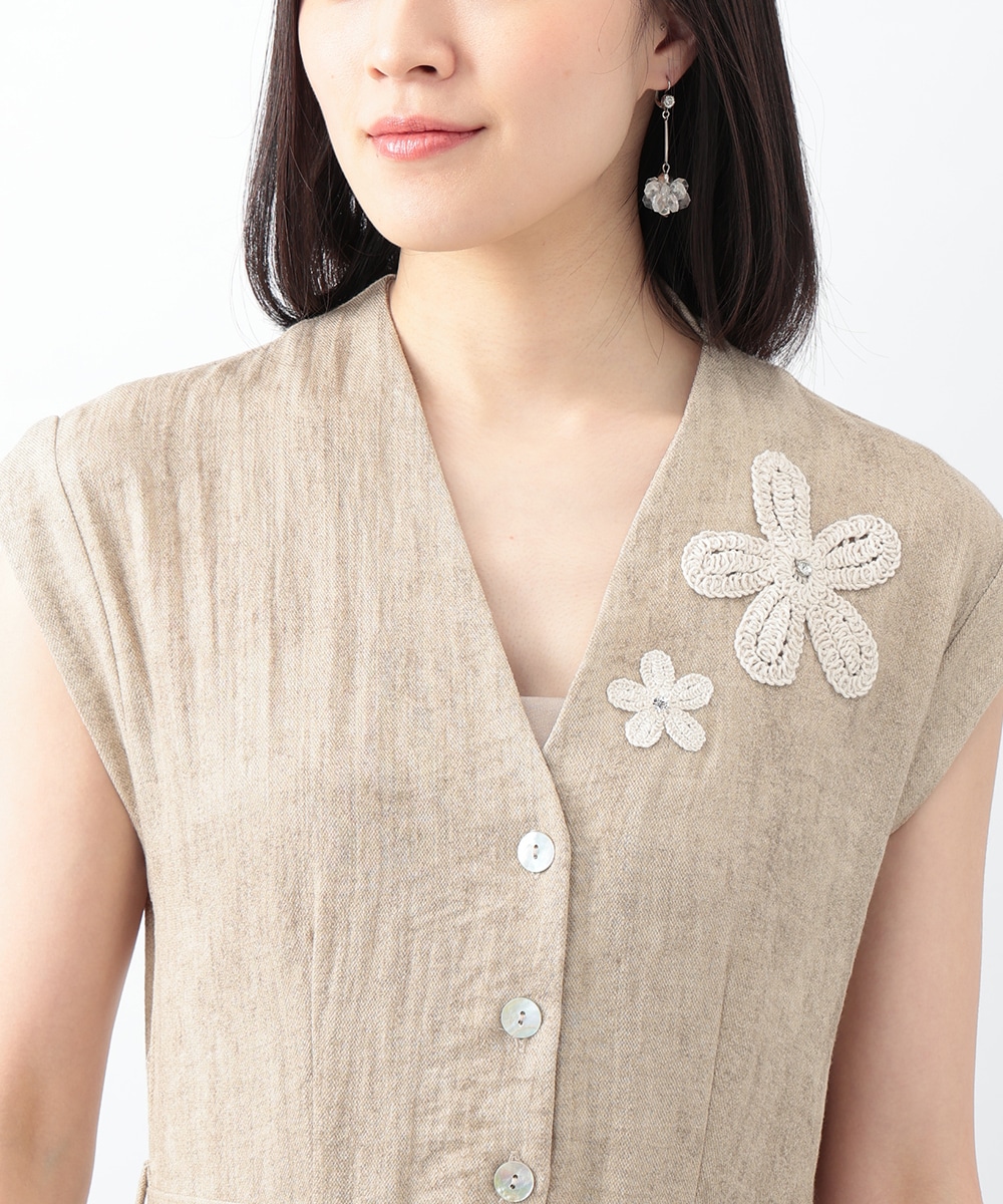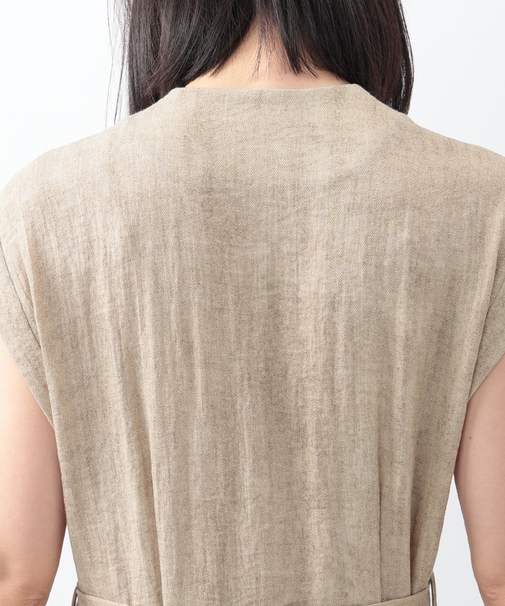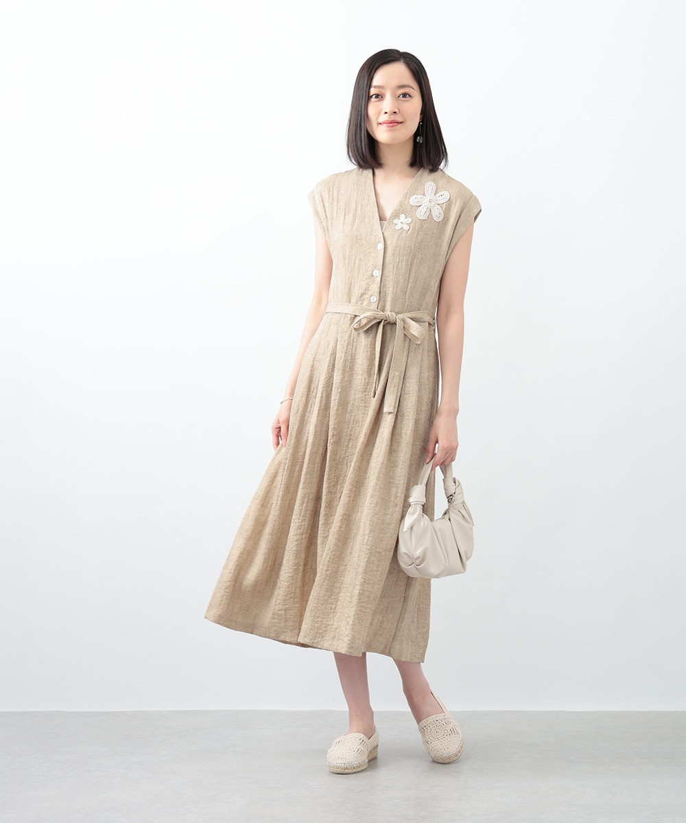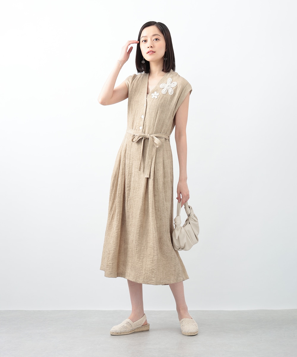 通気性に優れたリネン混素材が軽やかな着心地を演出するワンピース。深めに切り込まれたVネックのデザインがすっきりとした印象を与えます。付属のリボンでウエストマークできるのも魅力。1枚で着用するのはもちろん、中にカットソーをレイヤードしたスタイリングもおすすめです。