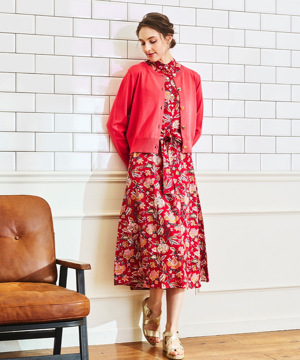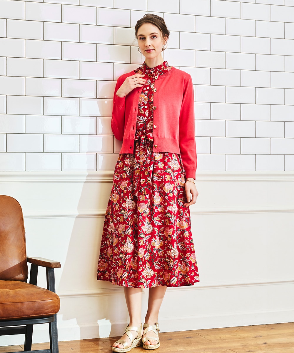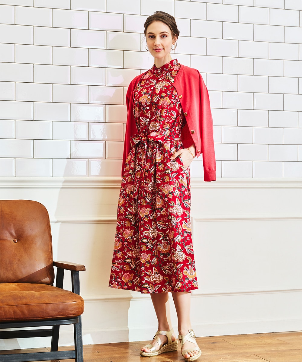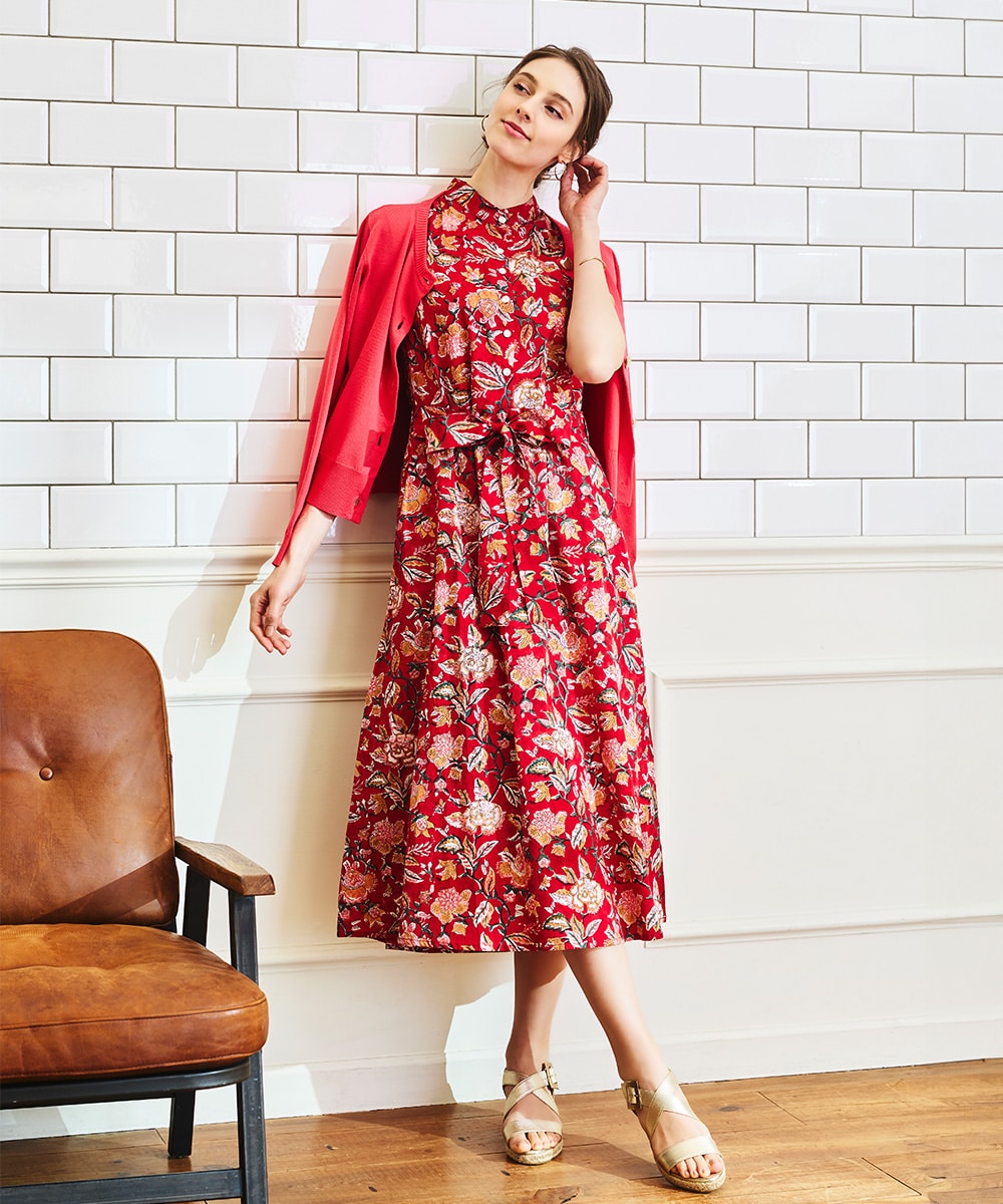 手描き風のタッチと目を引くカラーリングのコンビネーションがポイント。ウエストの切り替えからほどよく広がる、女性らしいシルエットに仕上げています。長めの着丈で大人っぽく着こなせ、幅広いシーンで重宝。ウエストマークのアレンジを楽しめる、同素材のリボンベルト付きです。