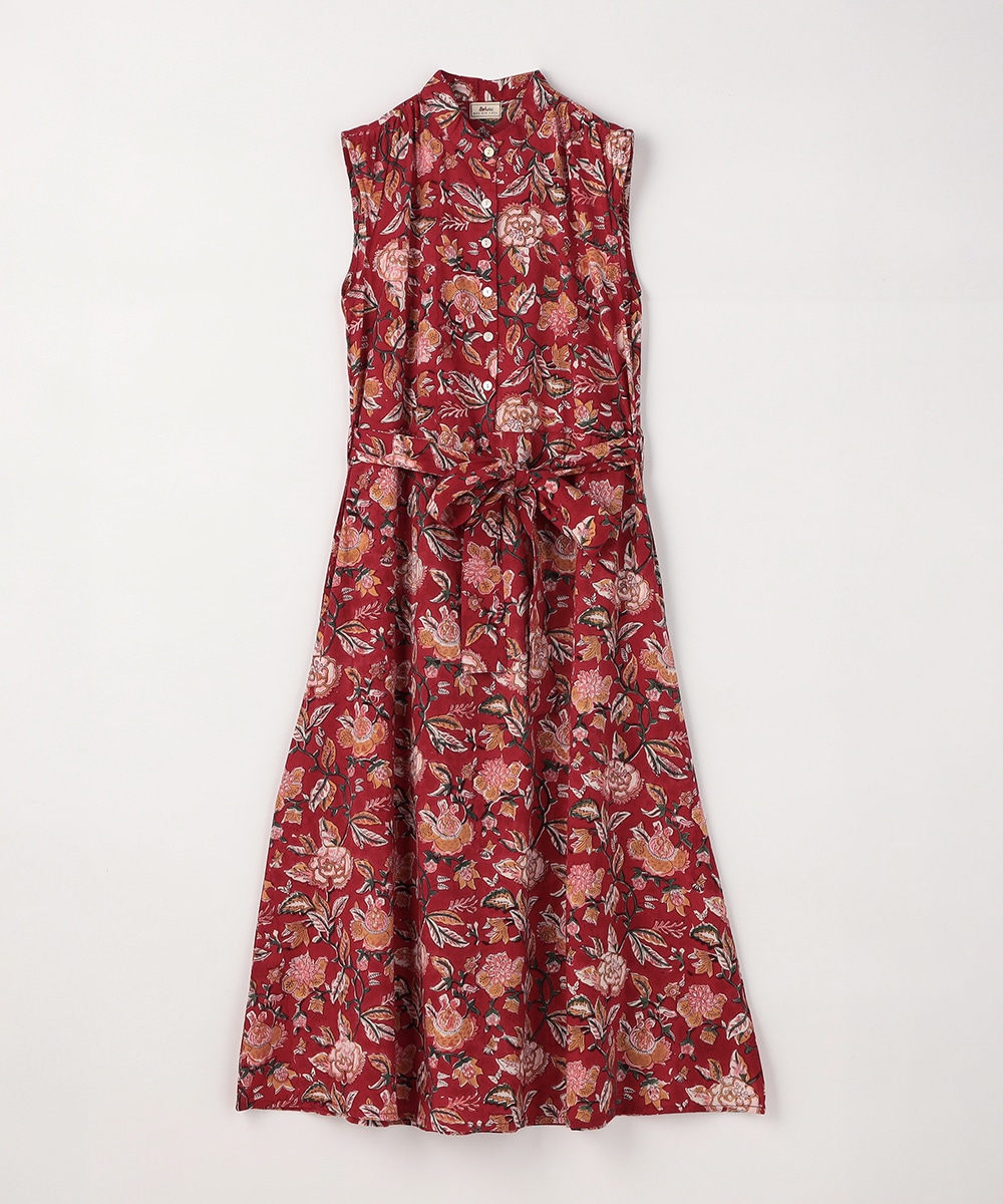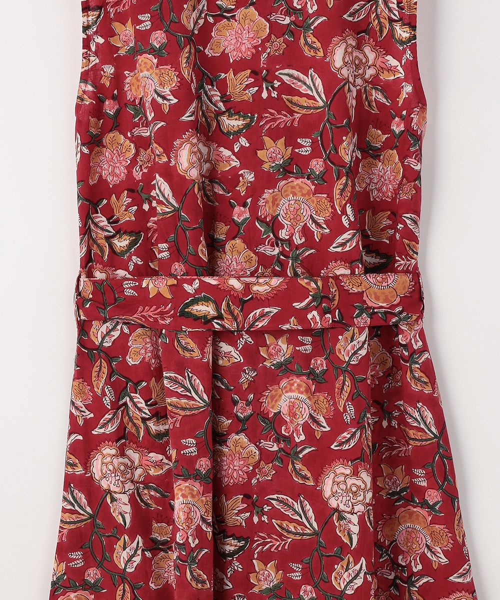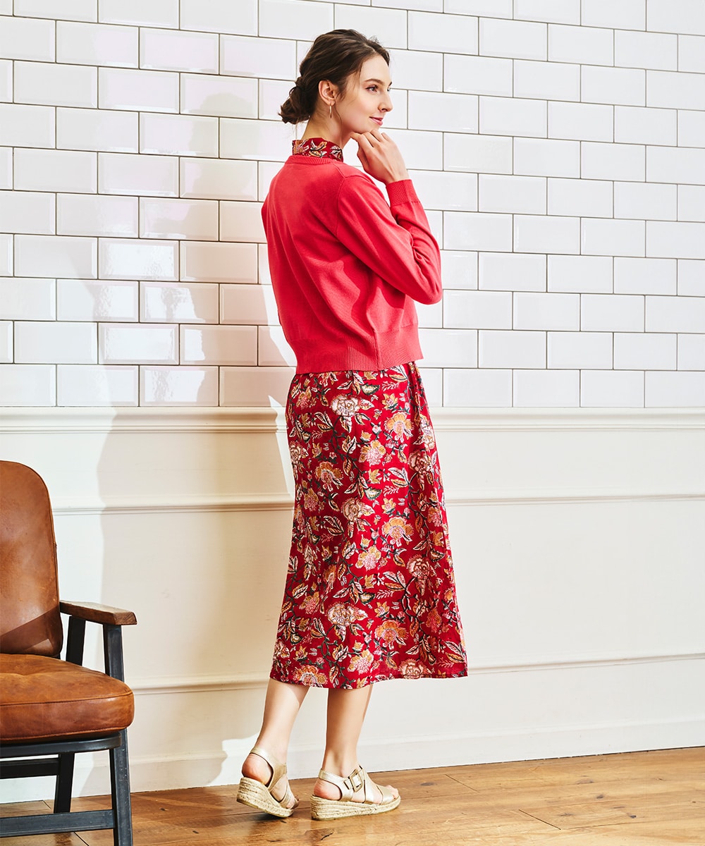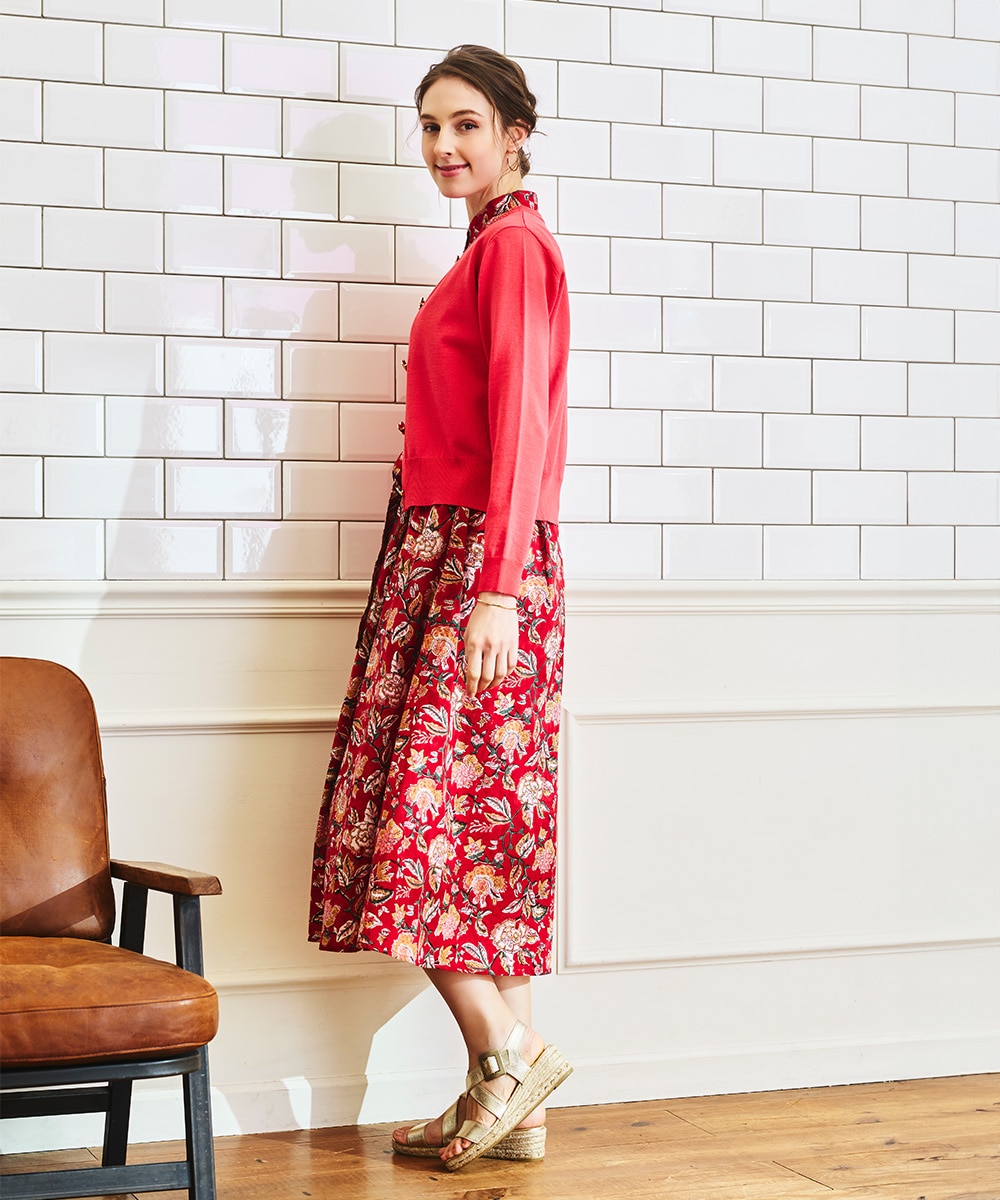 手描き風のタッチと目を引くカラーリングのコンビネーションがポイント。ウエストの切り替えからほどよく広がる、女性らしいシルエットに仕上げています。長めの着丈で大人っぽく着こなせ、幅広いシーンで重宝。ウエストマークのアレンジを楽しめる、同素材のリボンベルト付きです。
