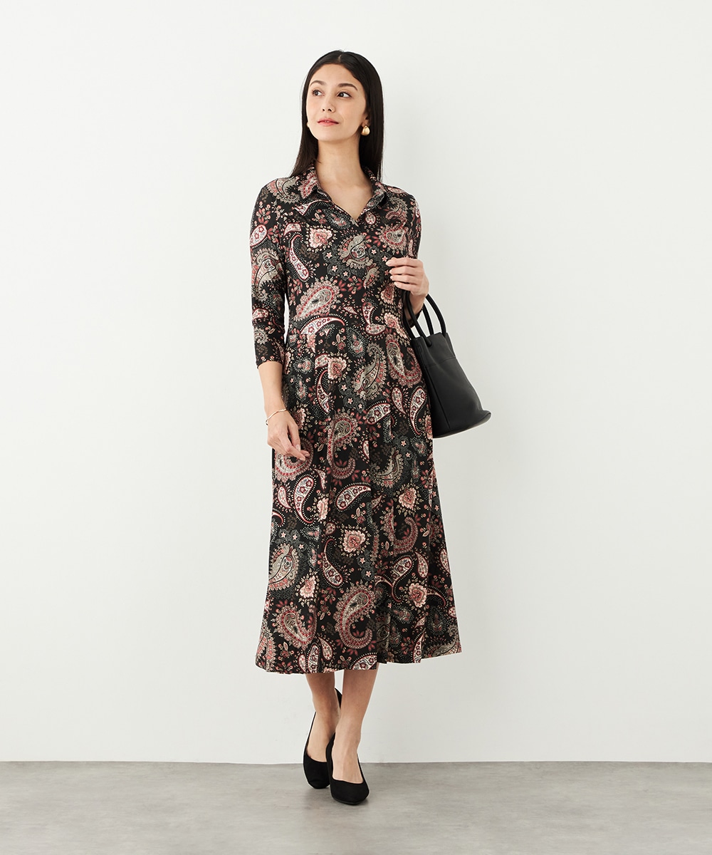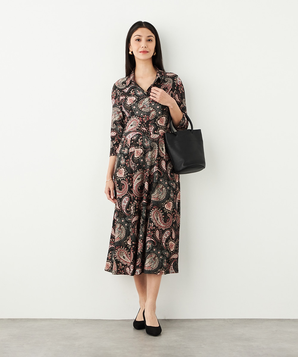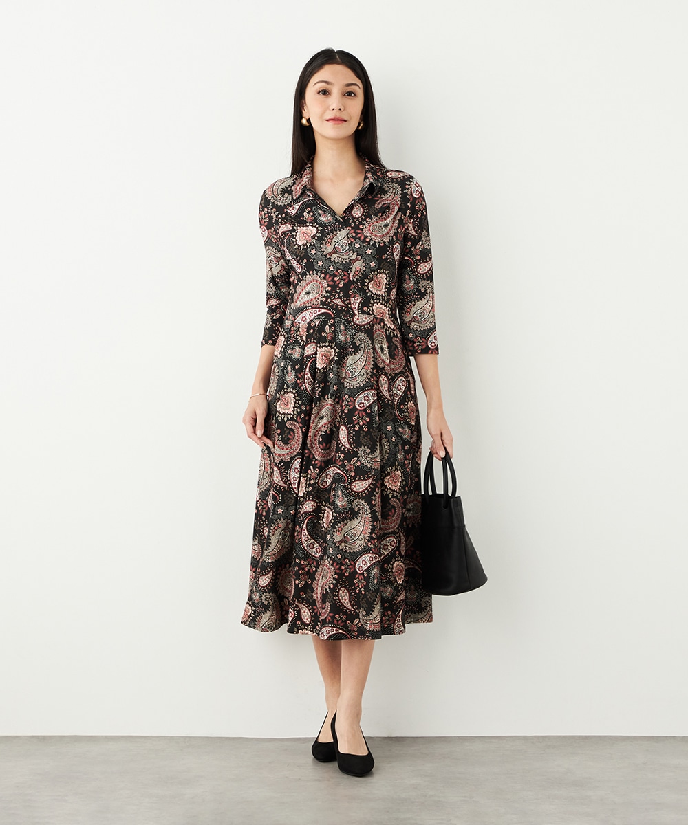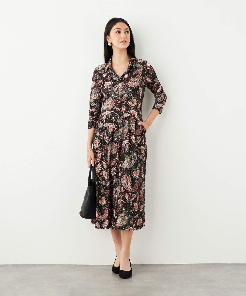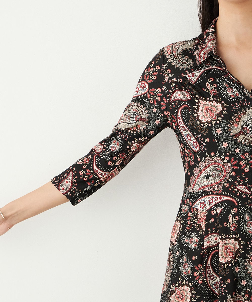 大ぶりの柄を繊細なタッチで描いており、上品な存在感を発揮しています。襟付きのデザインならではのキレイ目感も魅力です。ウエストには切り替えが入ってスタイルがすっきりと見えます。長めの着丈の大人っぽさもポイント。お出かけコーディネートにもぴったりな1枚です。