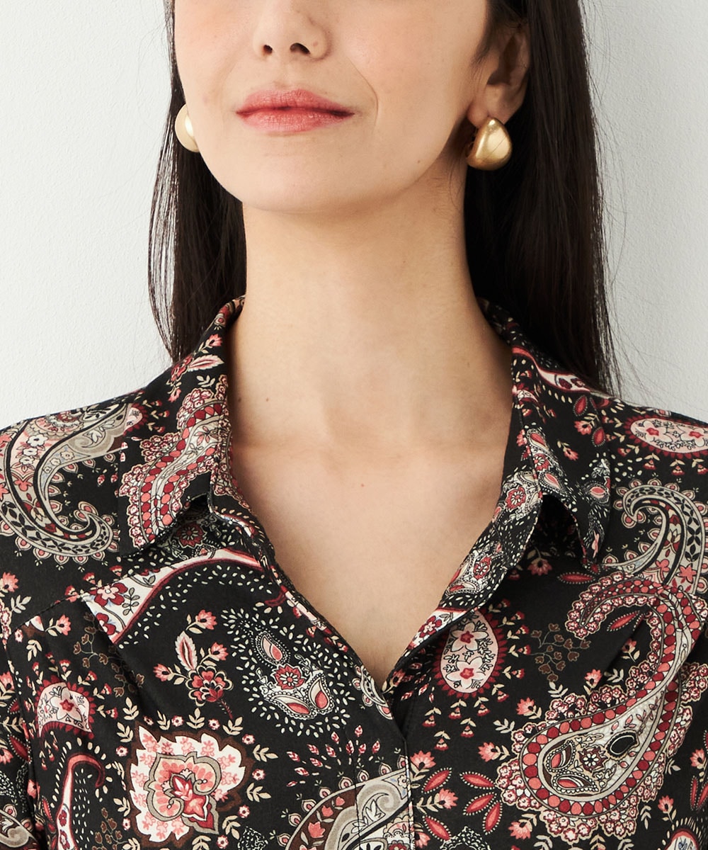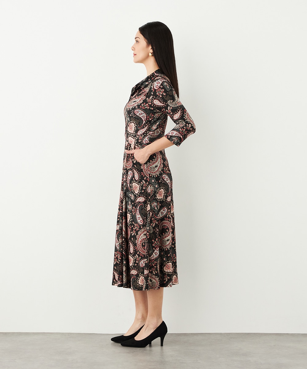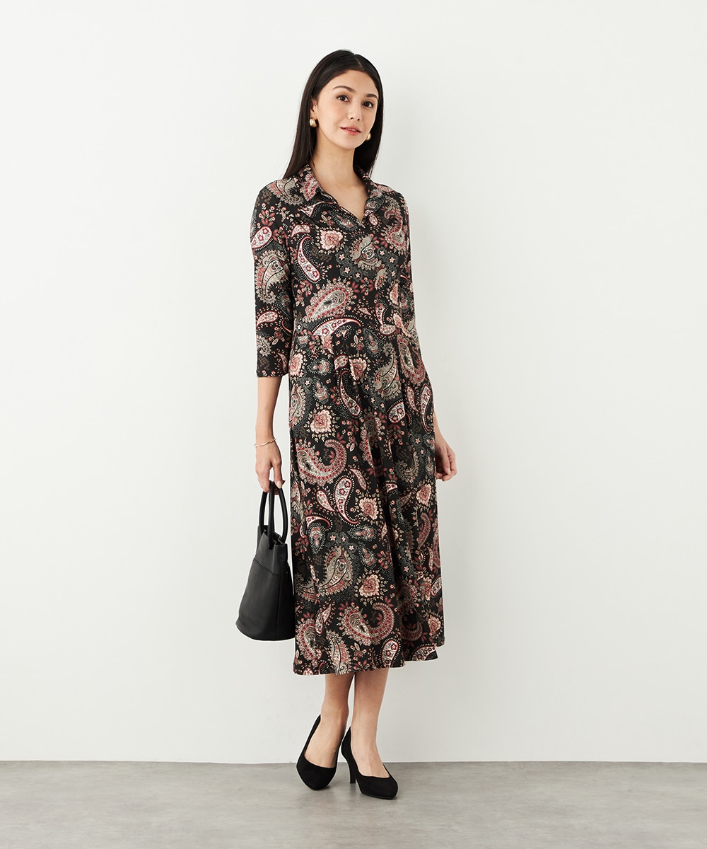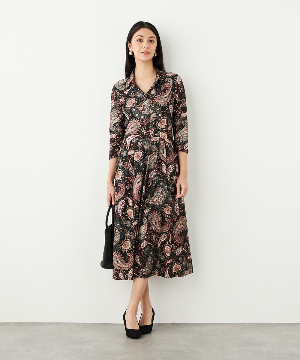 大ぶりの柄を繊細なタッチで描いており、上品な存在感を発揮しています。襟付きのデザインならではのキレイ目感も魅力です。ウエストには切り替えが入ってスタイルがすっきりと見えます。長めの着丈の大人っぽさもポイント。お出かけコーディネートにもぴったりな1枚です。