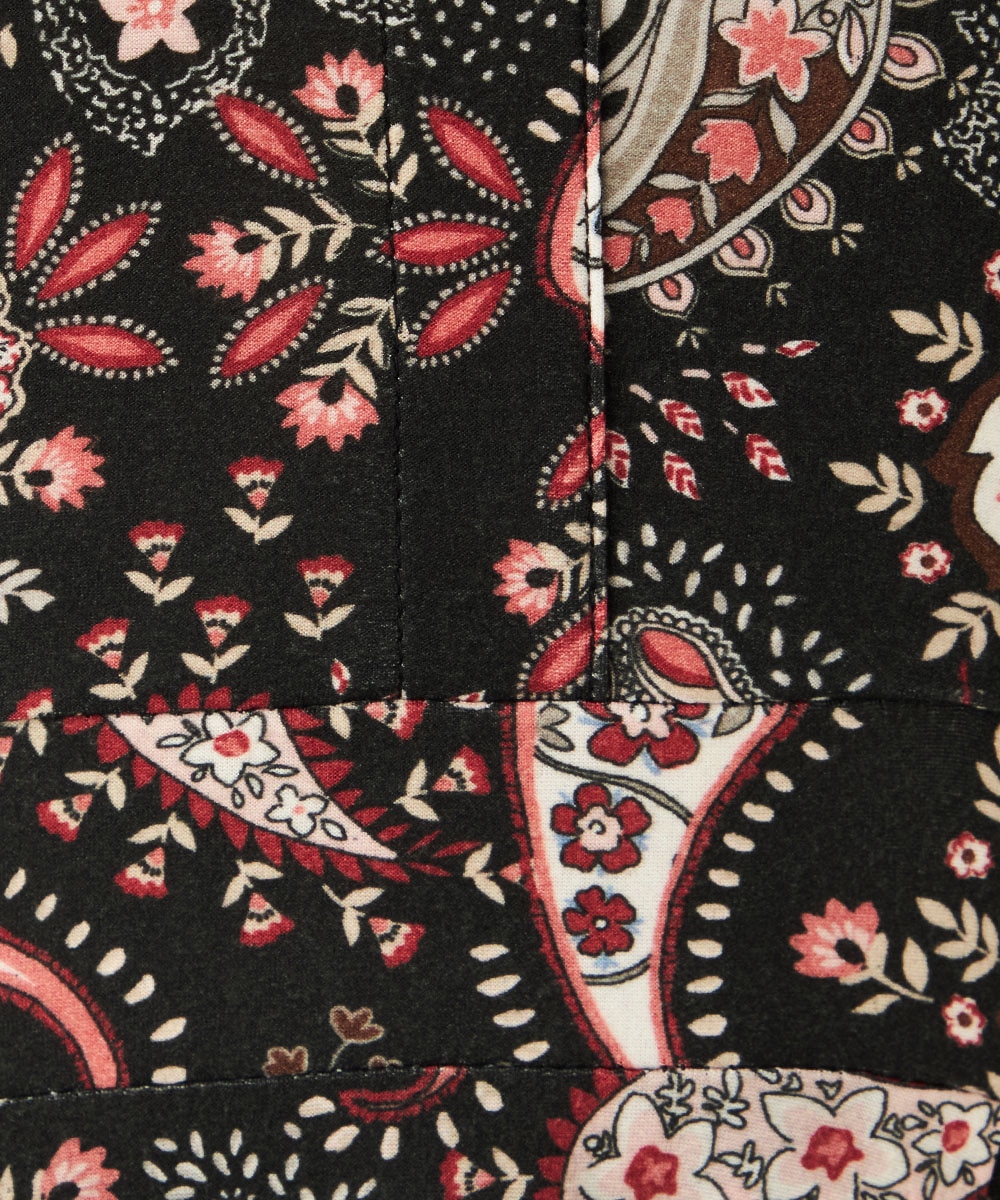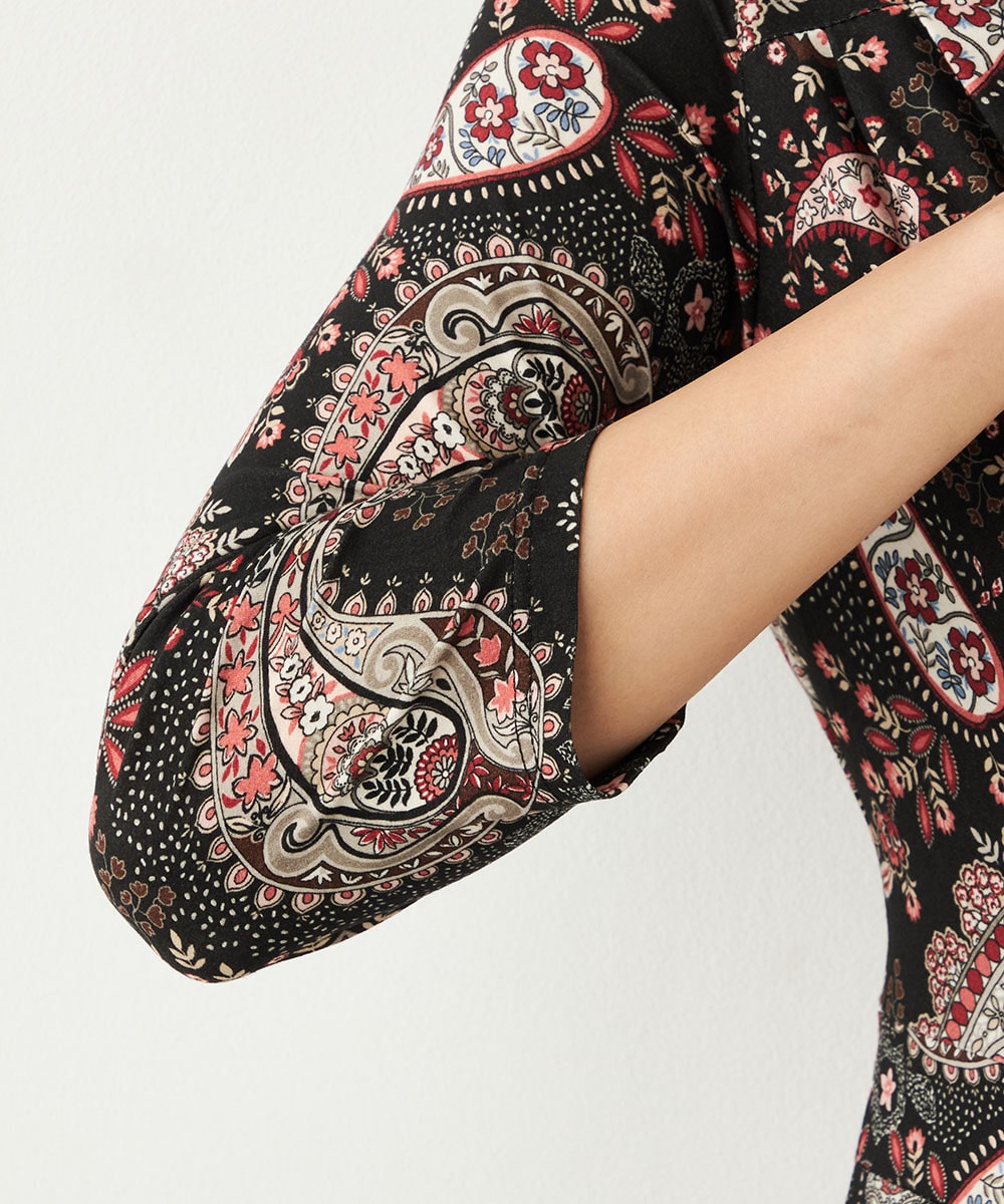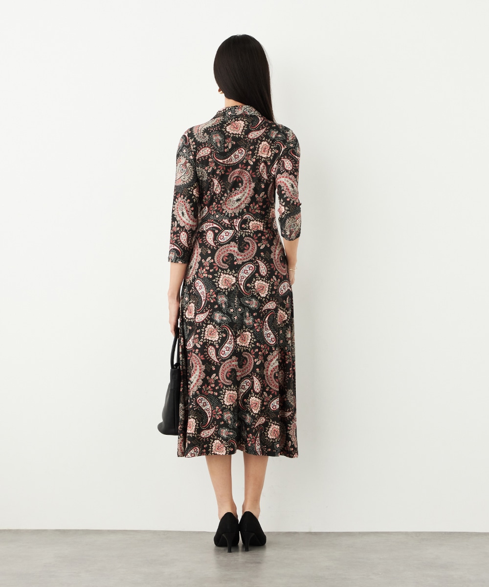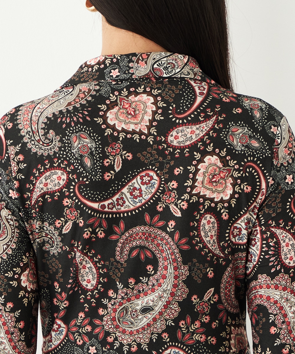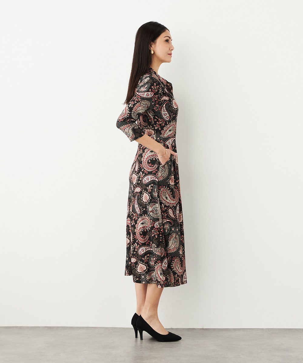 大ぶりの柄を繊細なタッチで描いており、上品な存在感を発揮しています。襟付きのデザインならではのキレイ目感も魅力です。ウエストには切り替えが入ってスタイルがすっきりと見えます。長めの着丈の大人っぽさもポイント。お出かけコーディネートにもぴったりな1枚です。