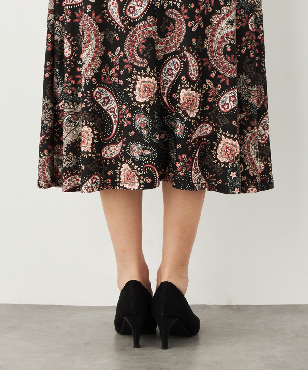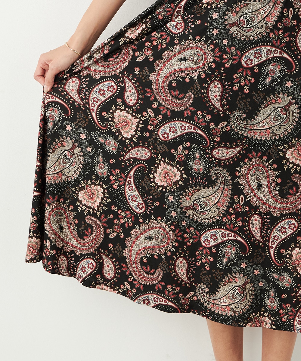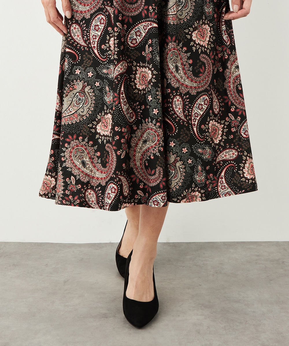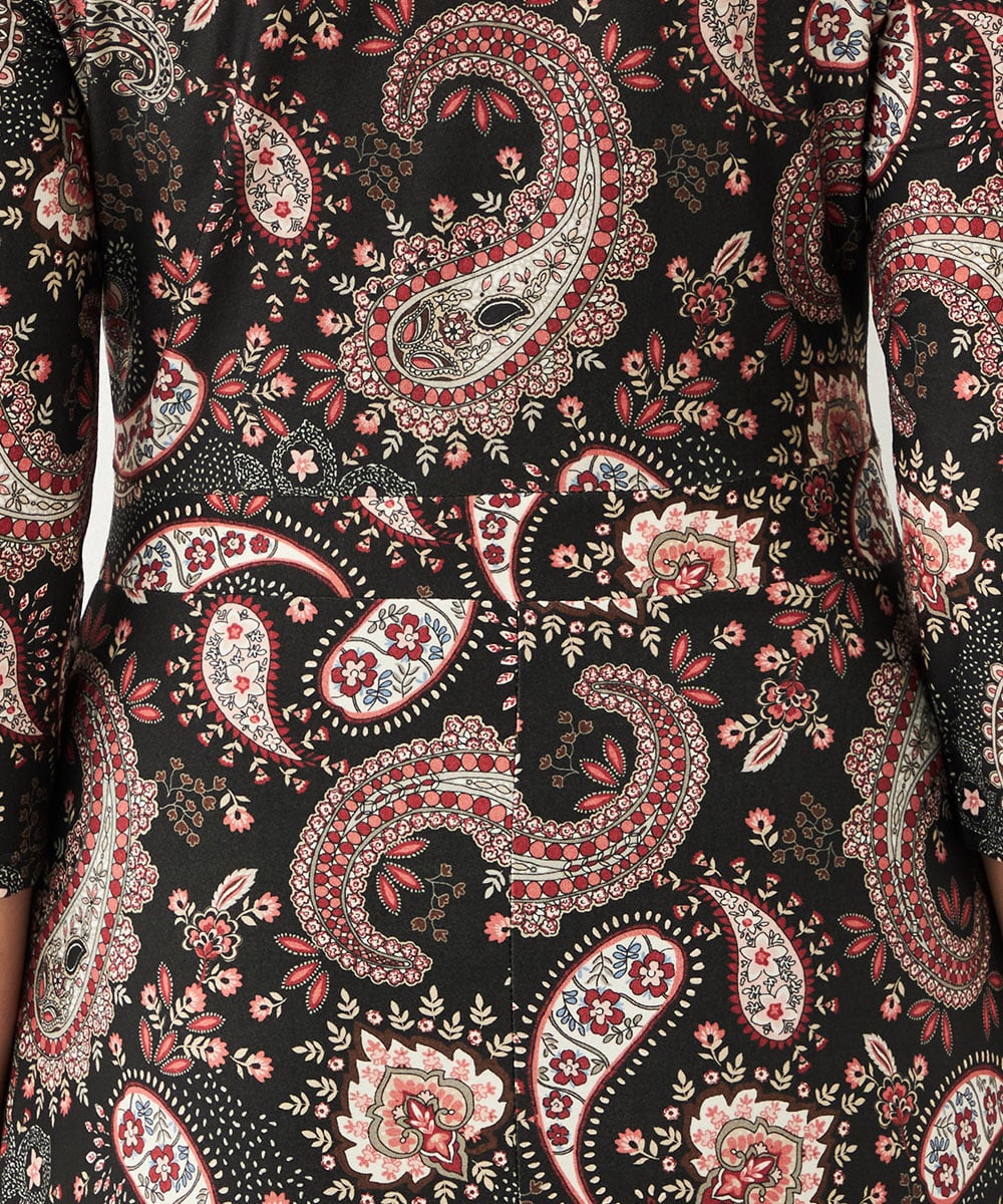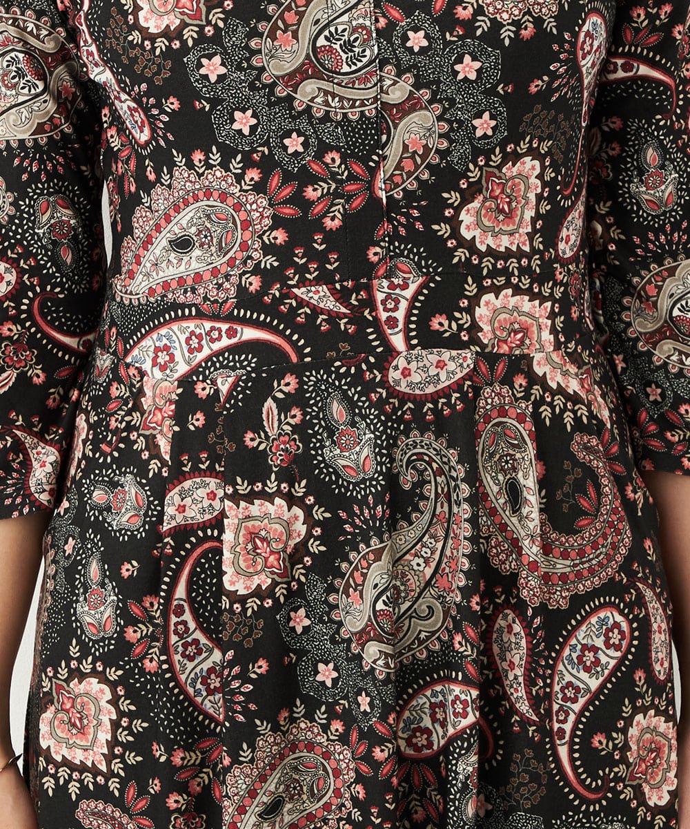 大ぶりの柄を繊細なタッチで描いており、上品な存在感を発揮しています。襟付きのデザインならではのキレイ目感も魅力です。ウエストには切り替えが入ってスタイルがすっきりと見えます。長めの着丈の大人っぽさもポイント。お出かけコーディネートにもぴったりな1枚です。
