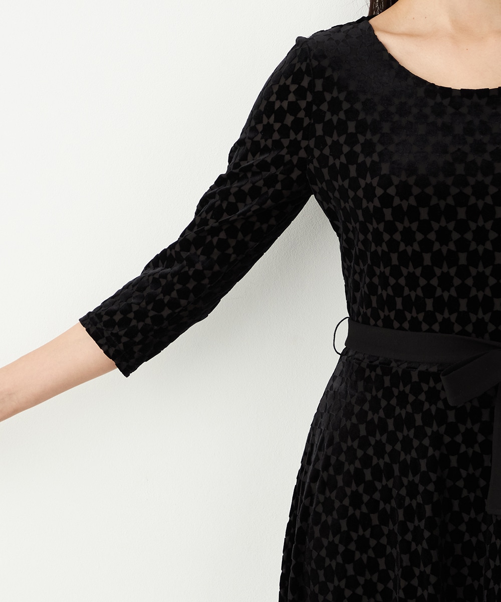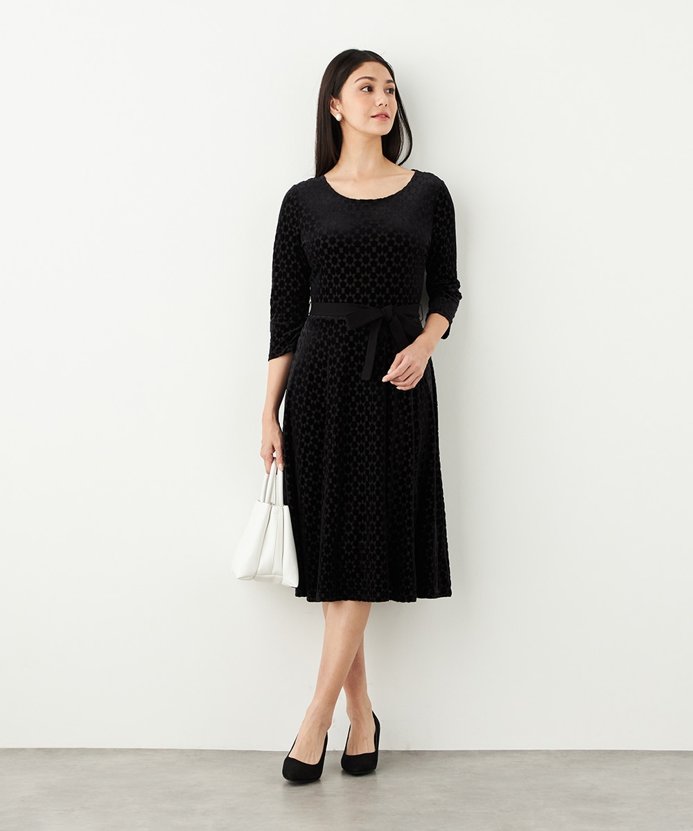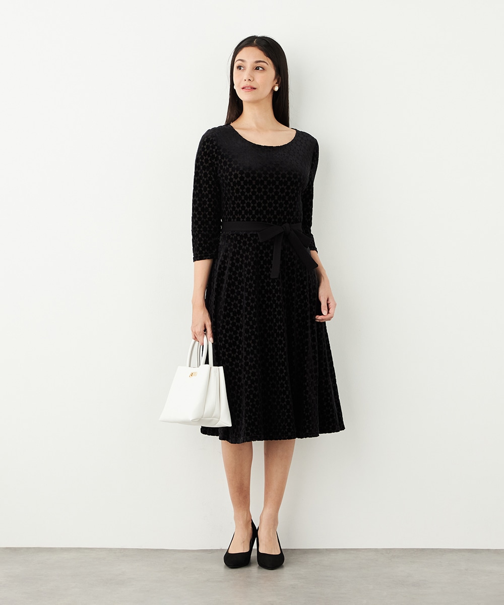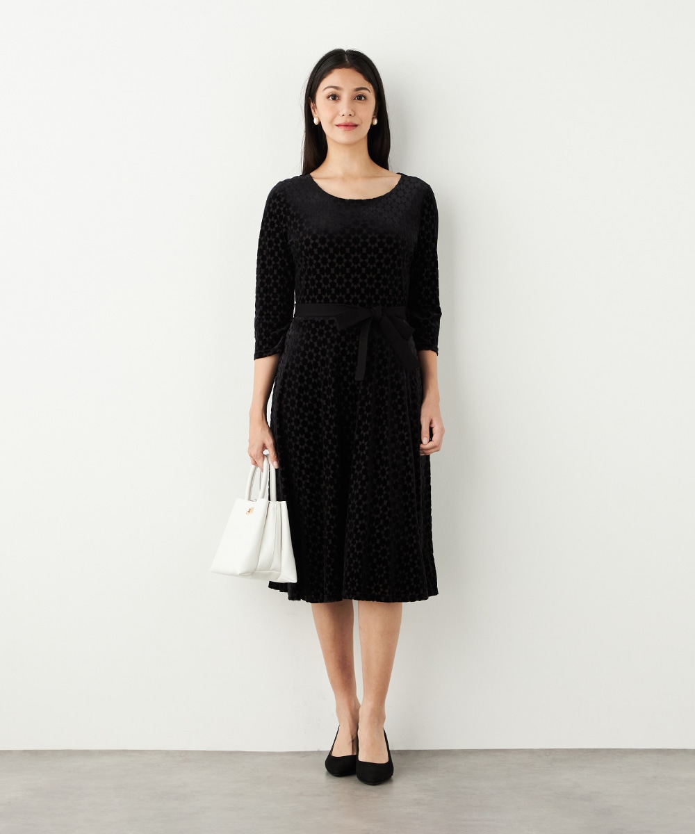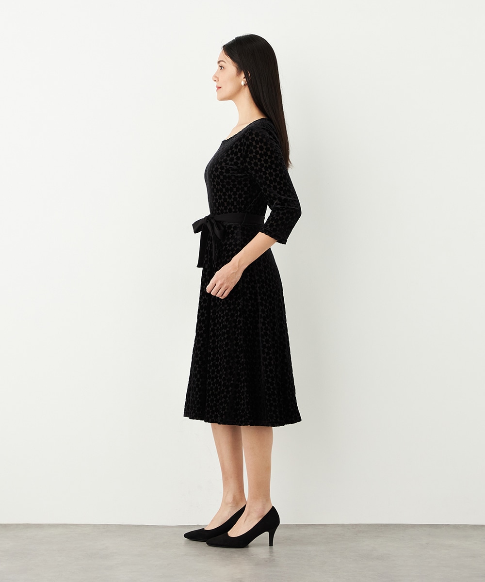 ベロア生地ならではの微起毛感がエレガントな印象です。広めに開いたラウンドネックがフェイスラインをすっきりと見せます。大人っぽく品良く着られるロング丈のデザインでオンオフを問わずに対応が可能です。リボンベルトが付属して、ウエストマークのアレンジも楽しめます。