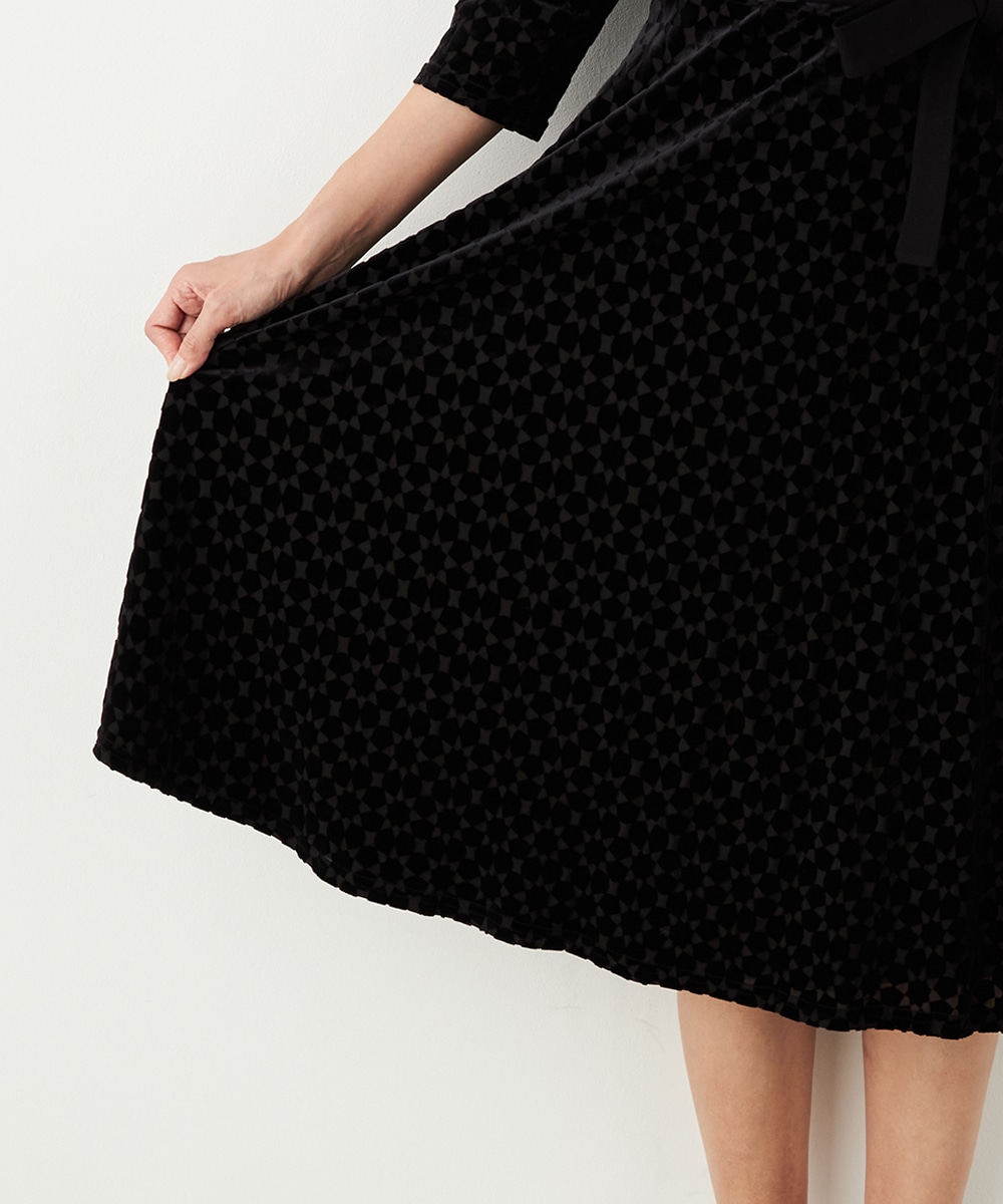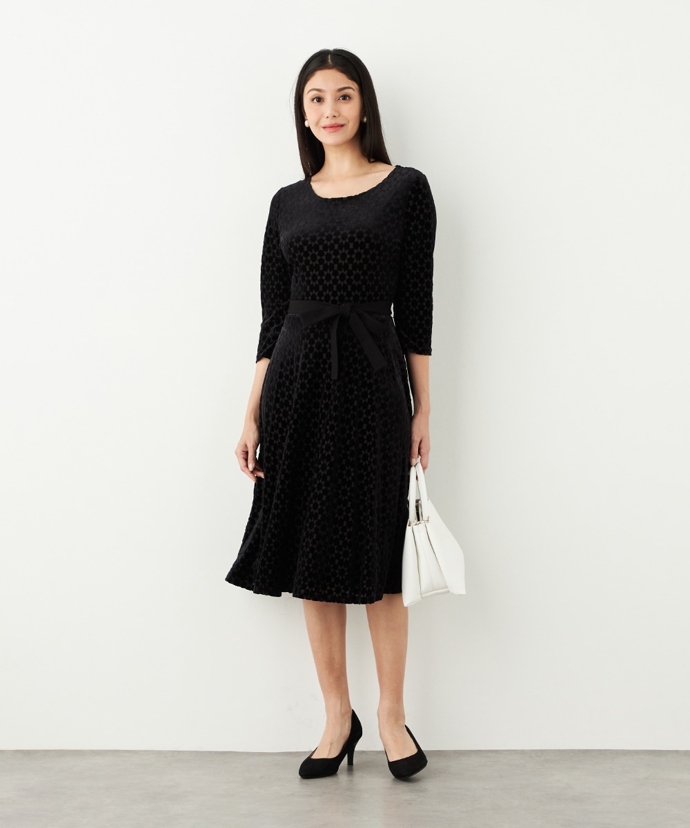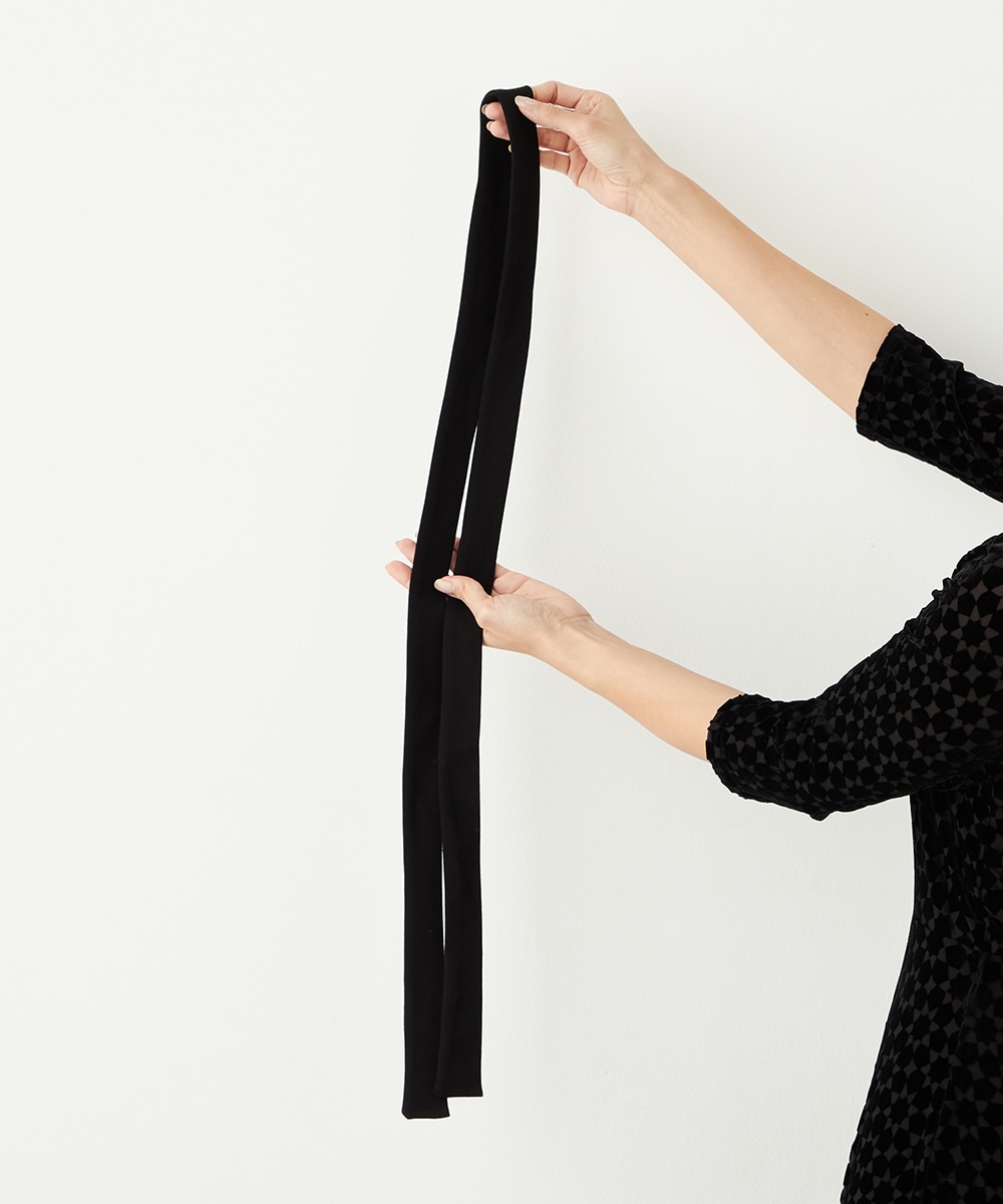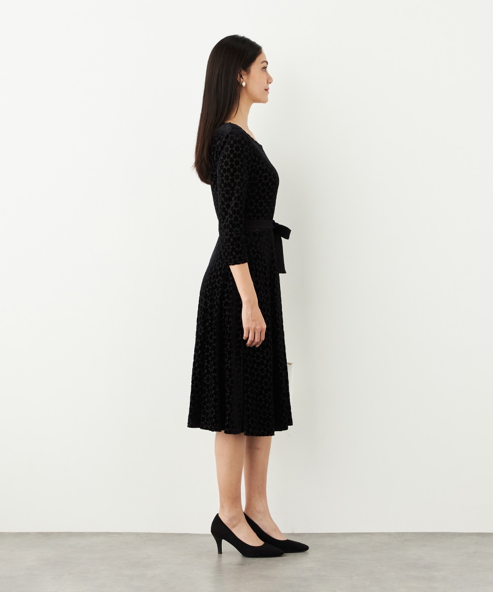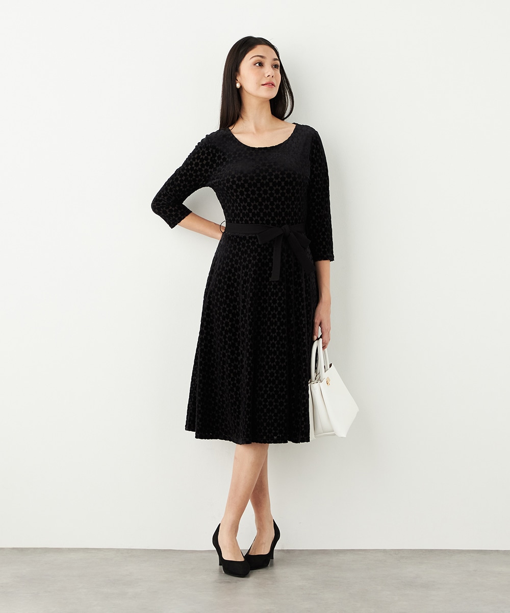 ベロア生地ならではの微起毛感がエレガントな印象です。広めに開いたラウンドネックがフェイスラインをすっきりと見せます。大人っぽく品良く着られるロング丈のデザインでオンオフを問わずに対応が可能です。リボンベルトが付属して、ウエストマークのアレンジも楽しめます。