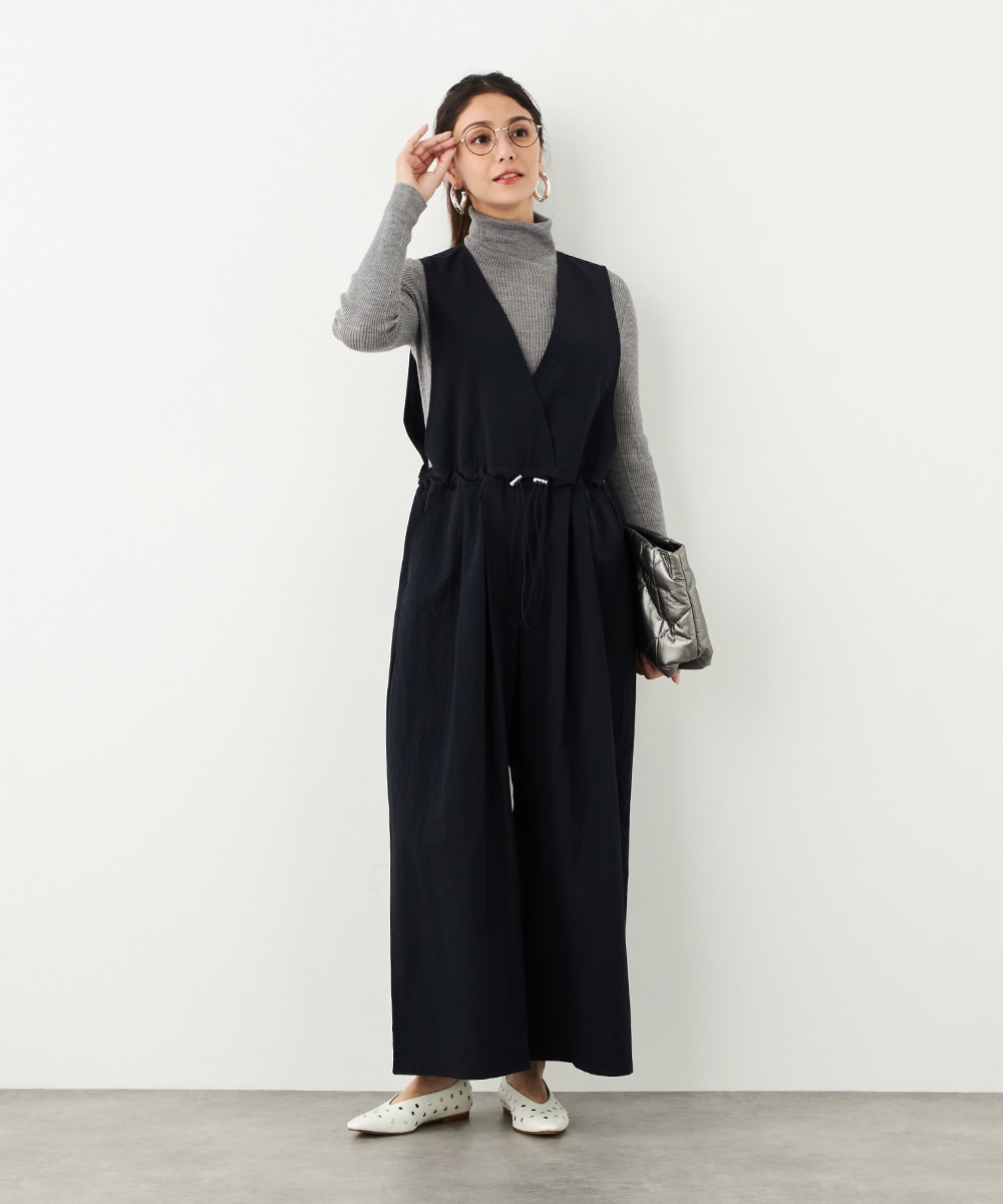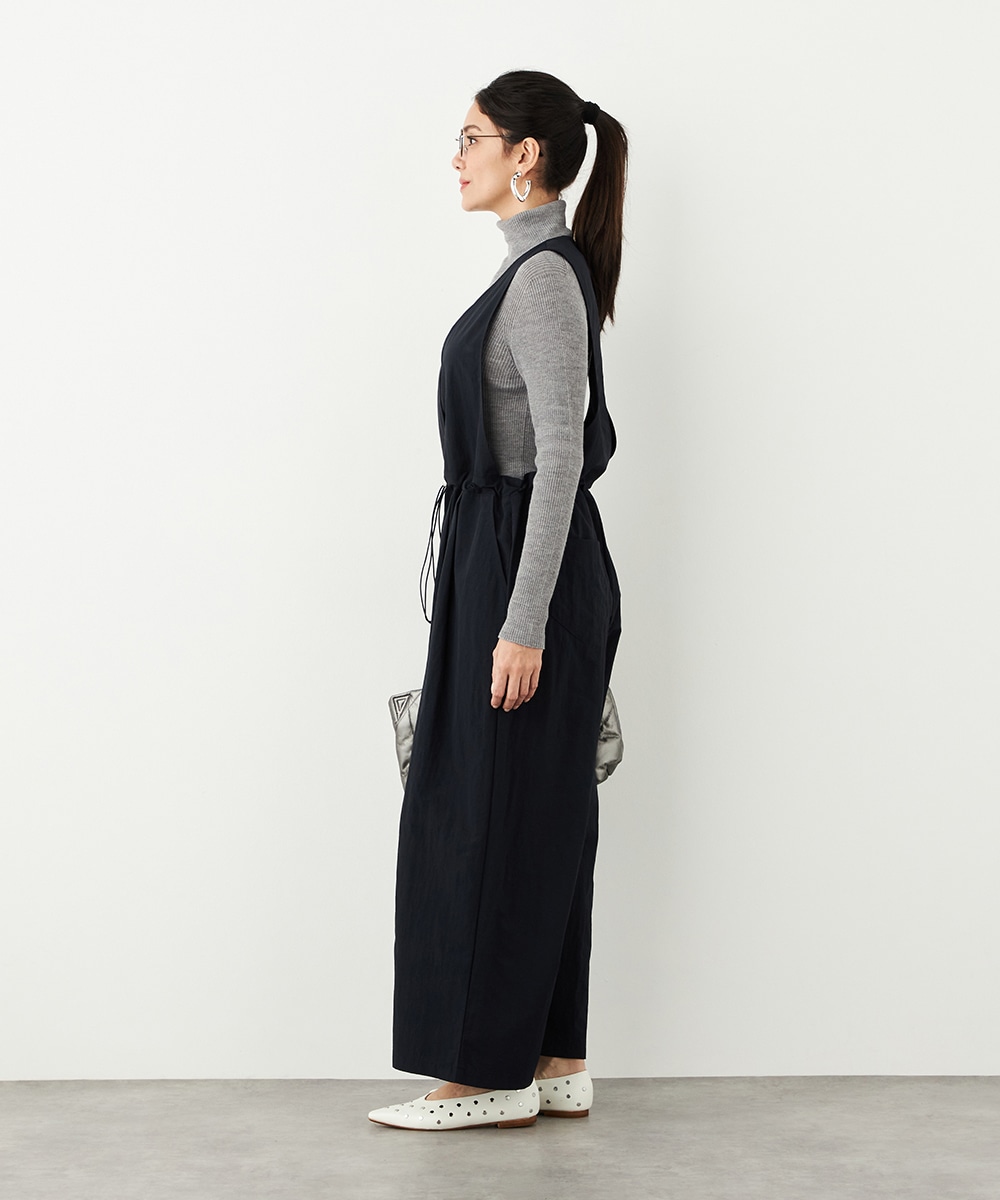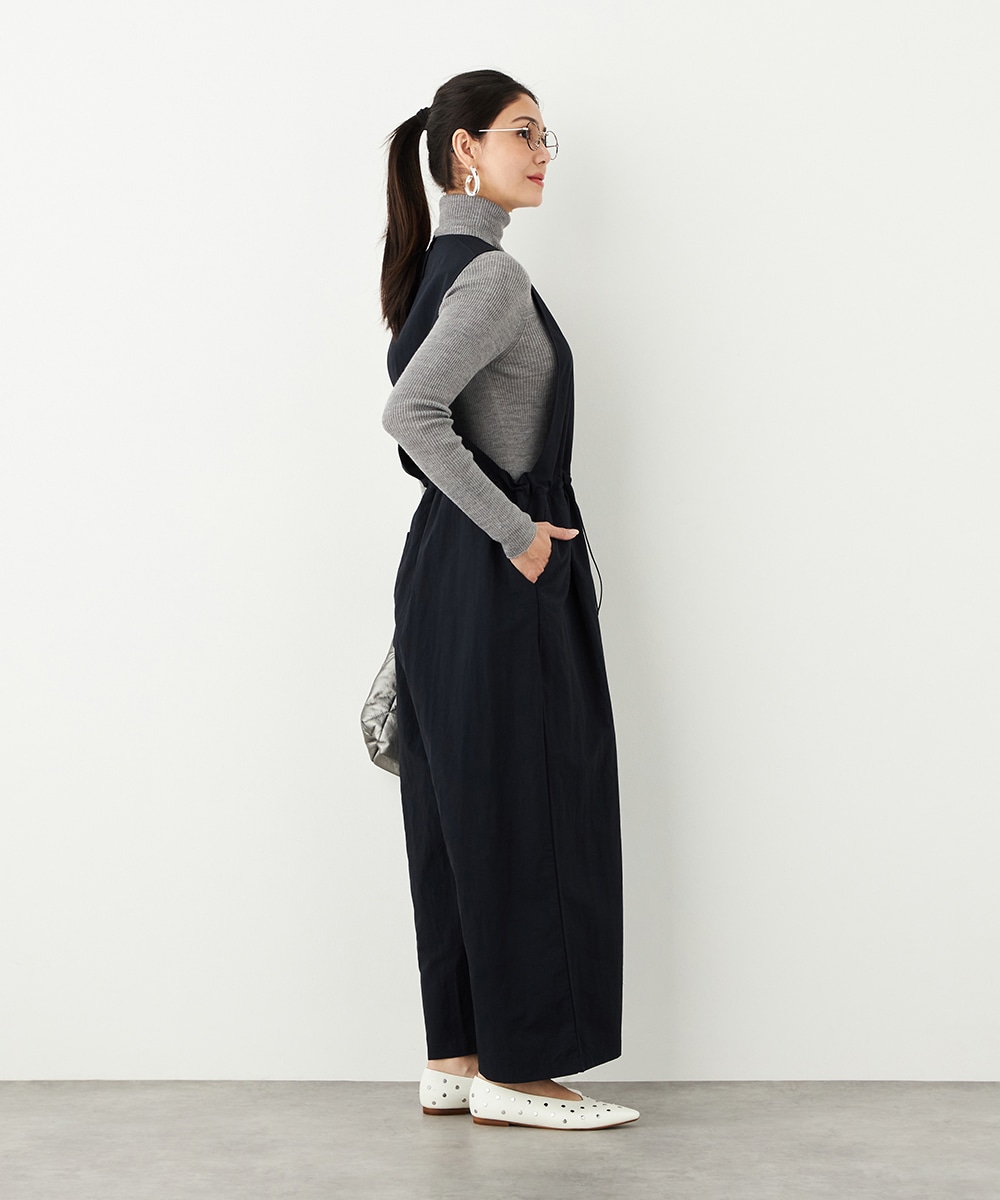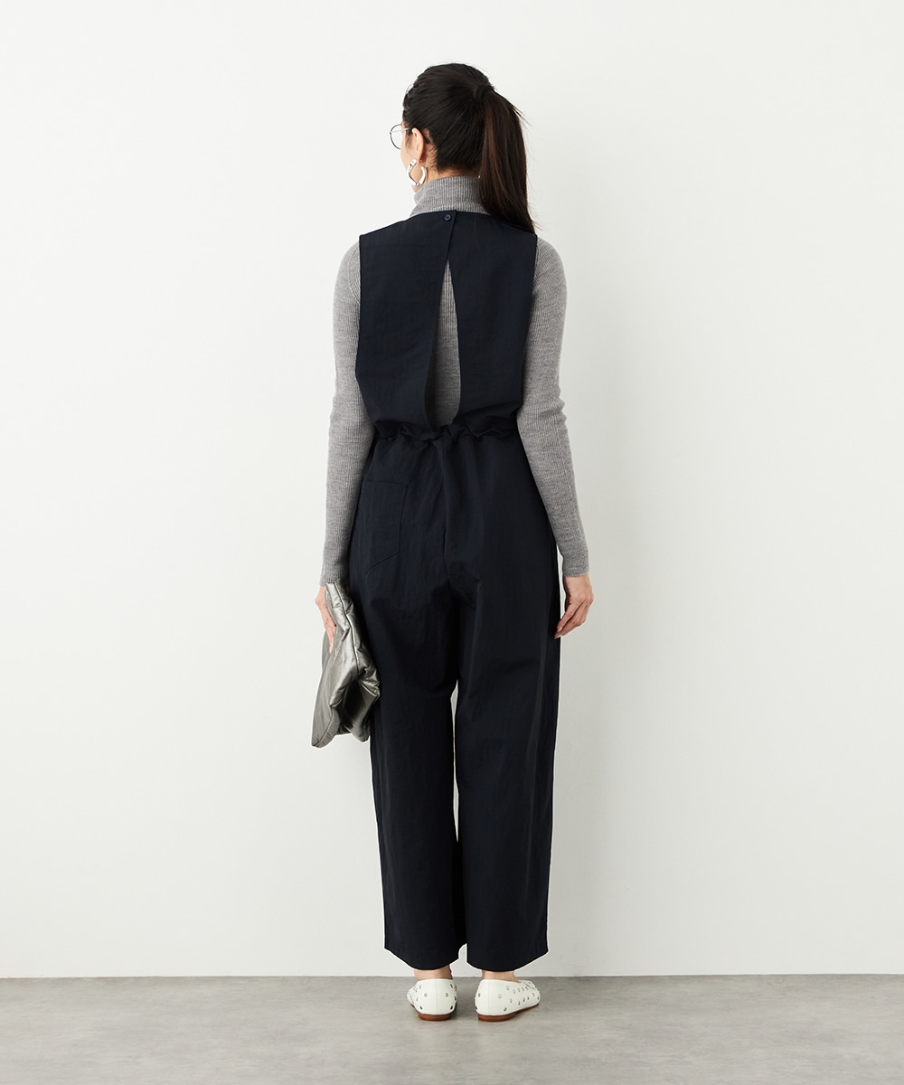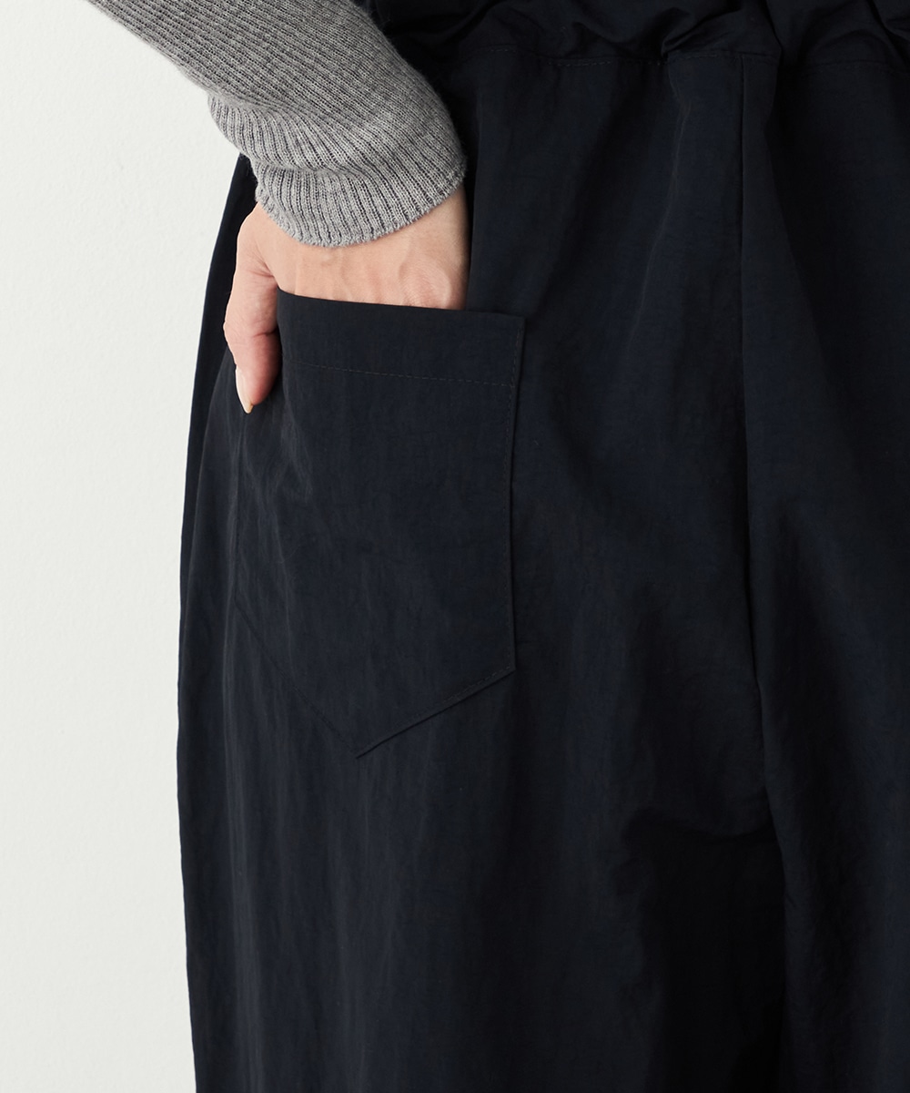 バックは大胆なカッティングが施され、印象的な後ろ姿を演出します。ウエストはコードによってフィット感の調整が可能です。パンツ部分はワイドシルエットに仕上がり、モードな雰囲気のある大人の着こなしを楽しめます。スマートフォンなど小物の収納に便利なサイドポケット付き。ヒップポケットはアクセントとしても効いています。