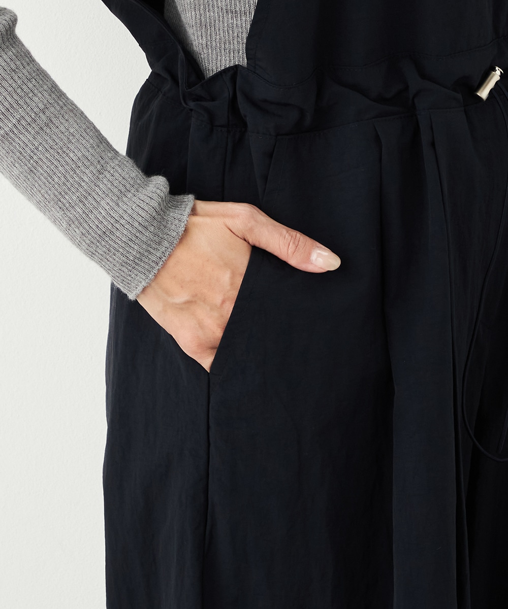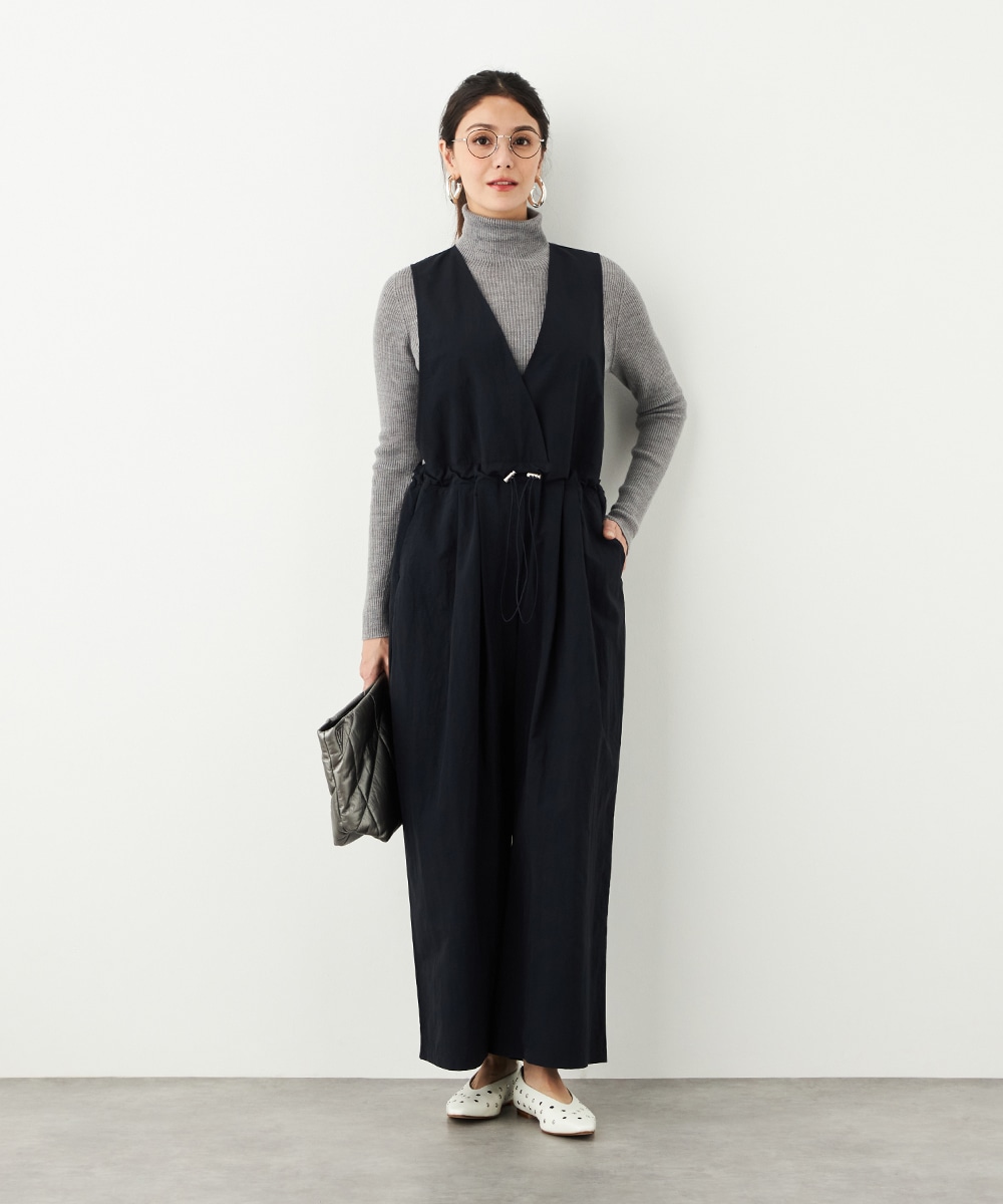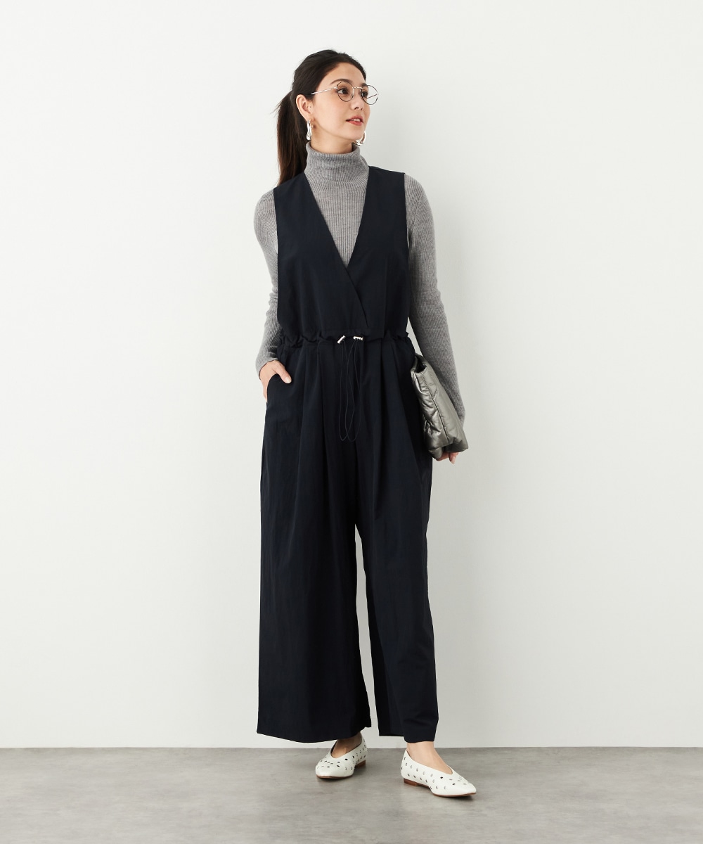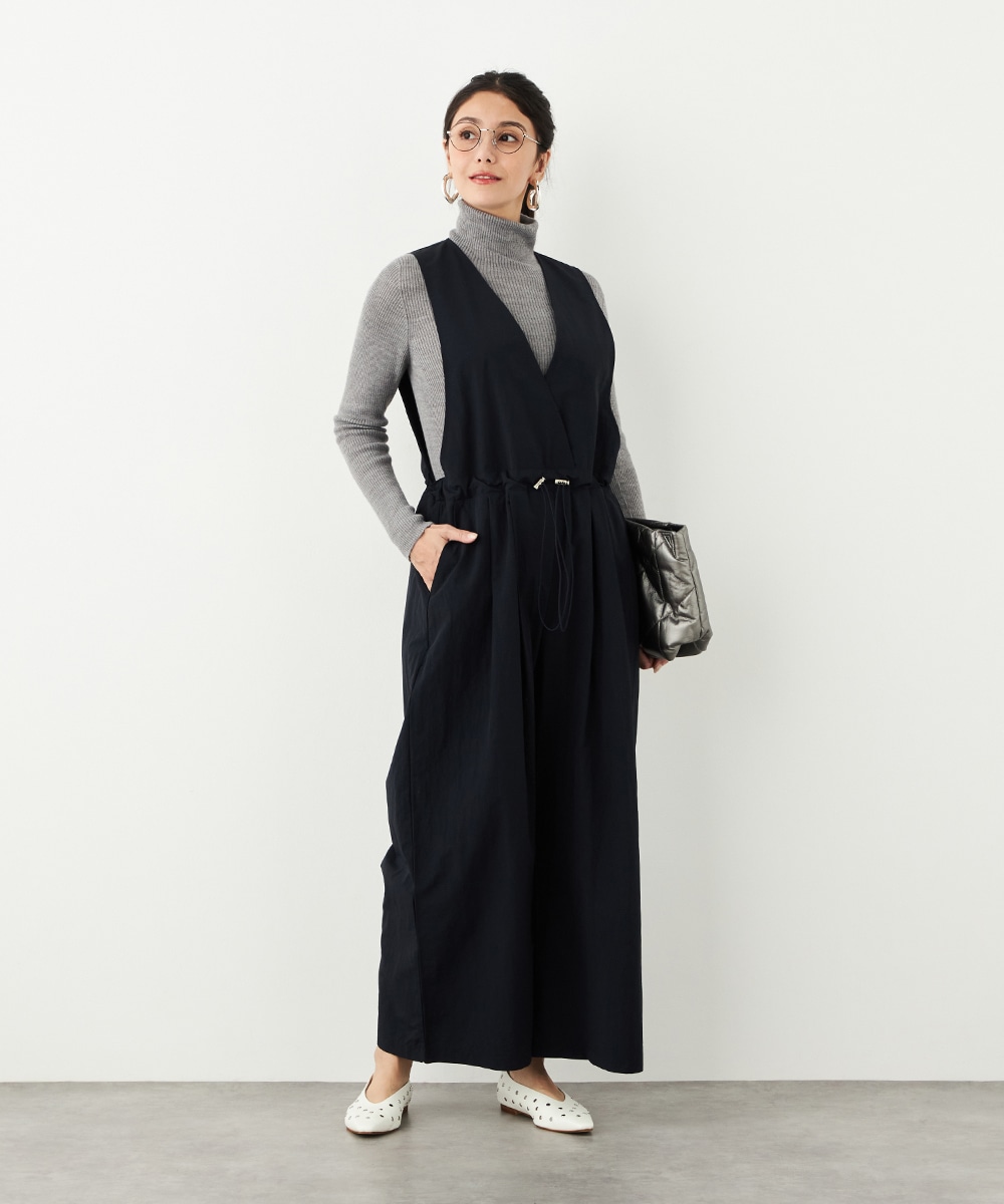 バックは大胆なカッティングが施され、印象的な後ろ姿を演出します。ウエストはコードによってフィット感の調整が可能です。パンツ部分はワイドシルエットに仕上がり、モードな雰囲気のある大人の着こなしを楽しめます。スマートフォンなど小物の収納に便利なサイドポケット付き。ヒップポケットはアクセントとしても効いています。