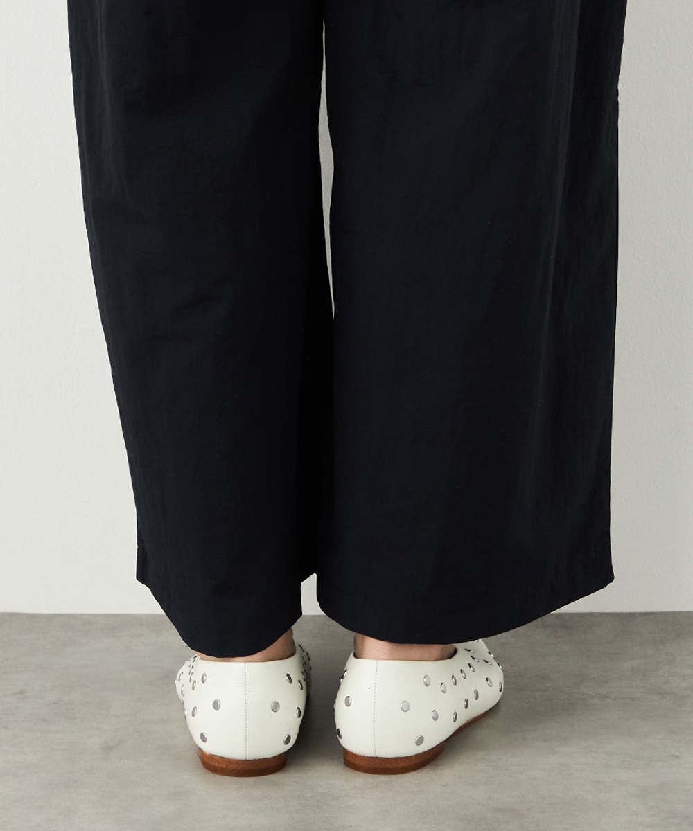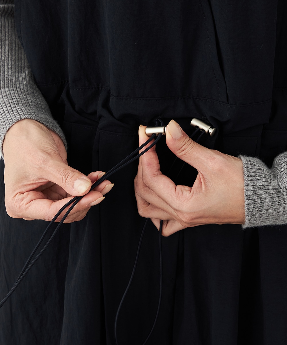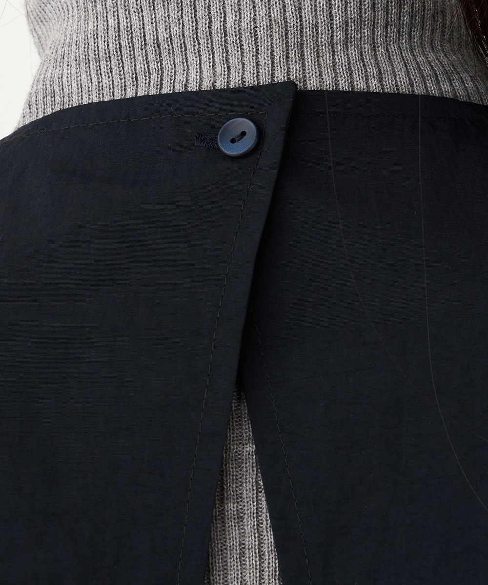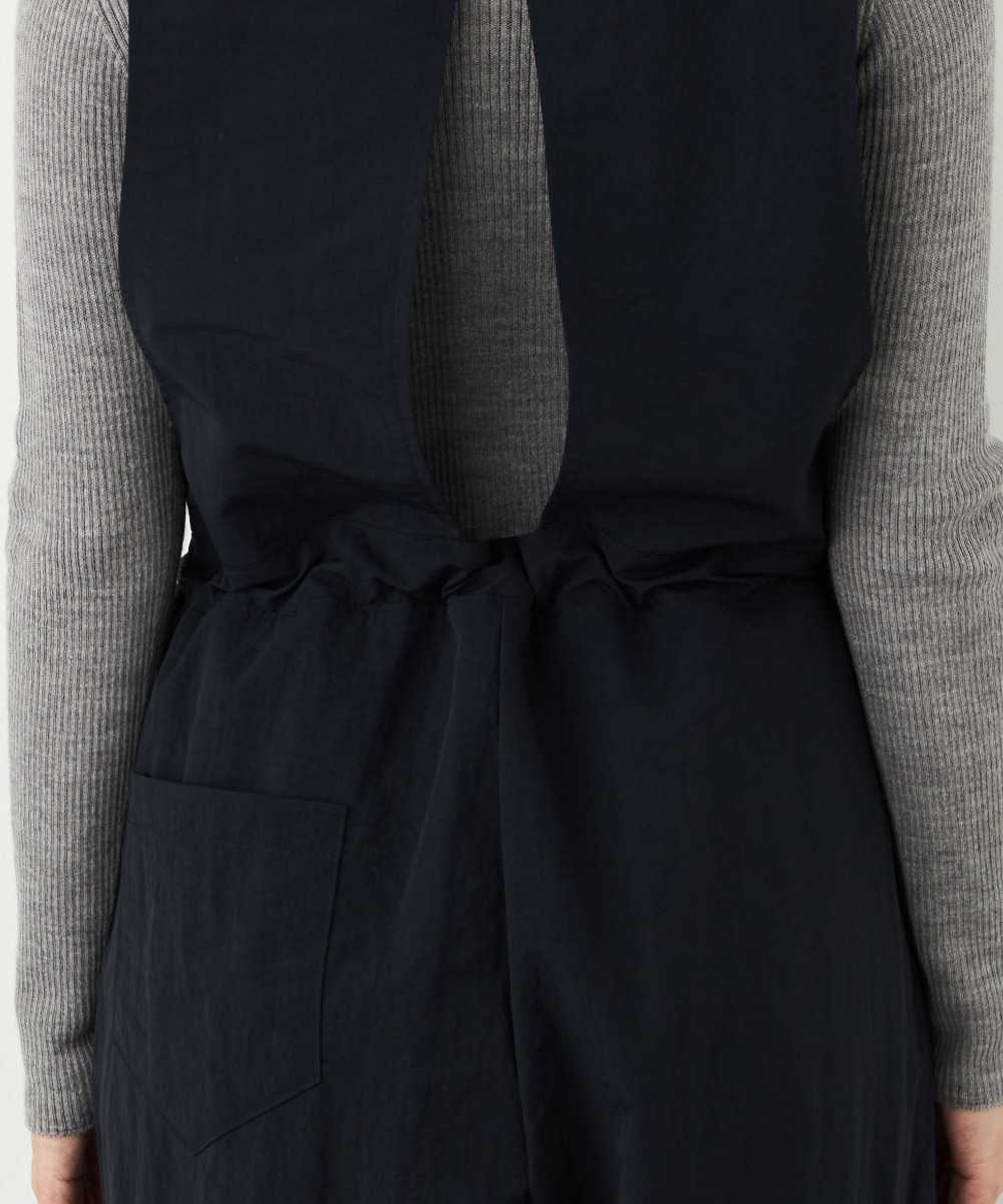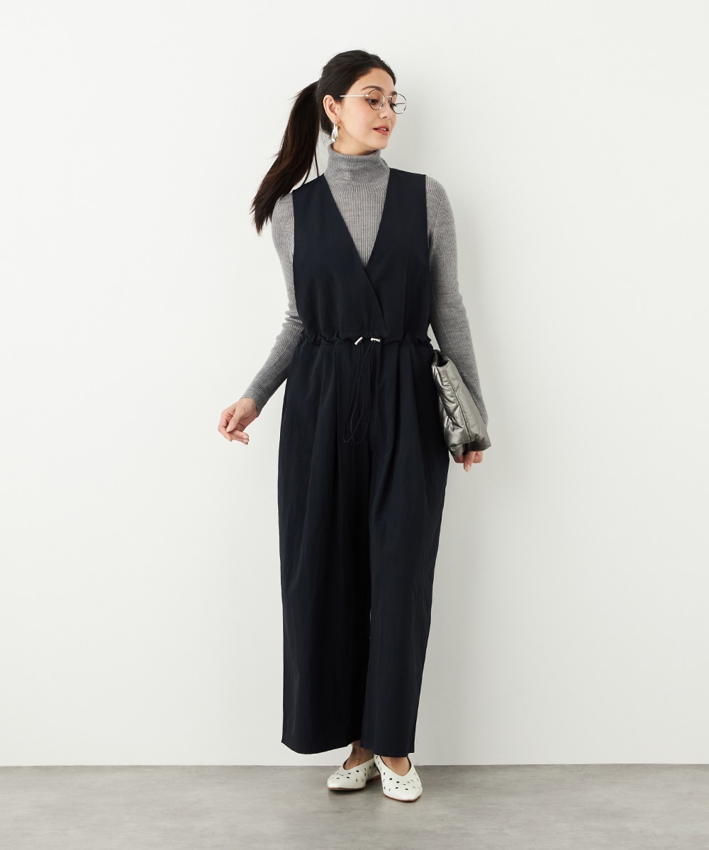 バックは大胆なカッティングが施され、印象的な後ろ姿を演出します。ウエストはコードによってフィット感の調整が可能です。パンツ部分はワイドシルエットに仕上がり、モードな雰囲気のある大人の着こなしを楽しめます。スマートフォンなど小物の収納に便利なサイドポケット付き。ヒップポケットはアクセントとしても効いています。