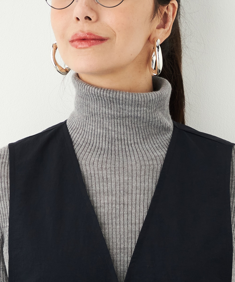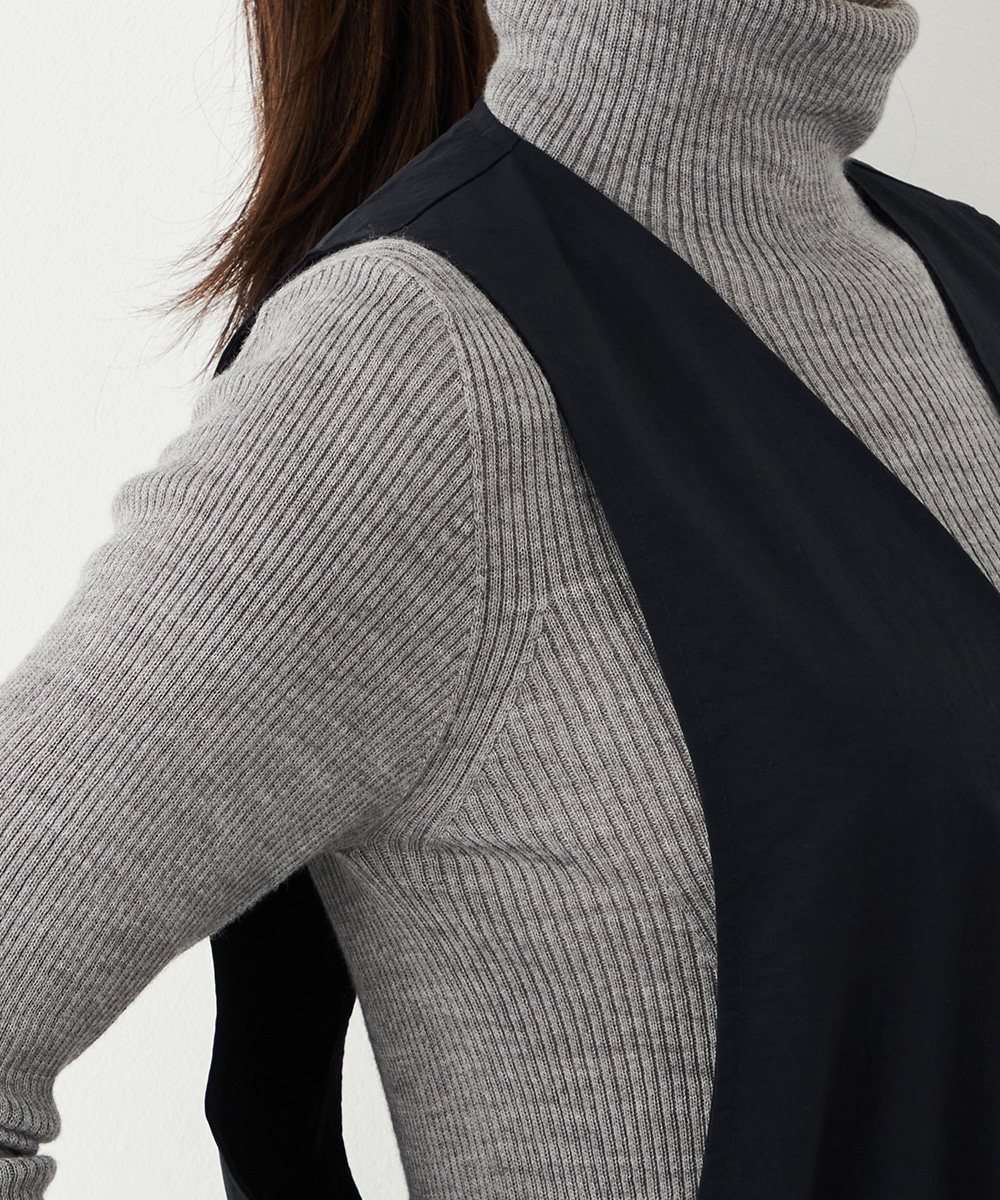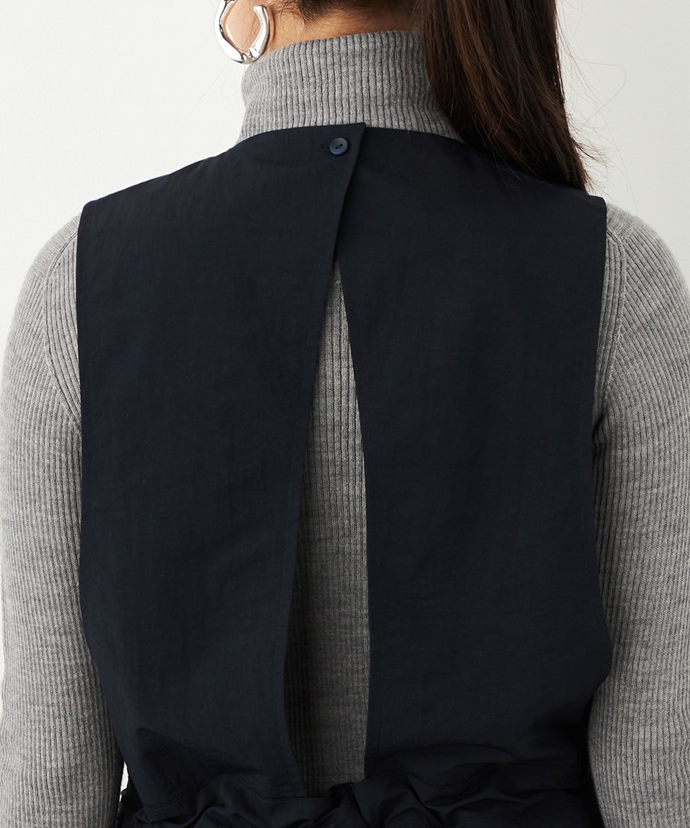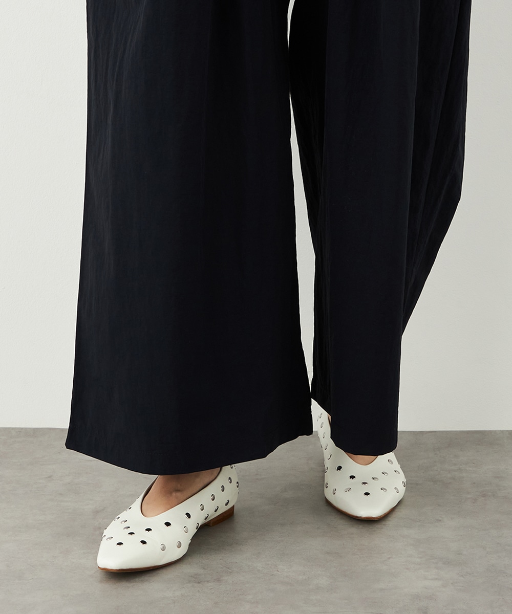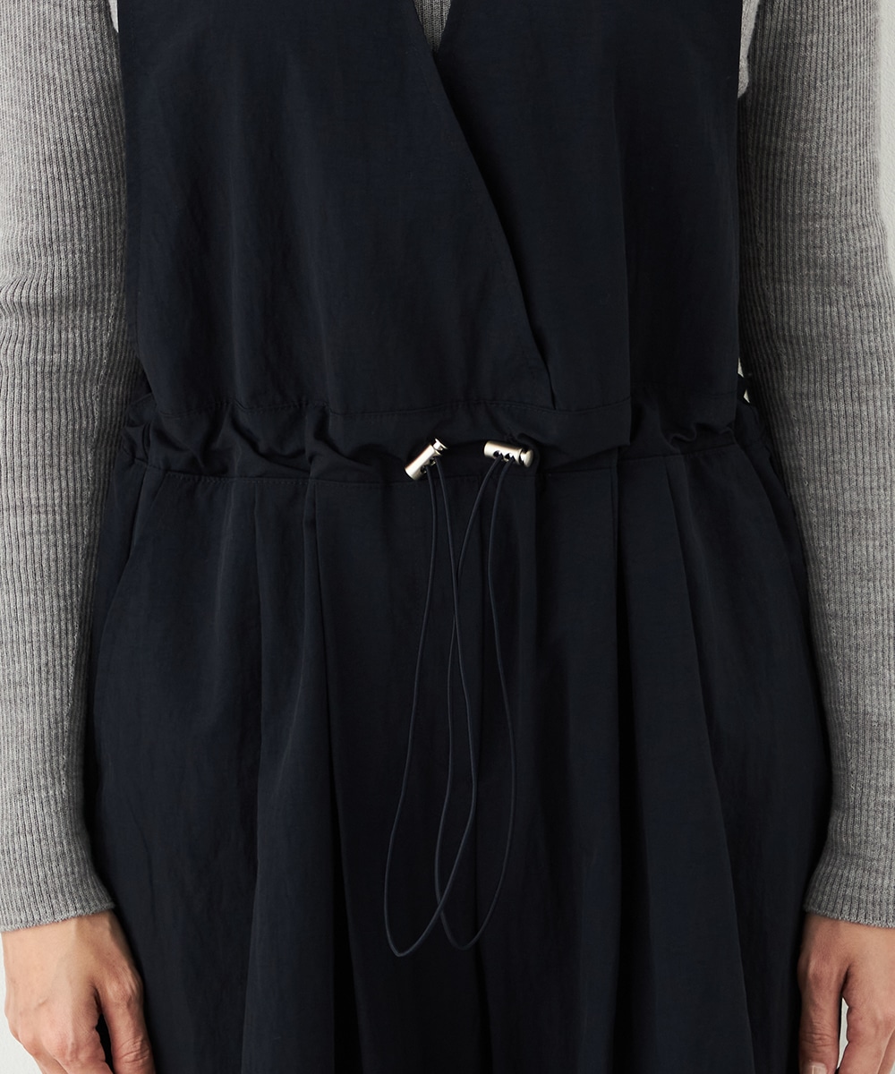 バックは大胆なカッティングが施され、印象的な後ろ姿を演出します。ウエストはコードによってフィット感の調整が可能です。パンツ部分はワイドシルエットに仕上がり、モードな雰囲気のある大人の着こなしを楽しめます。スマートフォンなど小物の収納に便利なサイドポケット付き。ヒップポケットはアクセントとしても効いています。