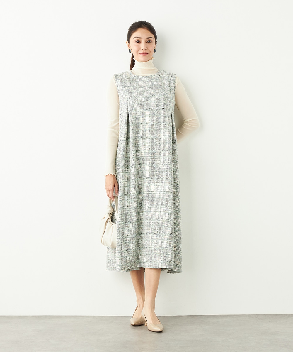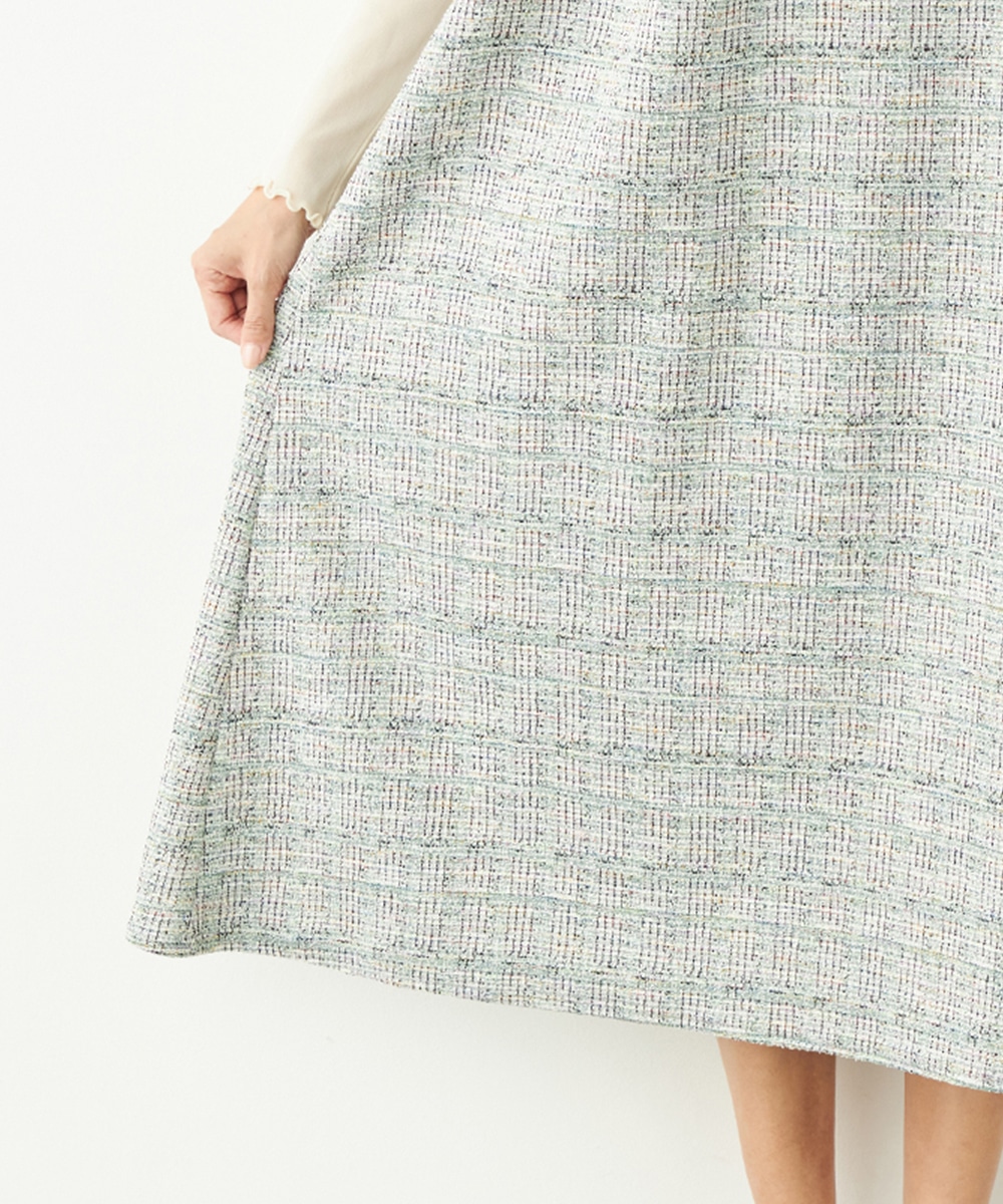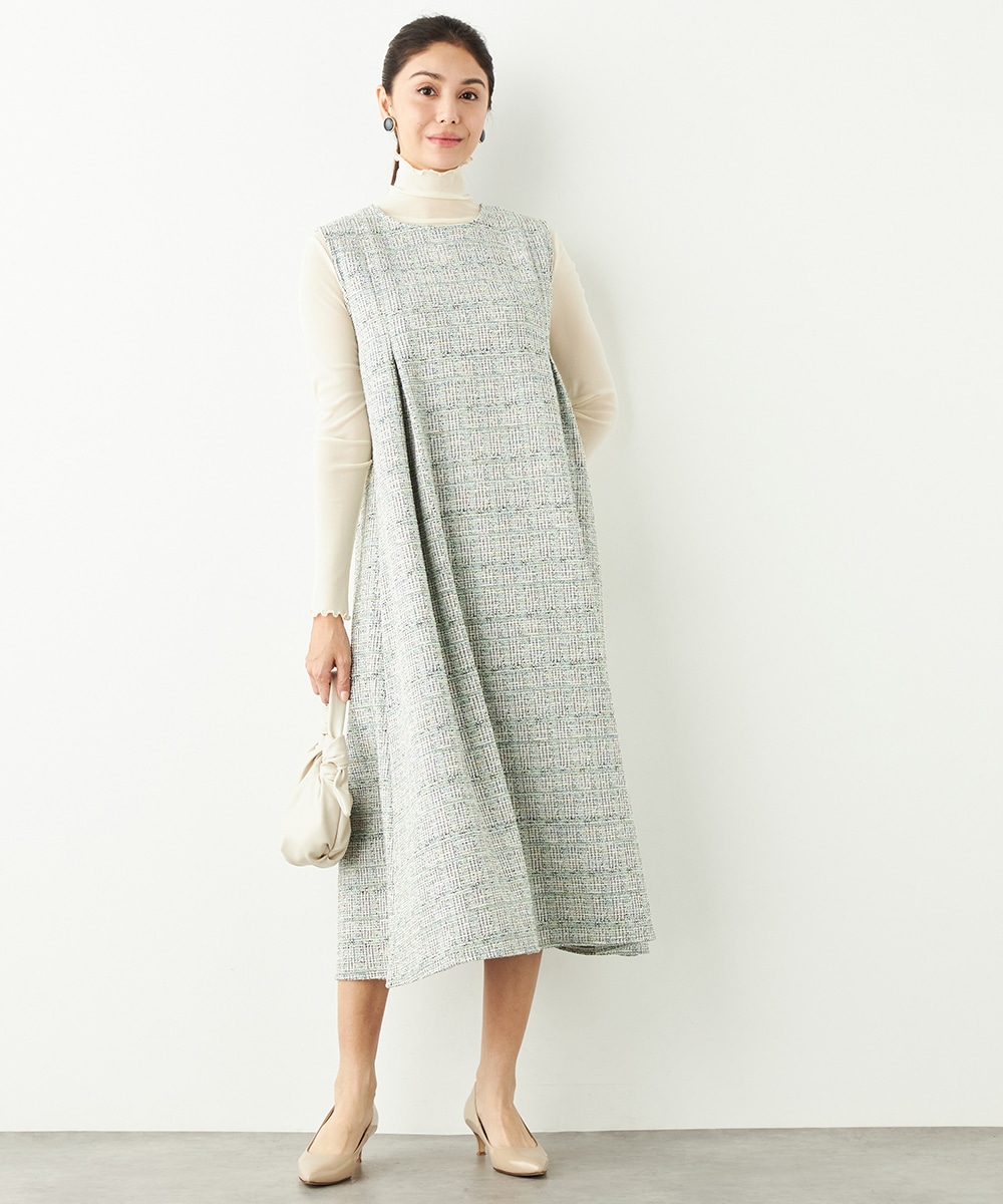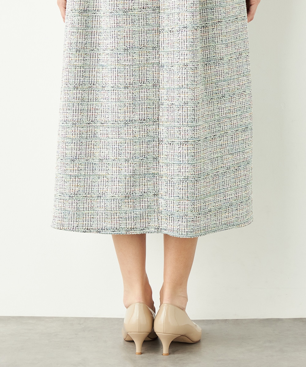 清潔感がある明るいカラーで春らしい雰囲気にまとまっています。上品さも感じられ、アレンジ次第で幅広く活用できるのも魅力です。前後2カ所にタックを施すことで、裾に向かってきれいに広がるフレアシルエットを作り出しています。大人っぽくエレガントに着こなせる長めの着丈です。