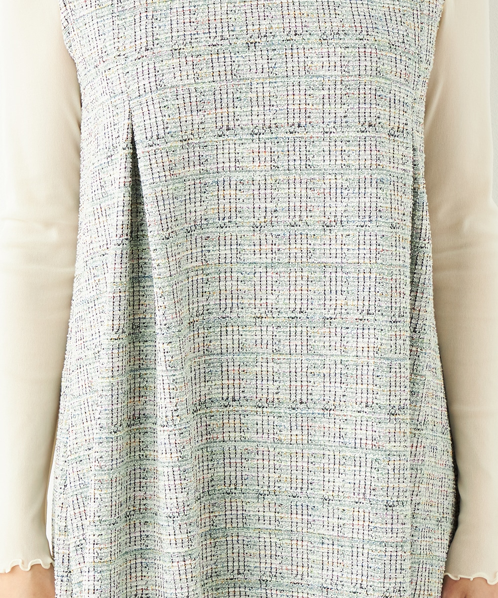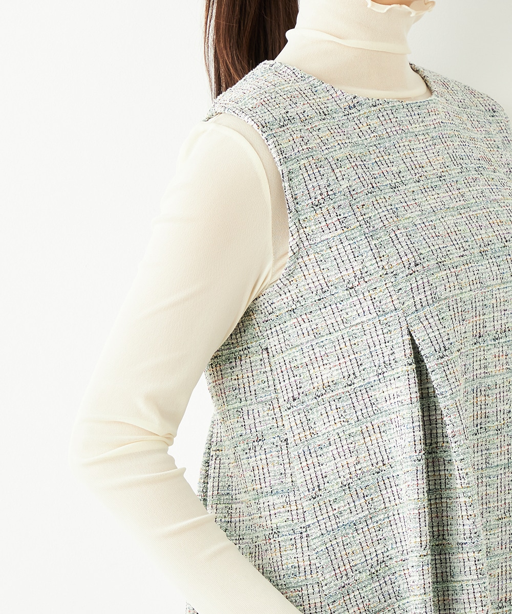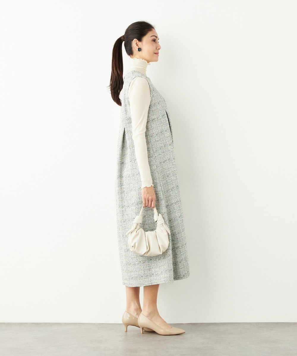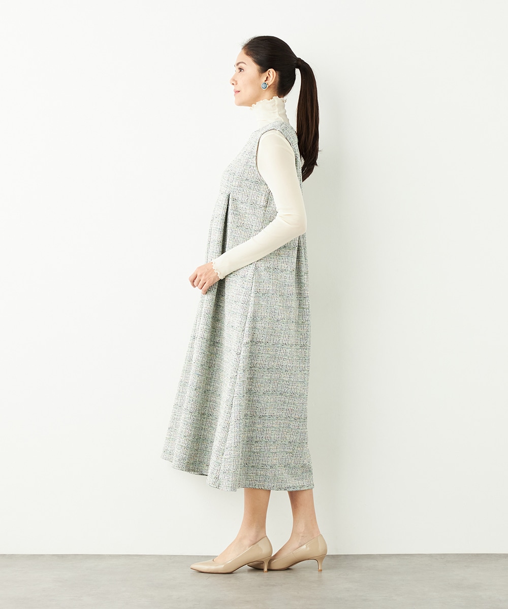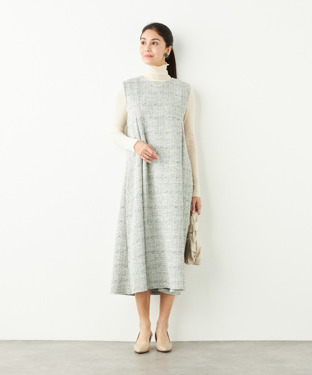 清潔感がある明るいカラーで春らしい雰囲気にまとまっています。上品さも感じられ、アレンジ次第で幅広く活用できるのも魅力です。前後2カ所にタックを施すことで、裾に向かってきれいに広がるフレアシルエットを作り出しています。大人っぽくエレガントに着こなせる長めの着丈です。