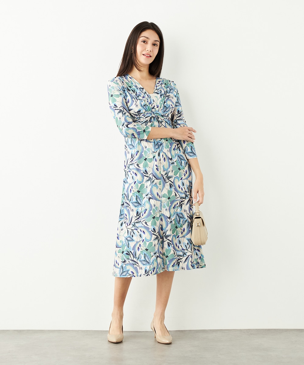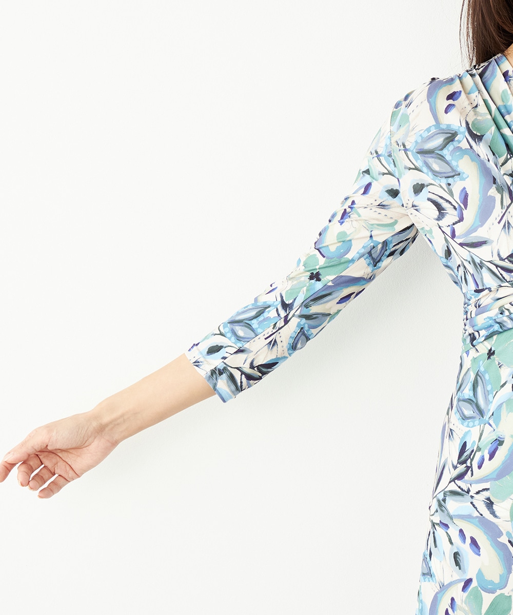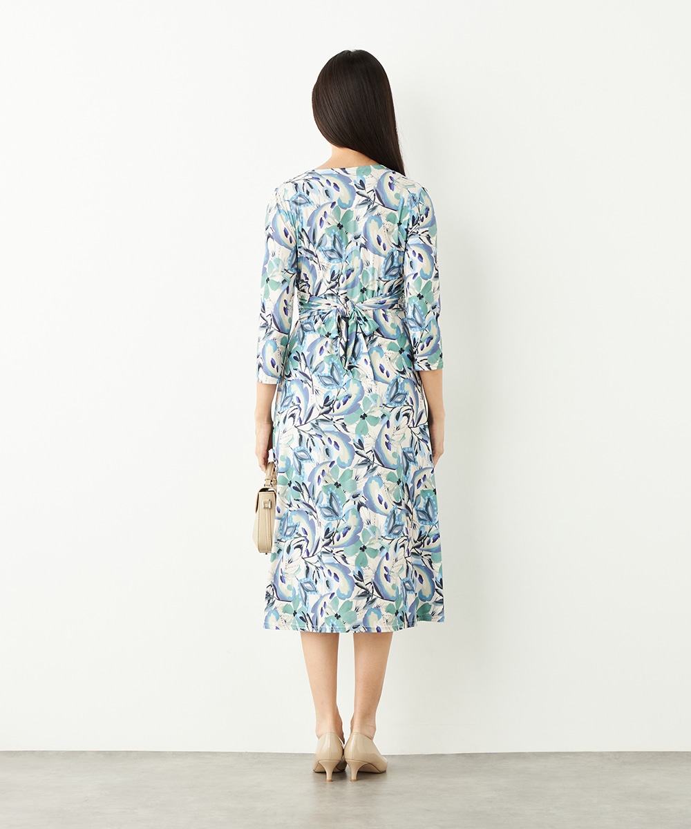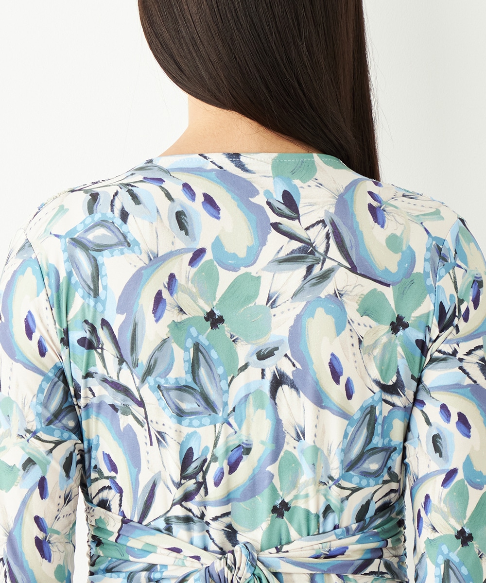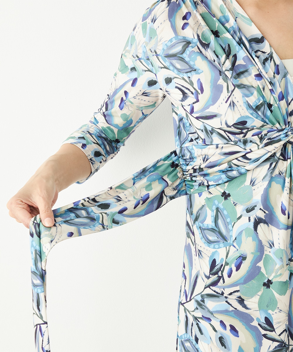 水彩調タッチのぼかし感が女性らしい柔らかな雰囲気を演出します。フロントはギャザーのくしゅくしゅ感がポイントのツイストデザイン。バックで結ぶベルトによって後ろ姿にメリハリがプラスされます。大人っぽくエレガントに着こなせるロング丈です。ソフトな風合いのジャージ素材を使用しています。