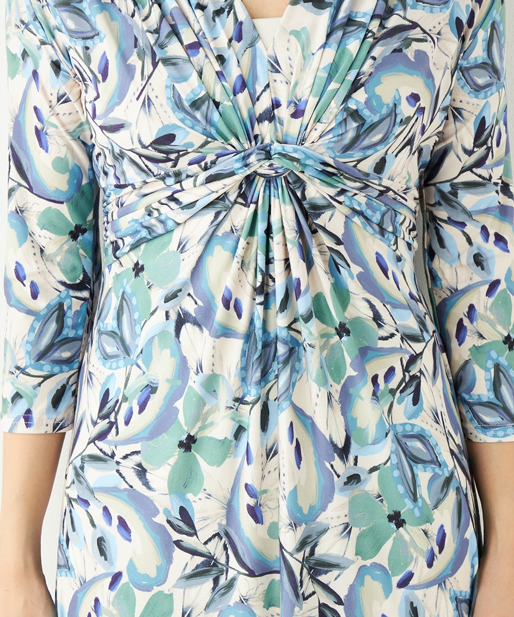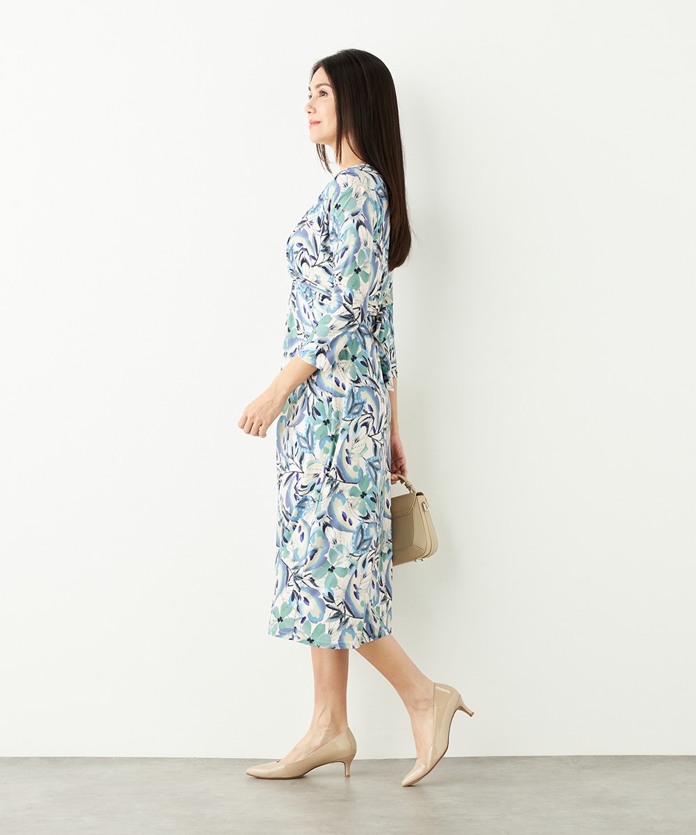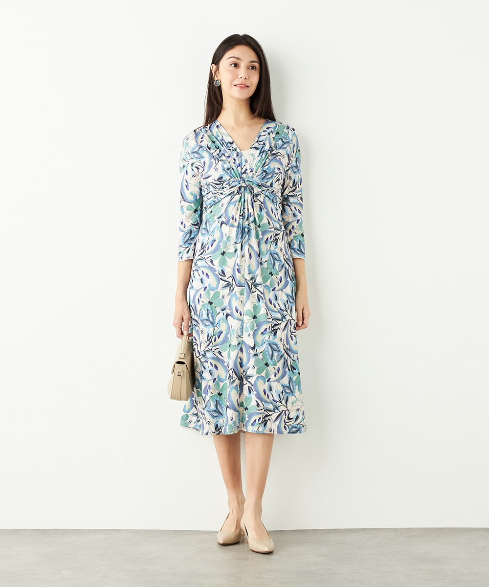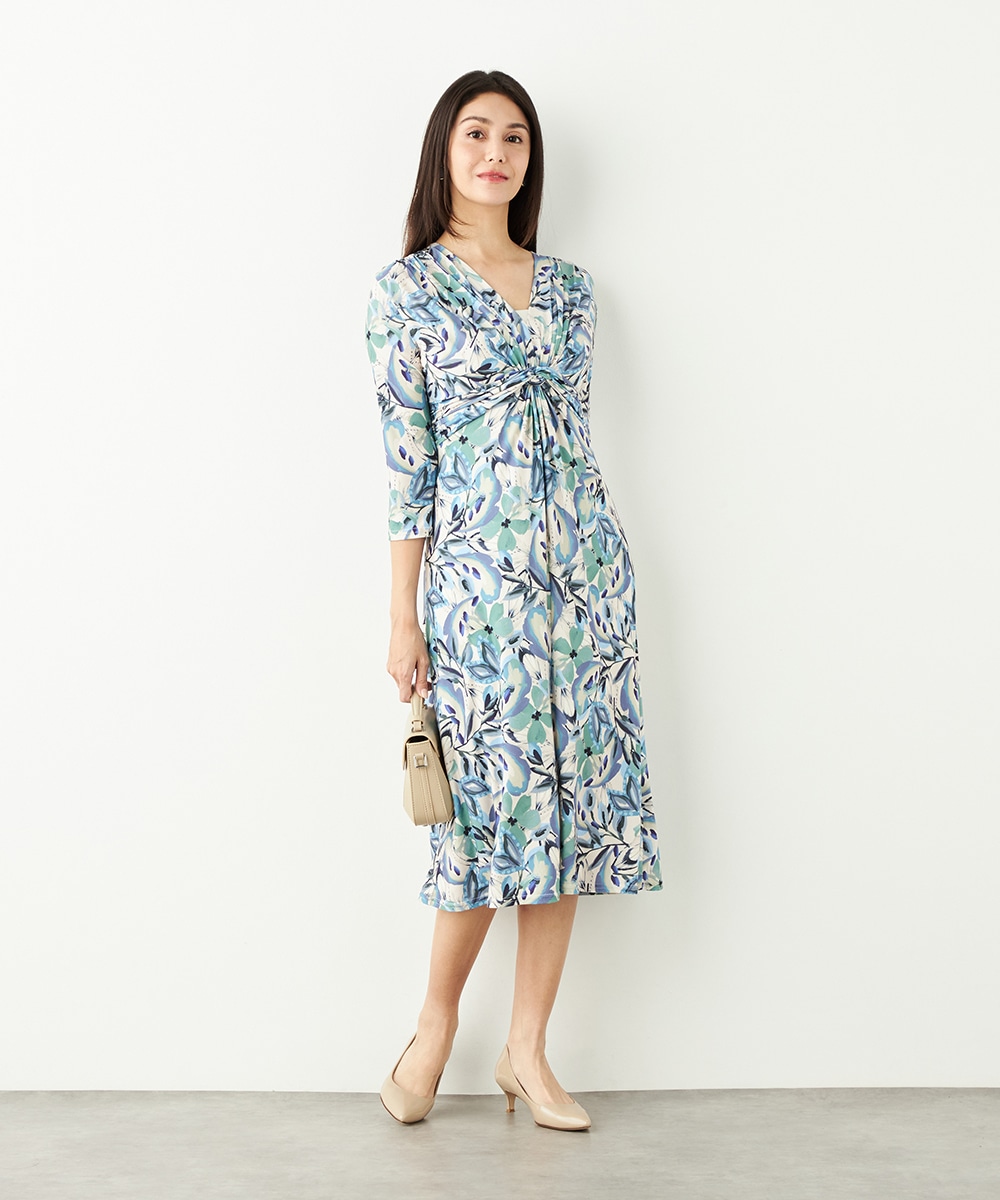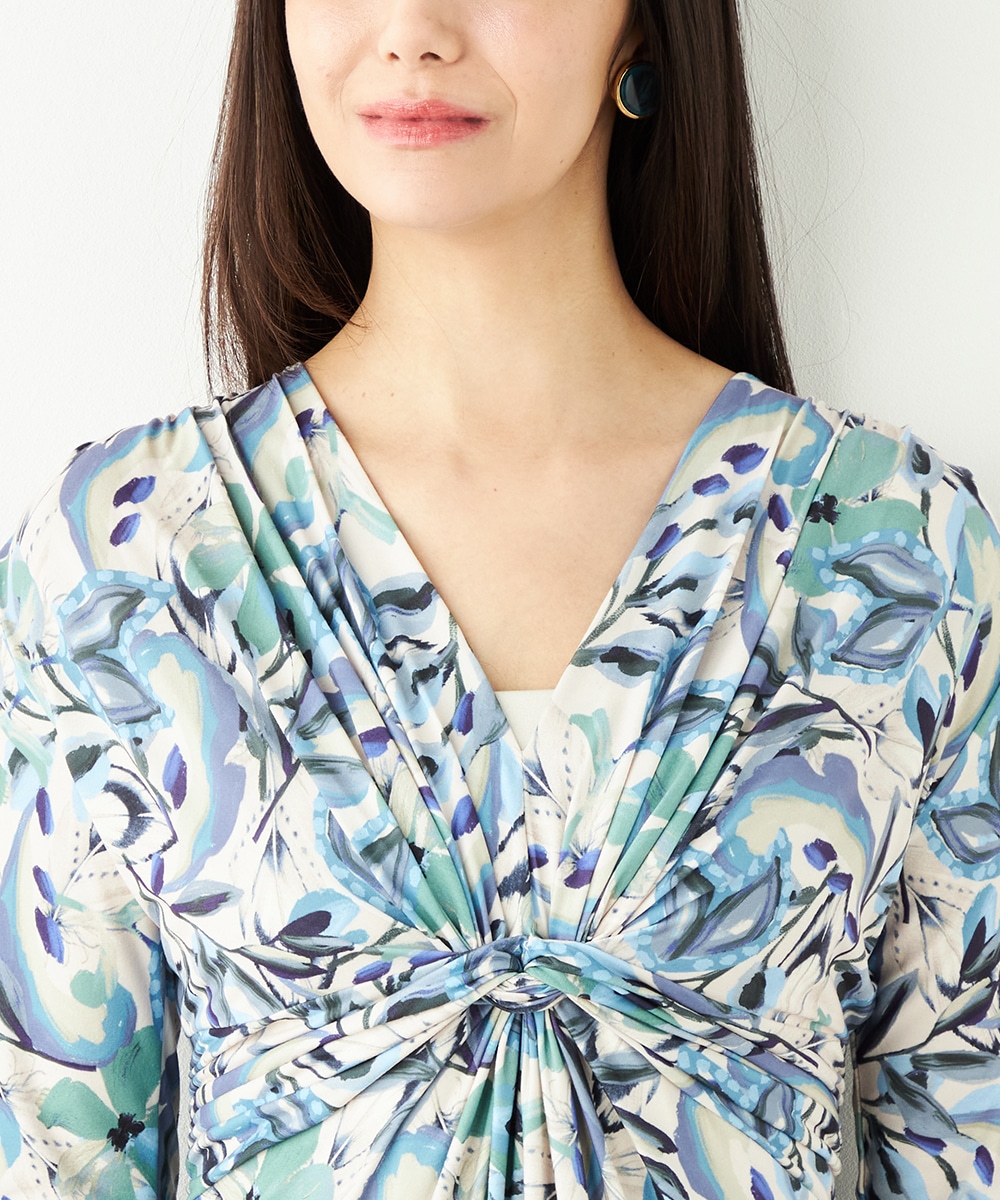 水彩調タッチのぼかし感が女性らしい柔らかな雰囲気を演出します。フロントはギャザーのくしゅくしゅ感がポイントのツイストデザイン。バックで結ぶベルトによって後ろ姿にメリハリがプラスされます。大人っぽくエレガントに着こなせるロング丈です。ソフトな風合いのジャージ素材を使用しています。