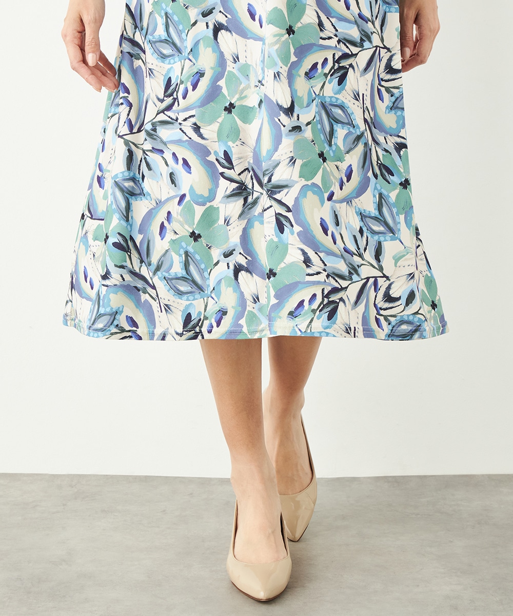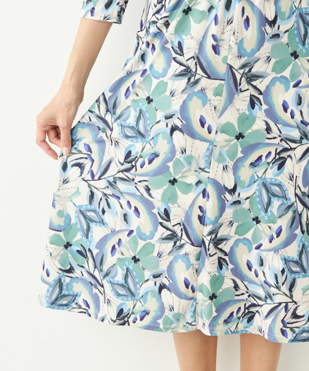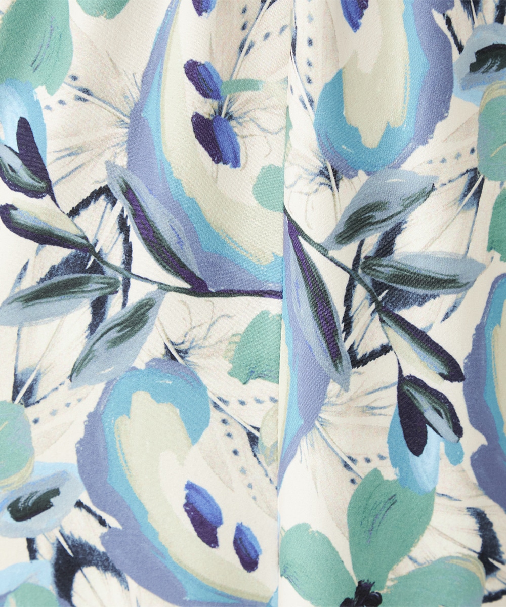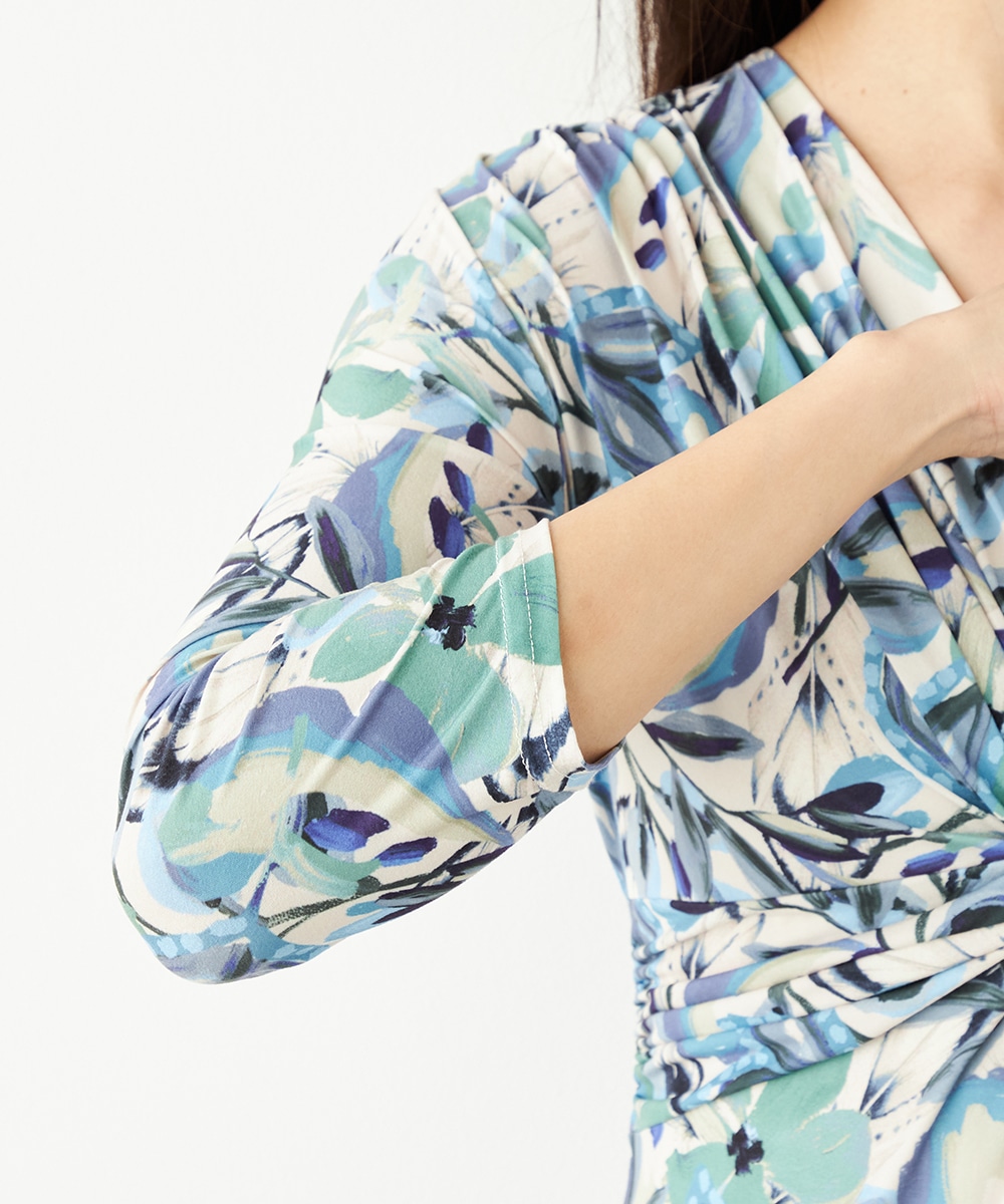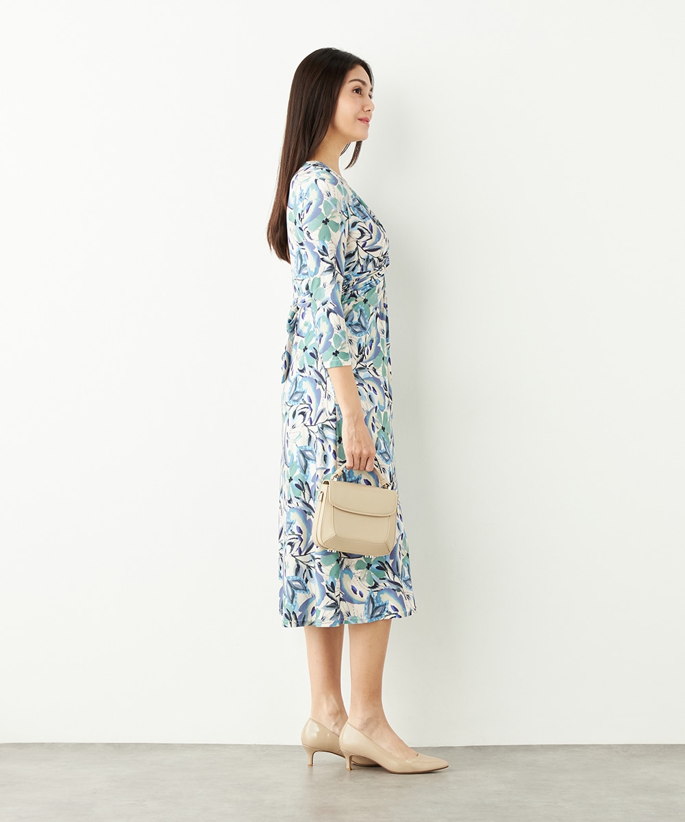水彩調タッチのぼかし感が女性らしい柔らかな雰囲気を演出します。フロントはギャザーのくしゅくしゅ感がポイントのツイストデザイン。バックで結ぶベルトによって後ろ姿にメリハリがプラスされます。大人っぽくエレガントに着こなせるロング丈です。ソフトな風合いのジャージ素材を使用しています。