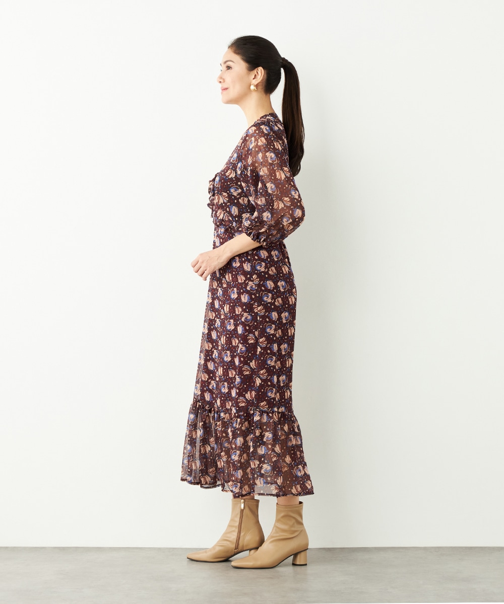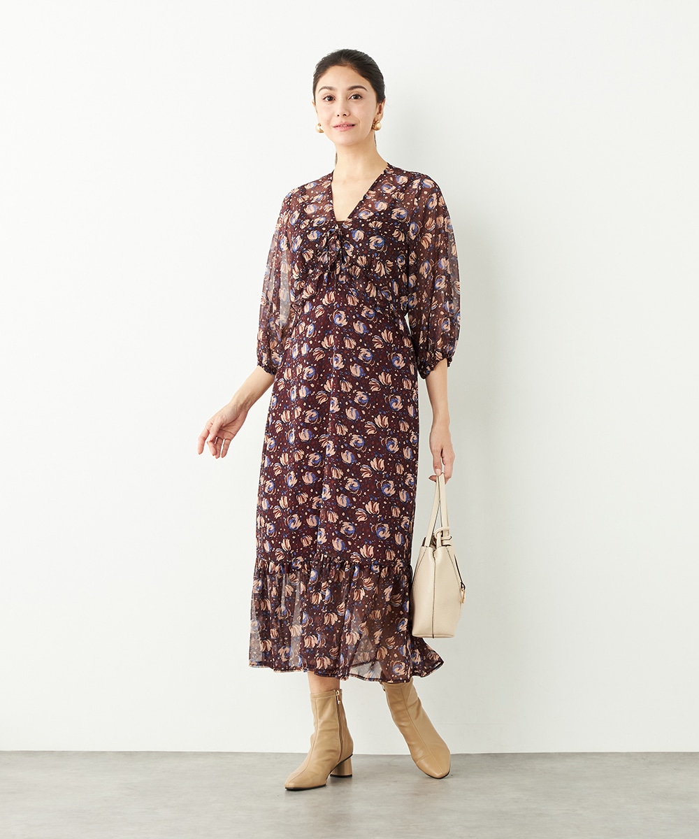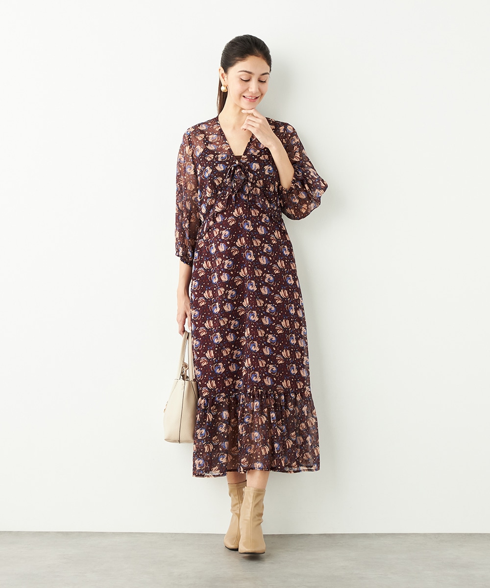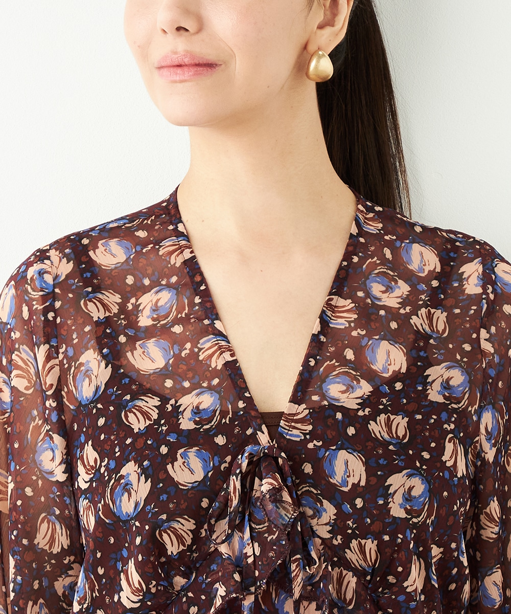 生地には繊細な透け感があり、女性らしくエレガントに着こなせます。胸元のプチフリルディテールやスカート部分のティアード切り替えが甘さを効かせるポイントです。深めのVネックデザインでフェイスラインはすっきり。長めの着丈が大人っぽさを演出して、幅広く活用できる1枚です。