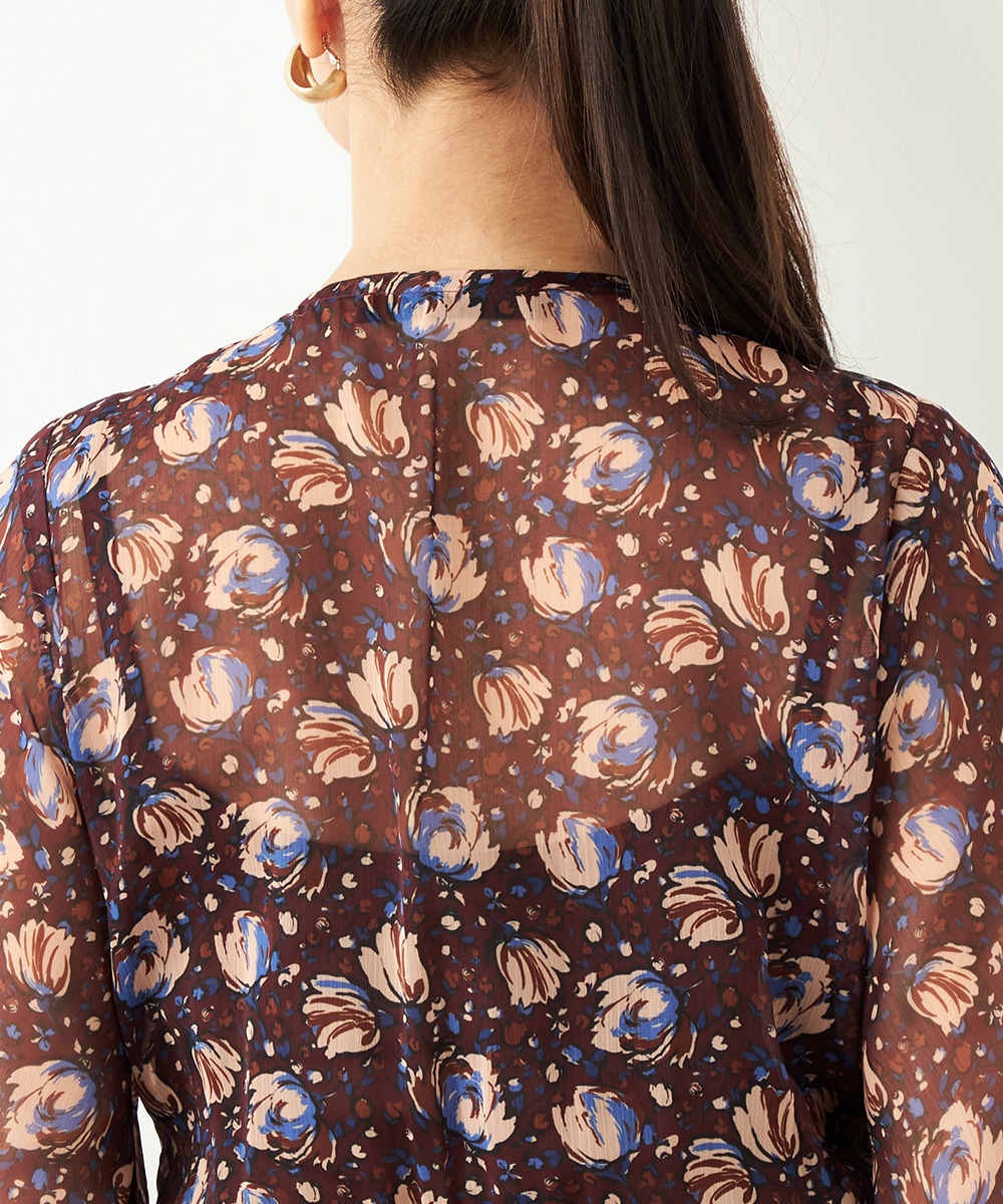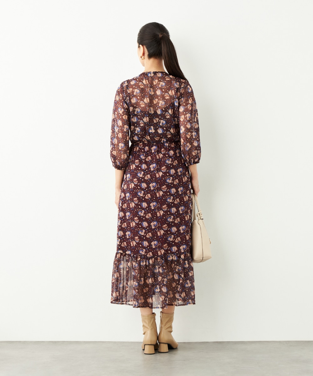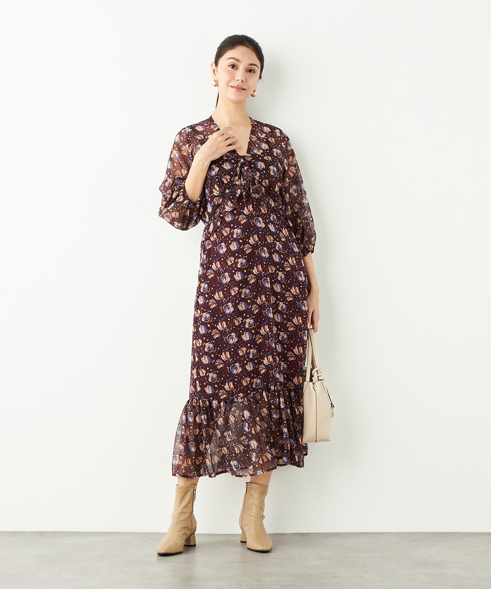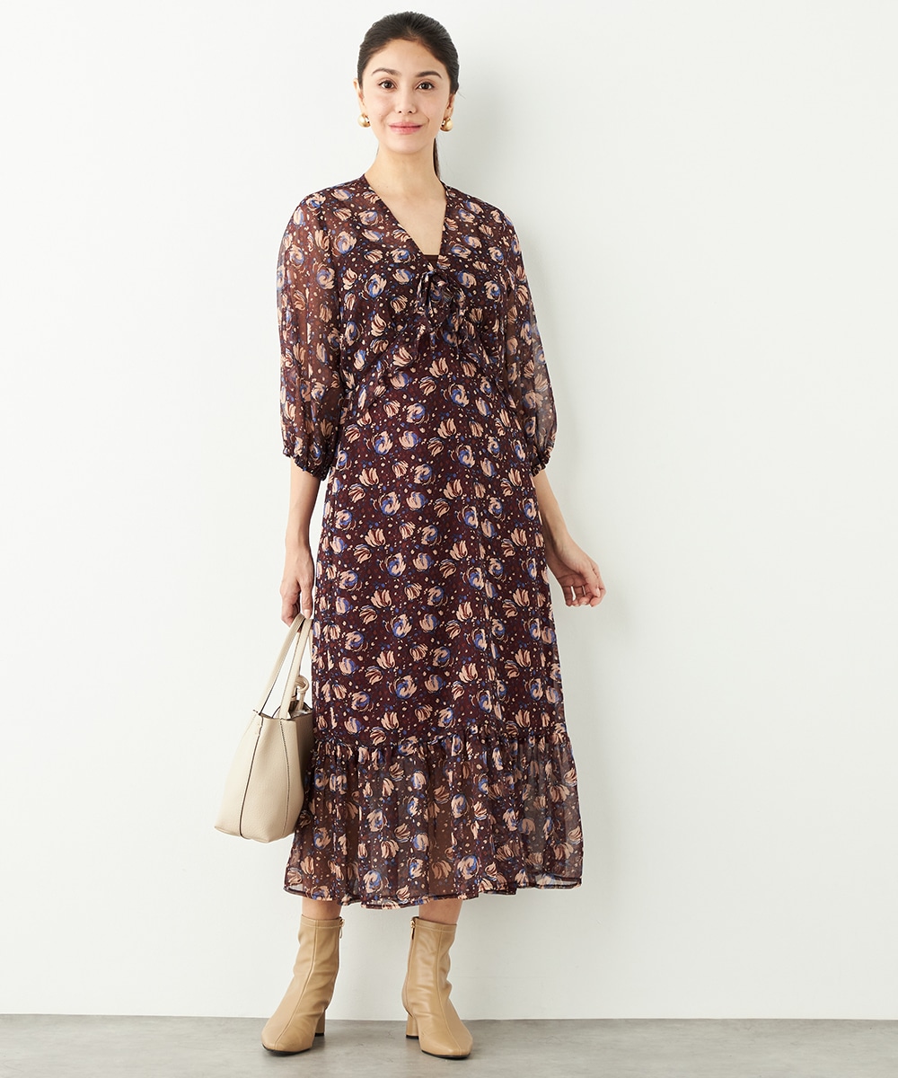 生地には繊細な透け感があり、女性らしくエレガントに着こなせます。胸元のプチフリルディテールやスカート部分のティアード切り替えが甘さを効かせるポイントです。深めのVネックデザインでフェイスラインはすっきり。長めの着丈が大人っぽさを演出して、幅広く活用できる1枚です。
