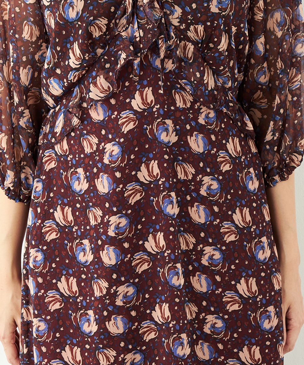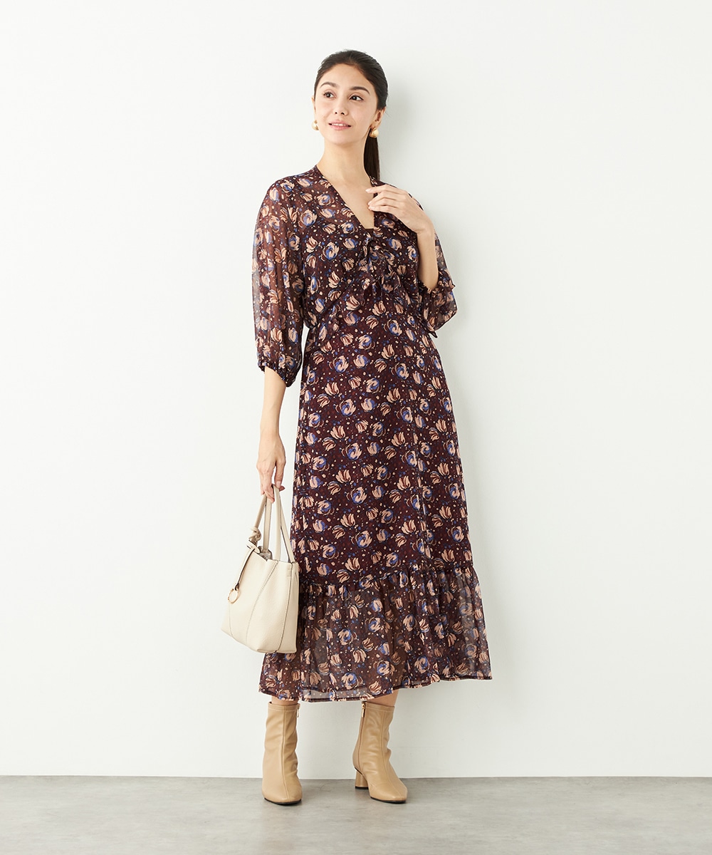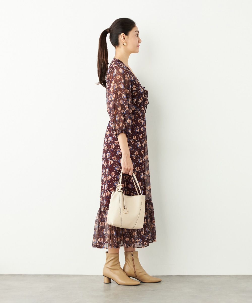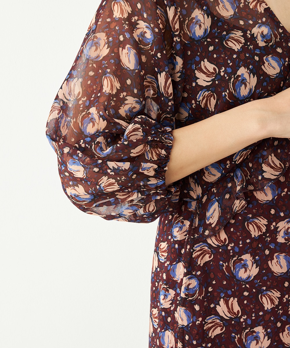 生地には繊細な透け感があり、女性らしくエレガントに着こなせます。胸元のプチフリルディテールやスカート部分のティアード切り替えが甘さを効かせるポイントです。深めのVネックデザインでフェイスラインはすっきり。長めの着丈が大人っぽさを演出して、幅広く活用できる1枚です。