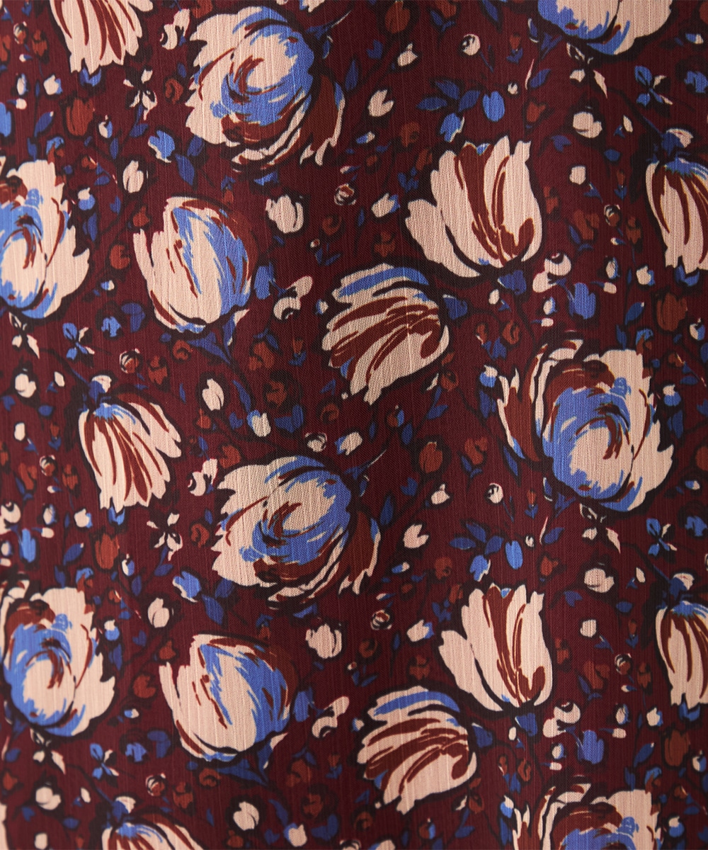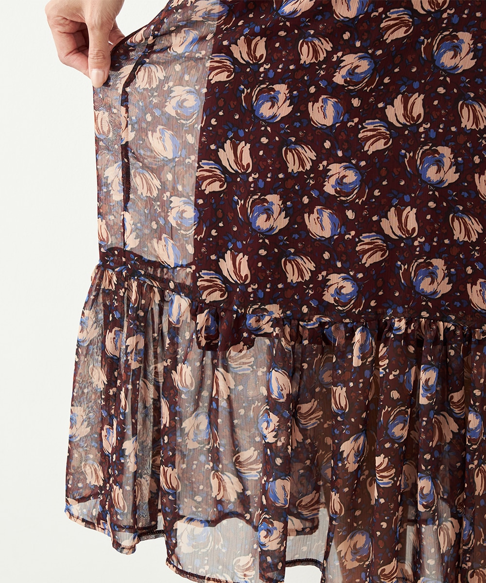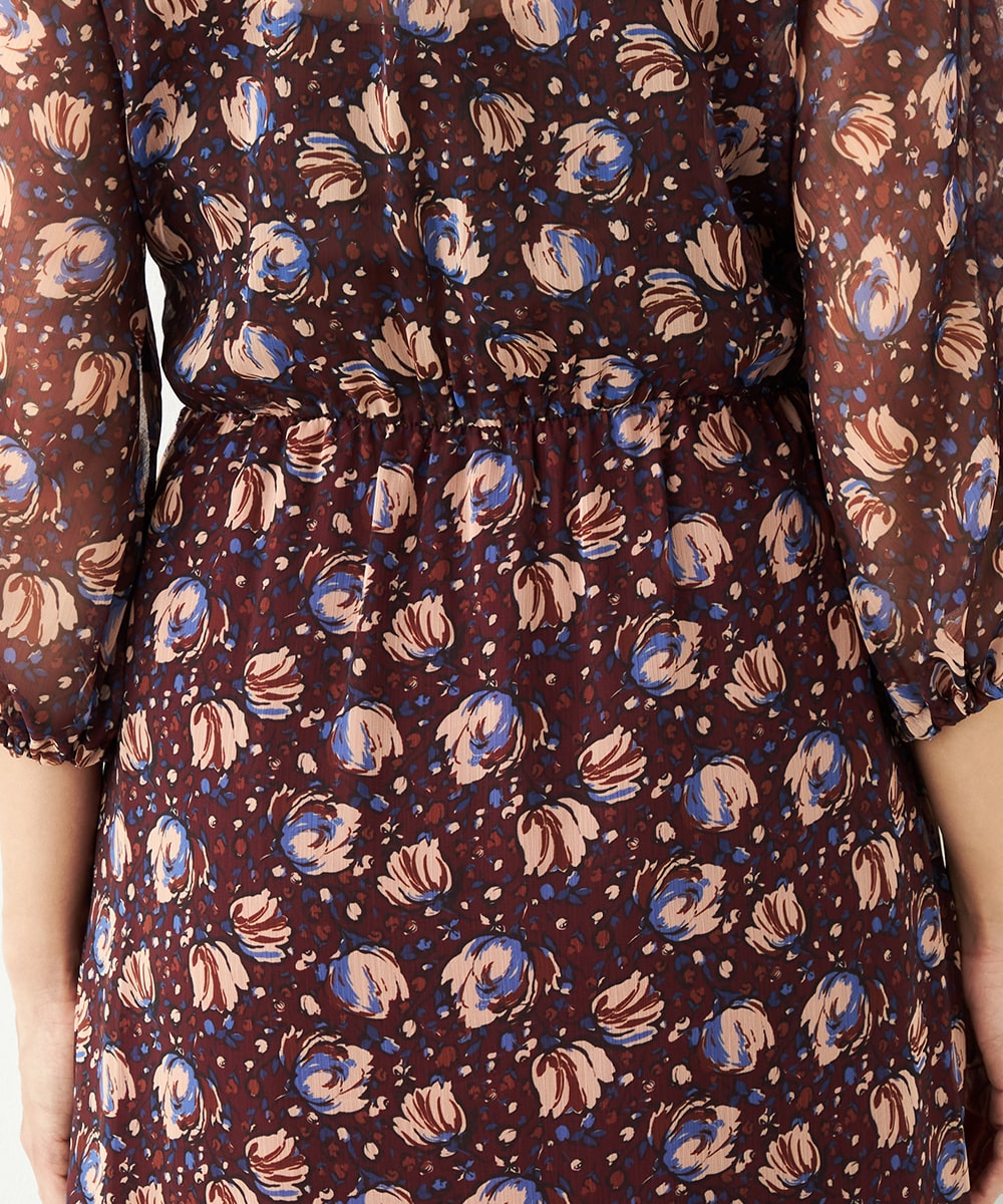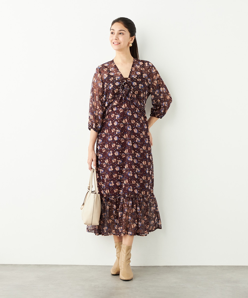 生地には繊細な透け感があり、女性らしくエレガントに着こなせます。胸元のプチフリルディテールやスカート部分のティアード切り替えが甘さを効かせるポイントです。深めのVネックデザインでフェイスラインはすっきり。長めの着丈が大人っぽさを演出して、幅広く活用できる1枚です。