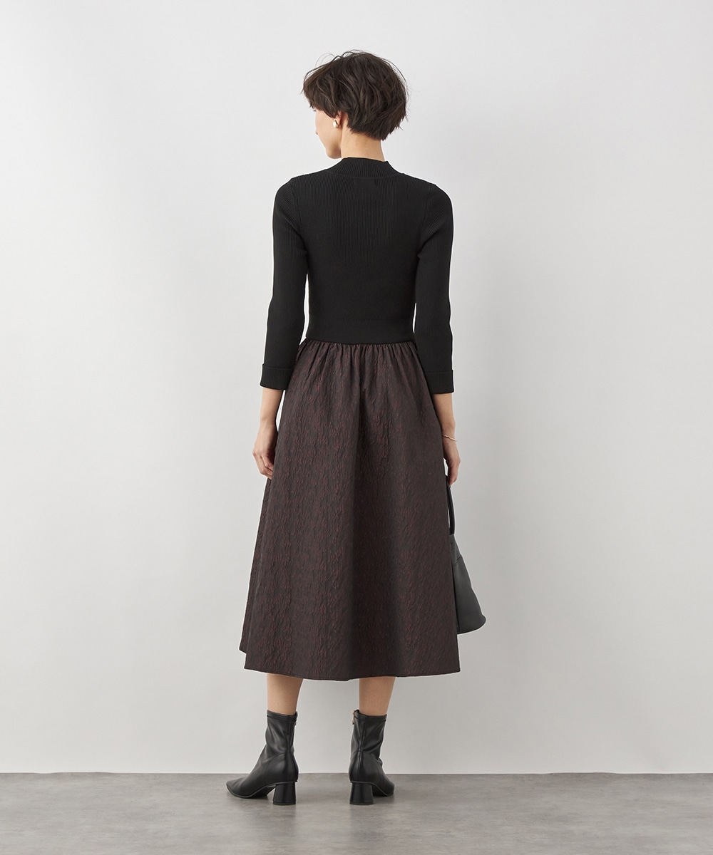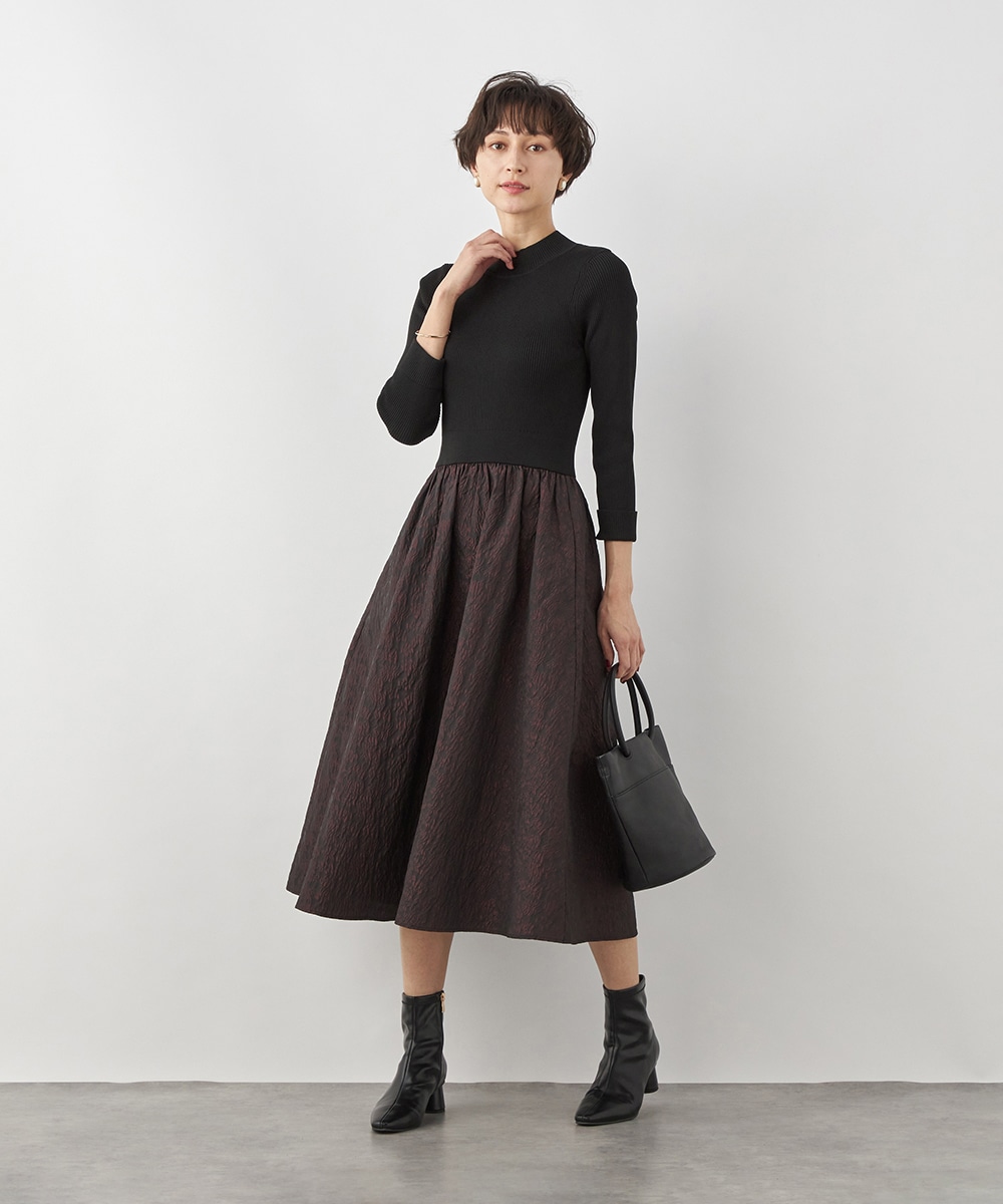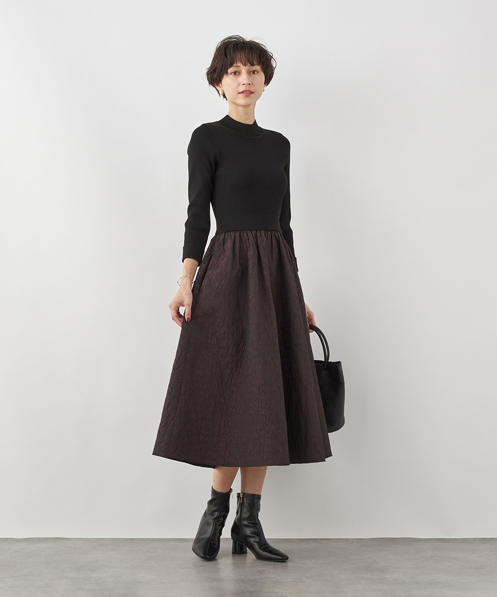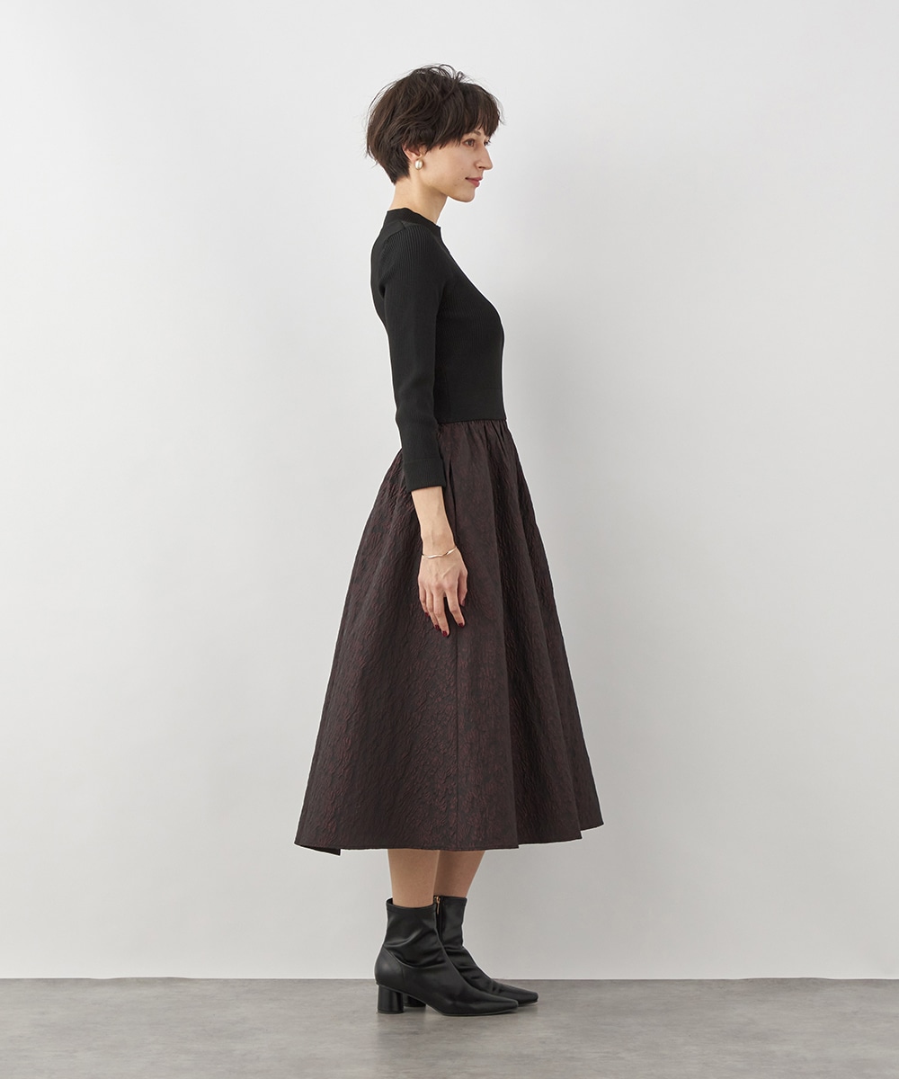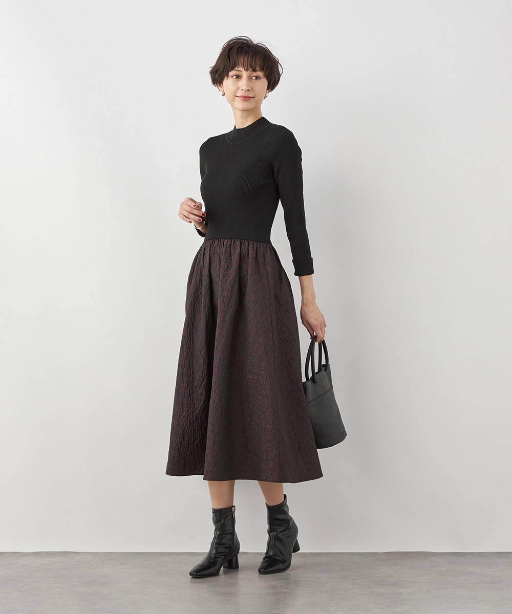 上身頃はポリエステル糸のニット、スカート部分は今季の気分にぴったりなジャカード素材を使用しています。さりげない柄の出方がエレガントな印象で、高級感のある表情も魅力です。適度なフレア感やミモレ丈のデザインはフェミニンさを引き立てます。アレンジ次第で幅広く活用できる1枚です。