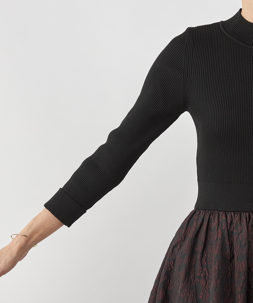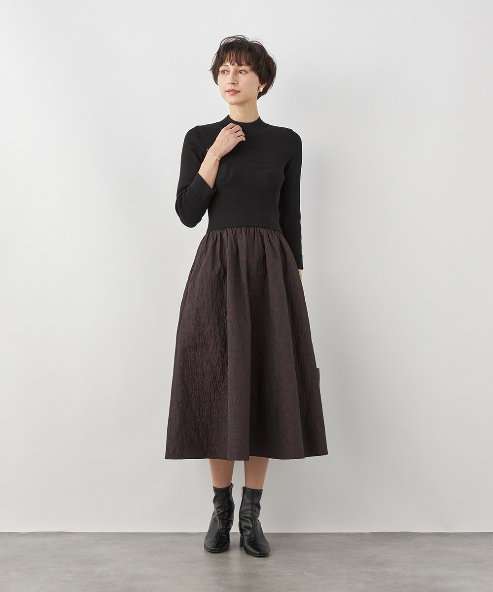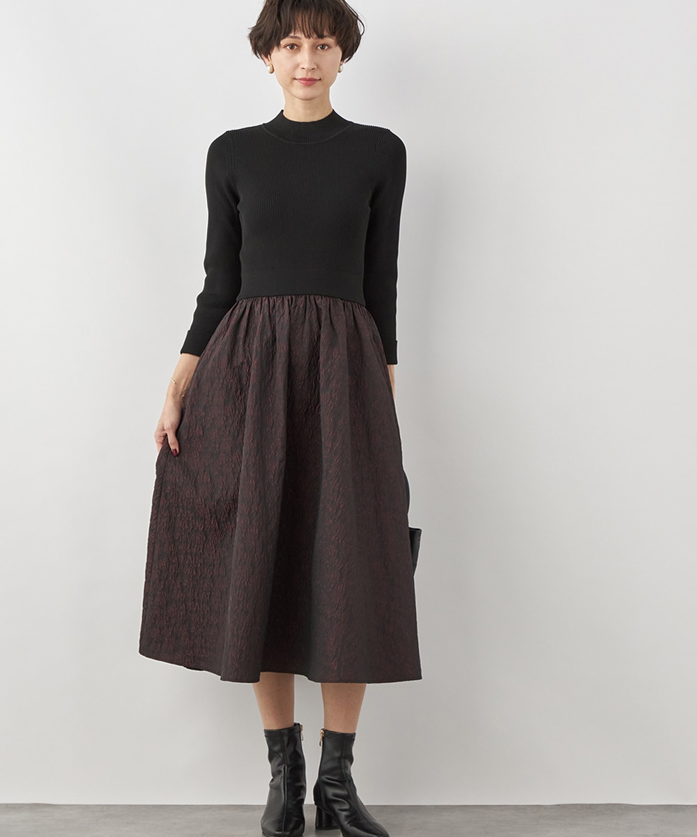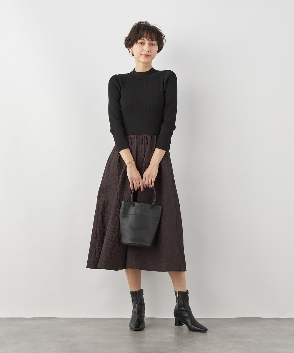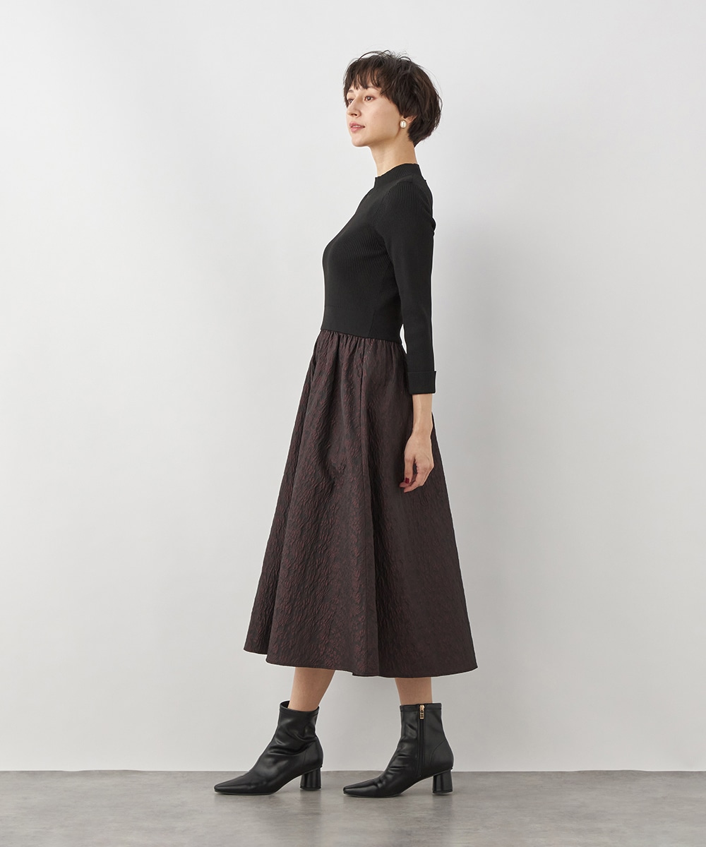 上身頃はポリエステル糸のニット、スカート部分は今季の気分にぴったりなジャカード素材を使用しています。さりげない柄の出方がエレガントな印象で、高級感のある表情も魅力です。適度なフレア感やミモレ丈のデザインはフェミニンさを引き立てます。アレンジ次第で幅広く活用できる1枚です。