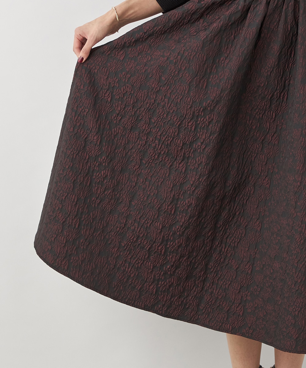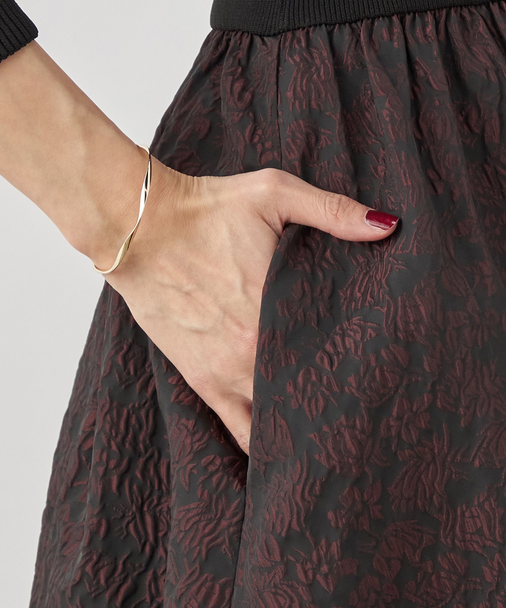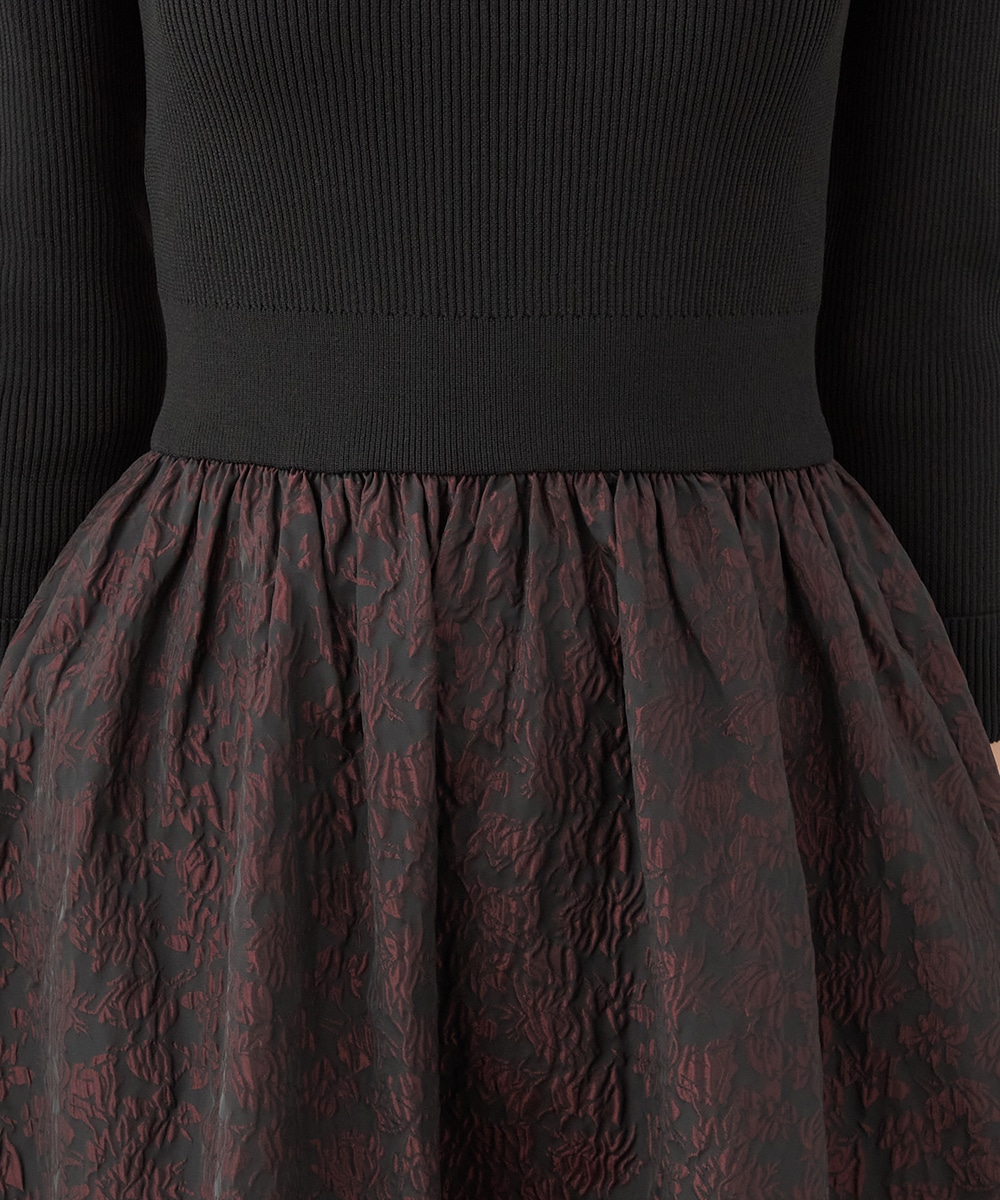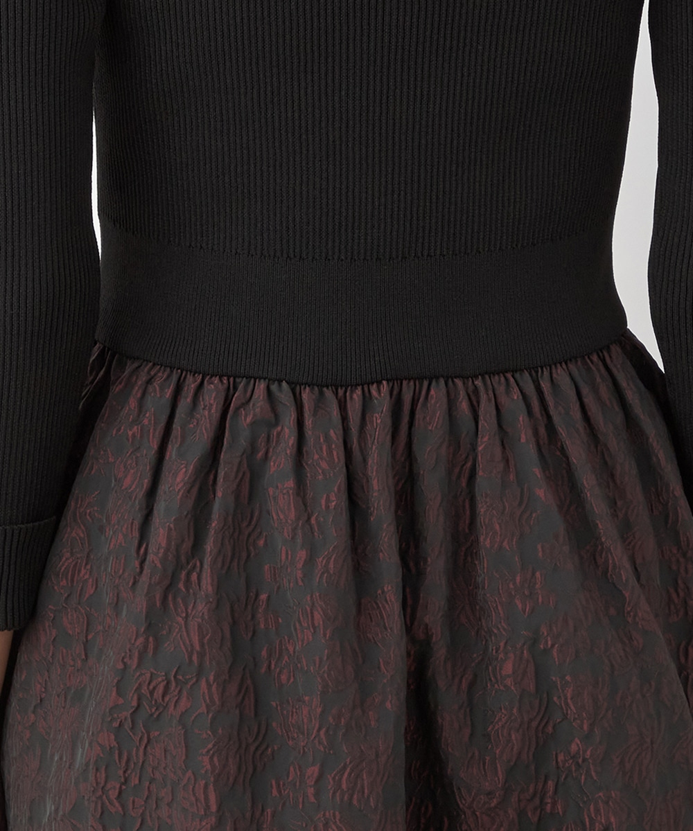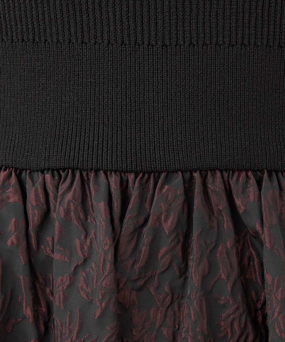 上身頃はポリエステル糸のニット、スカート部分は今季の気分にぴったりなジャカード素材を使用しています。さりげない柄の出方がエレガントな印象で、高級感のある表情も魅力です。適度なフレア感やミモレ丈のデザインはフェミニンさを引き立てます。アレンジ次第で幅広く活用できる1枚です。