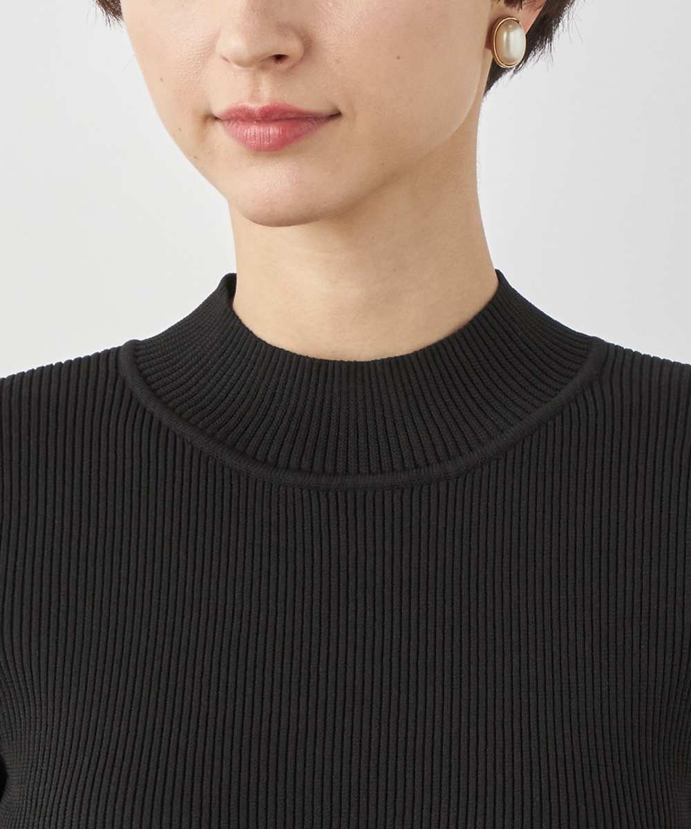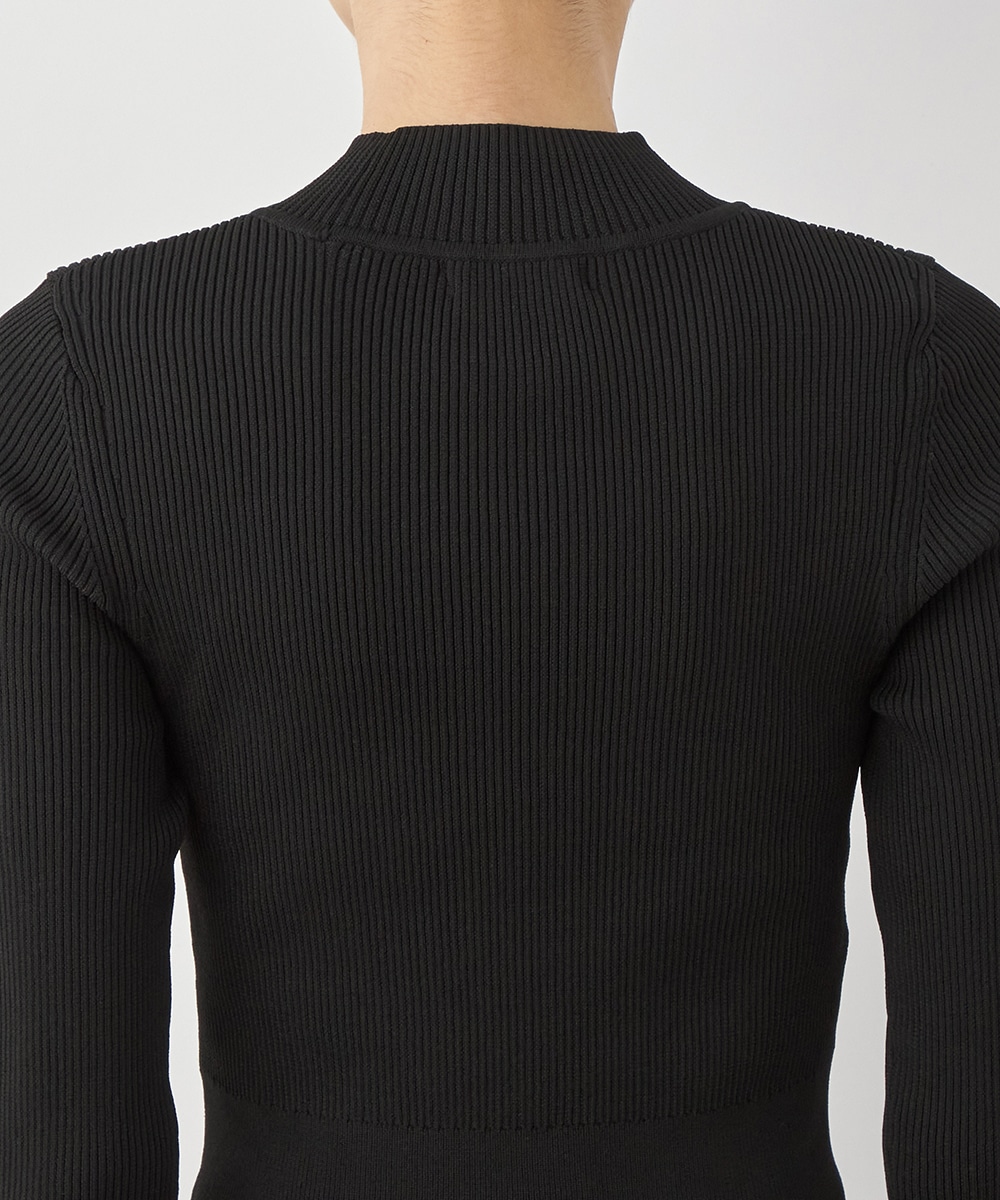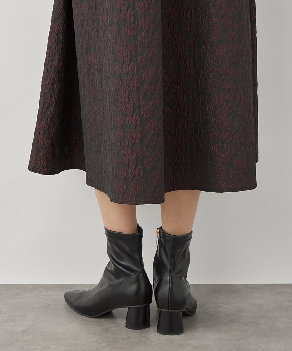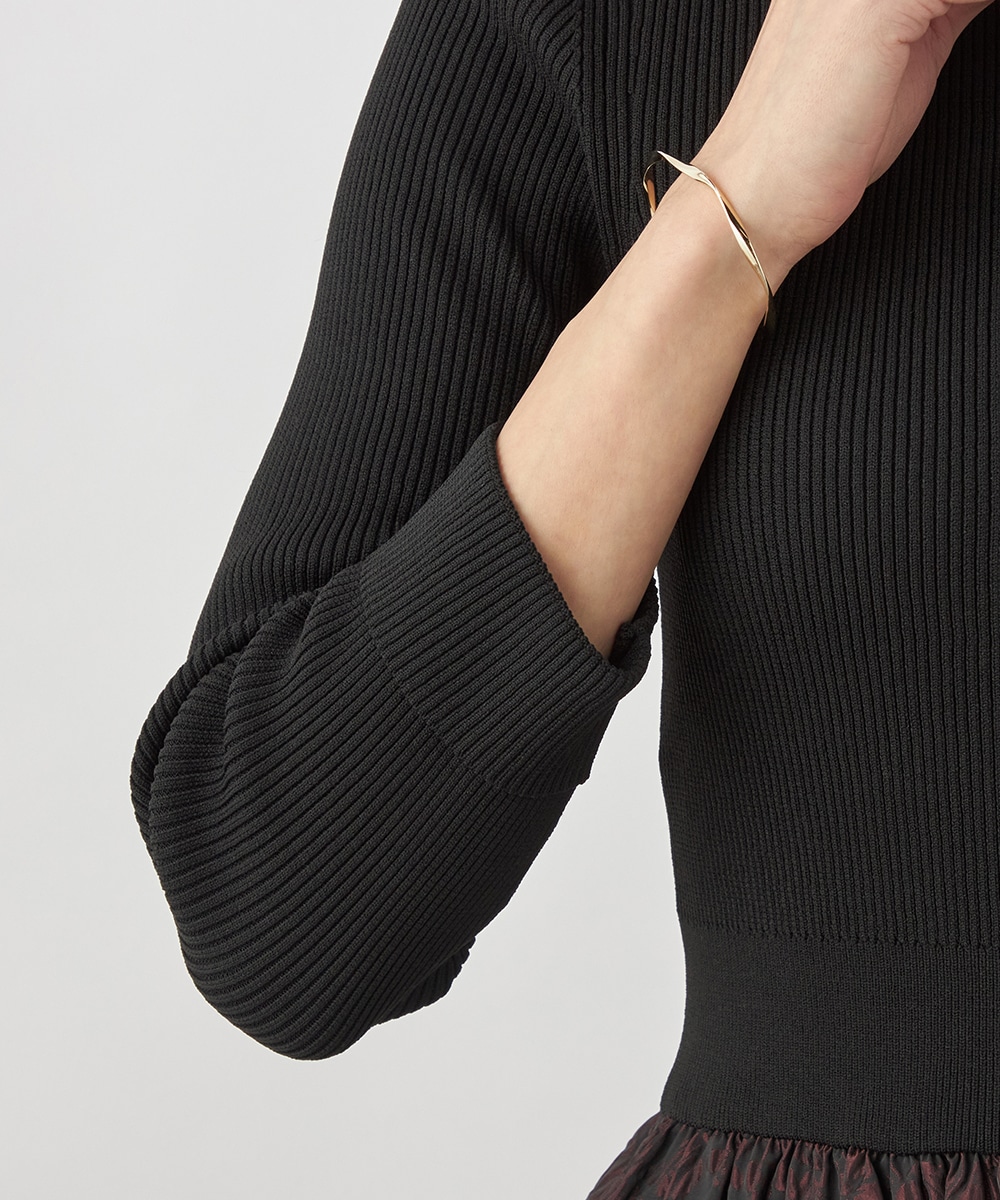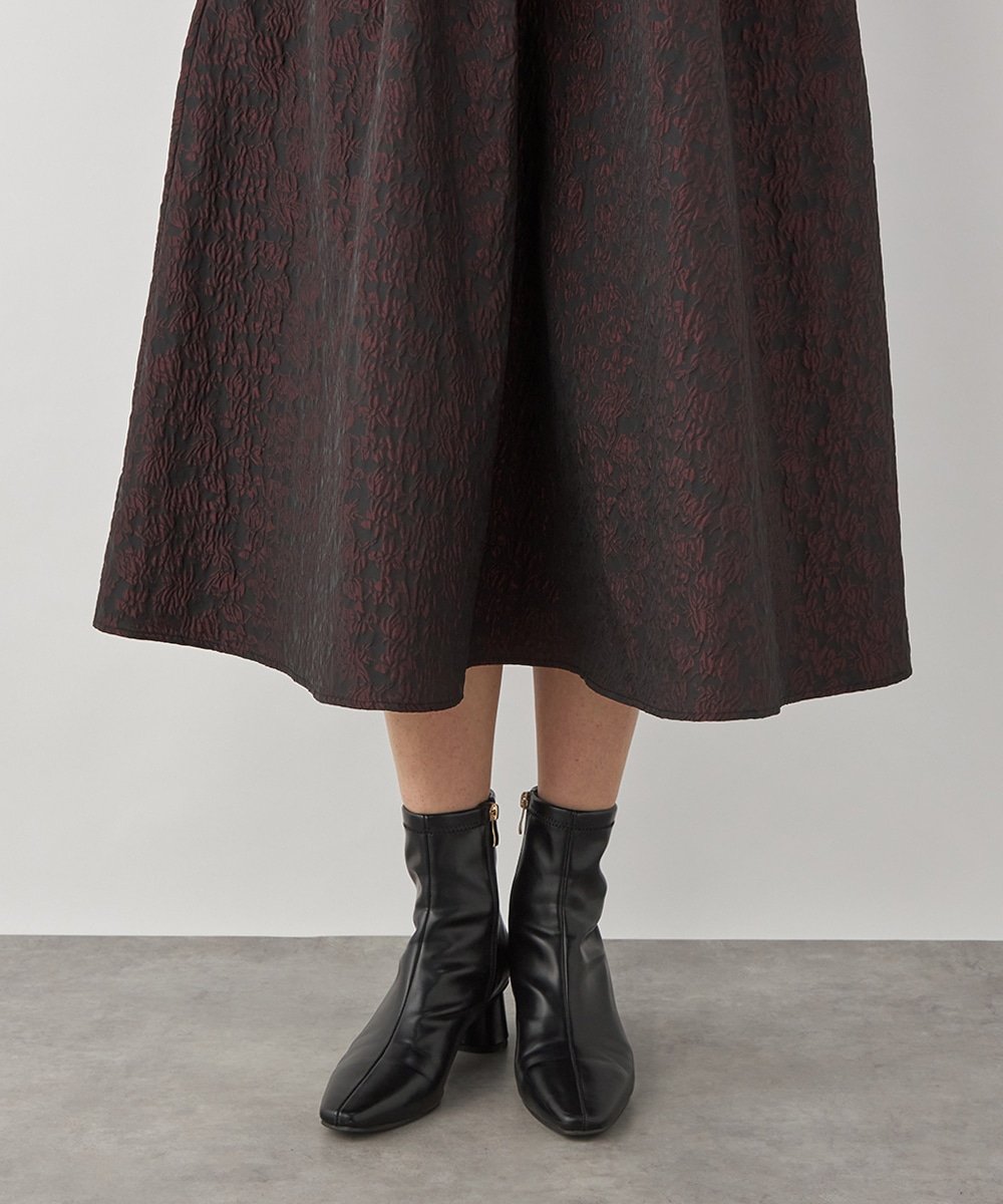 上身頃はポリエステル糸のニット、スカート部分は今季の気分にぴったりなジャカード素材を使用しています。さりげない柄の出方がエレガントな印象で、高級感のある表情も魅力です。適度なフレア感やミモレ丈のデザインはフェミニンさを引き立てます。アレンジ次第で幅広く活用できる1枚です。