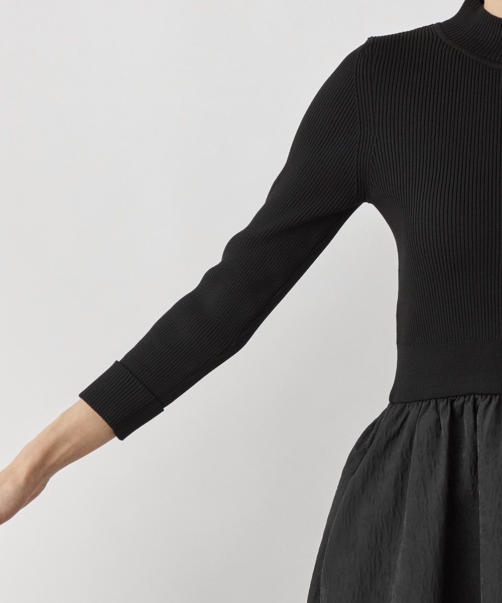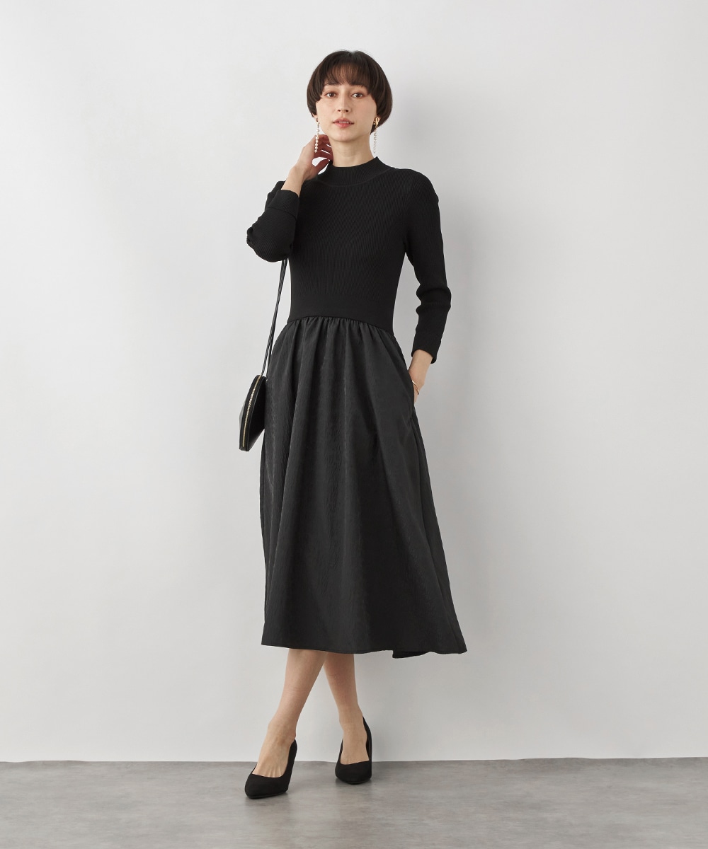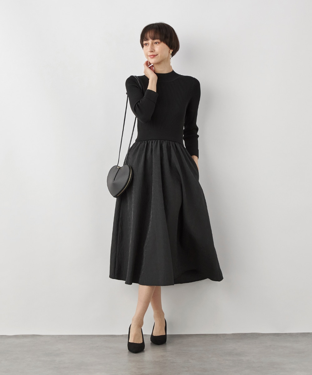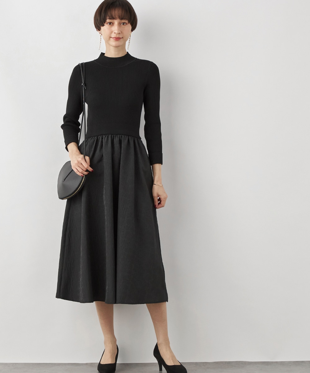 素材感のコントラストがポイント、メリハリが効いたドッキングワンピース。
