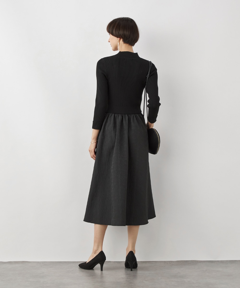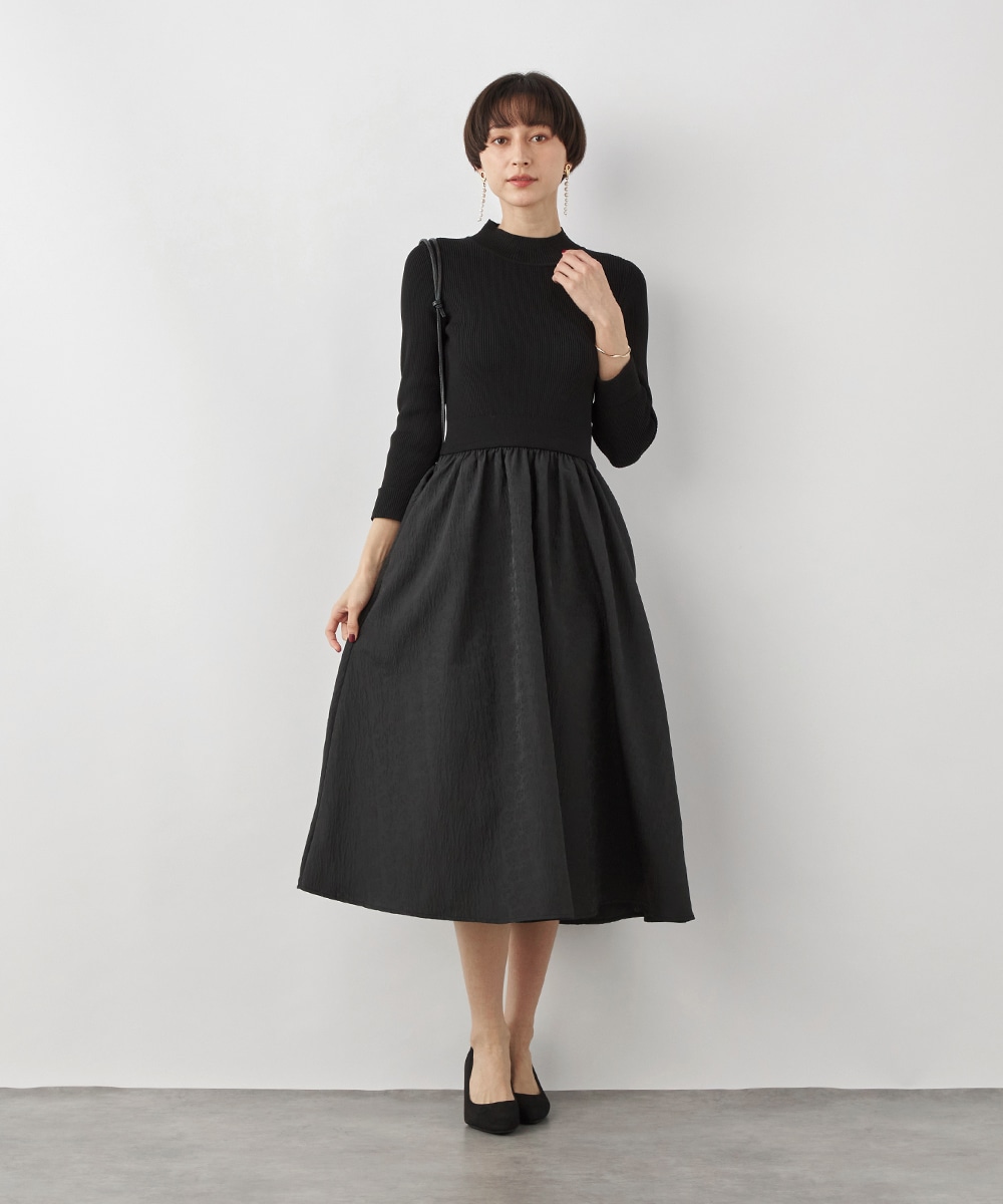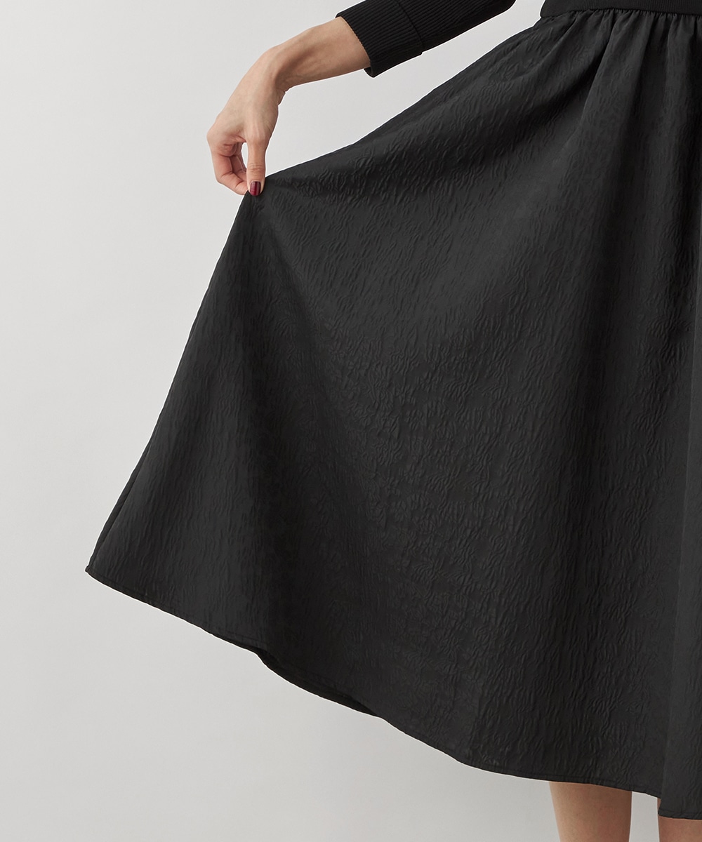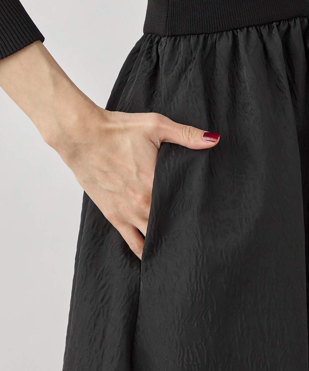 上身頃はポリエステル糸のニット、スカート部分は今季の気分にぴったりなジャカード素材を使用しています。さりげない柄の出方がエレガントな印象で、高級感のある表情も魅力です。適度なフレア感やミモレ丈のデザインはフェミニンさを引き立てます。アレンジ次第で幅広く活用できる1枚です。