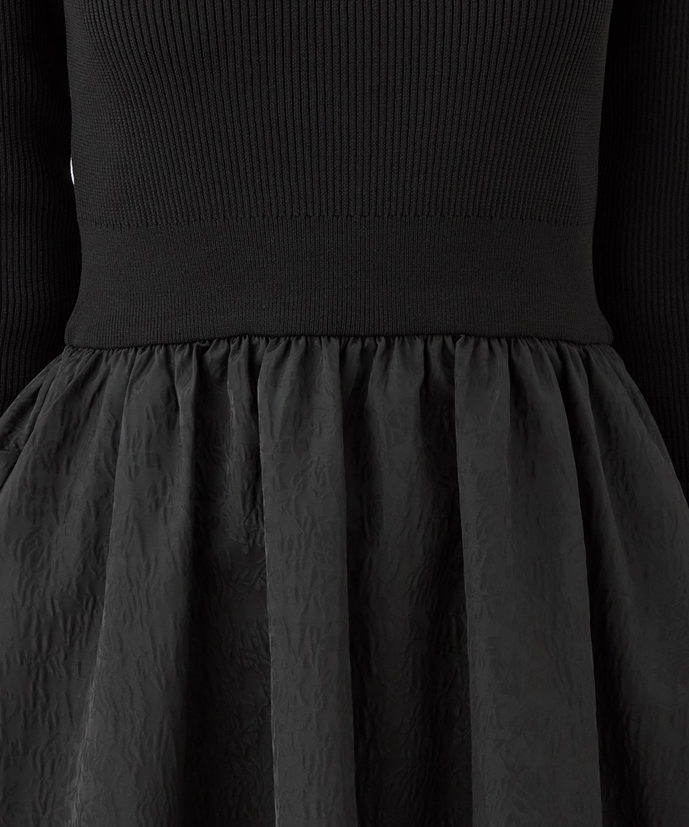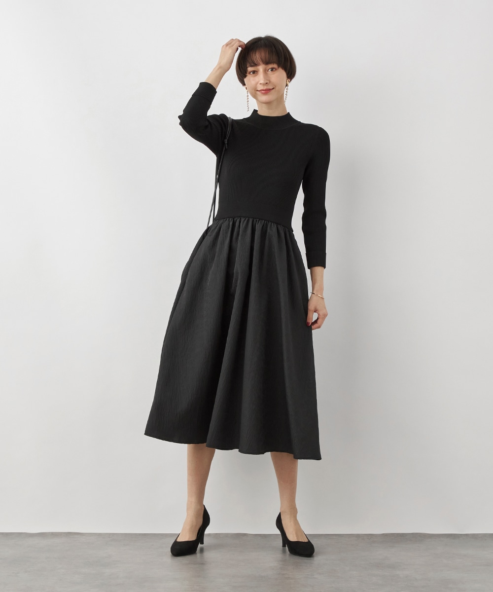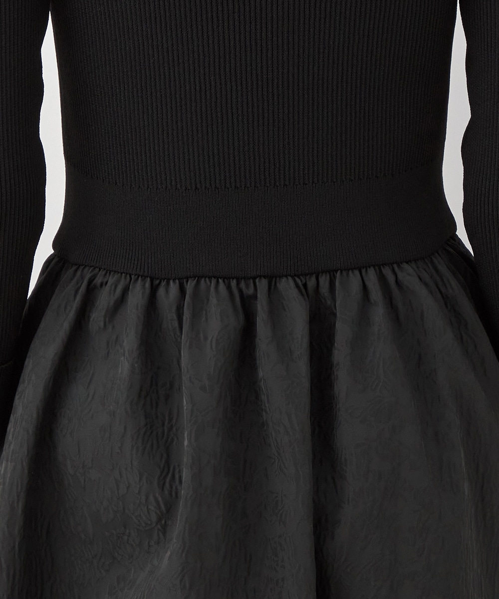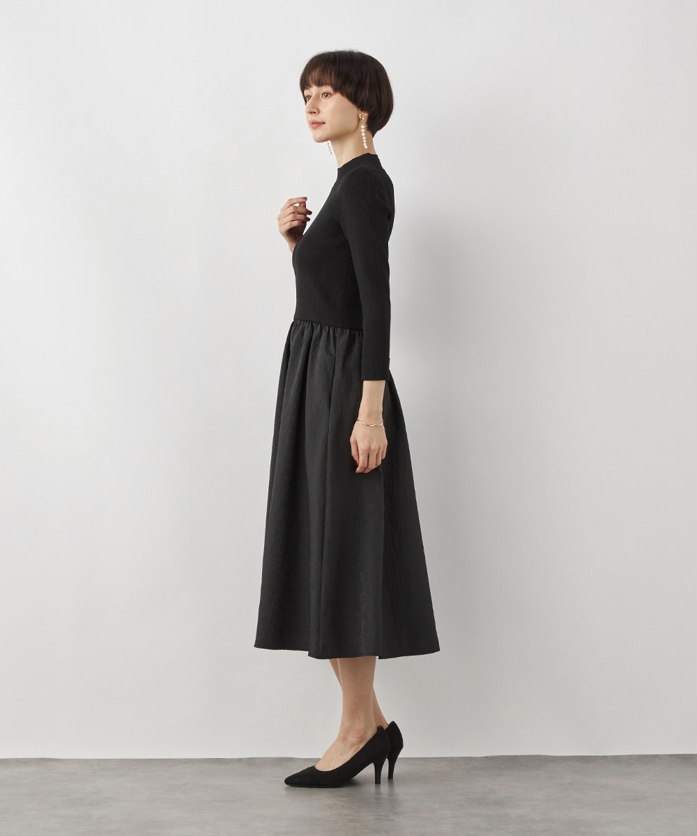上身頃はポリエステル糸のニット、スカート部分は今季の気分にぴったりなジャカード素材を使用しています。さりげない柄の出方がエレガントな印象で、高級感のある表情も魅力です。適度なフレア感やミモレ丈のデザインはフェミニンさを引き立てます。アレンジ次第で幅広く活用できる1枚です。