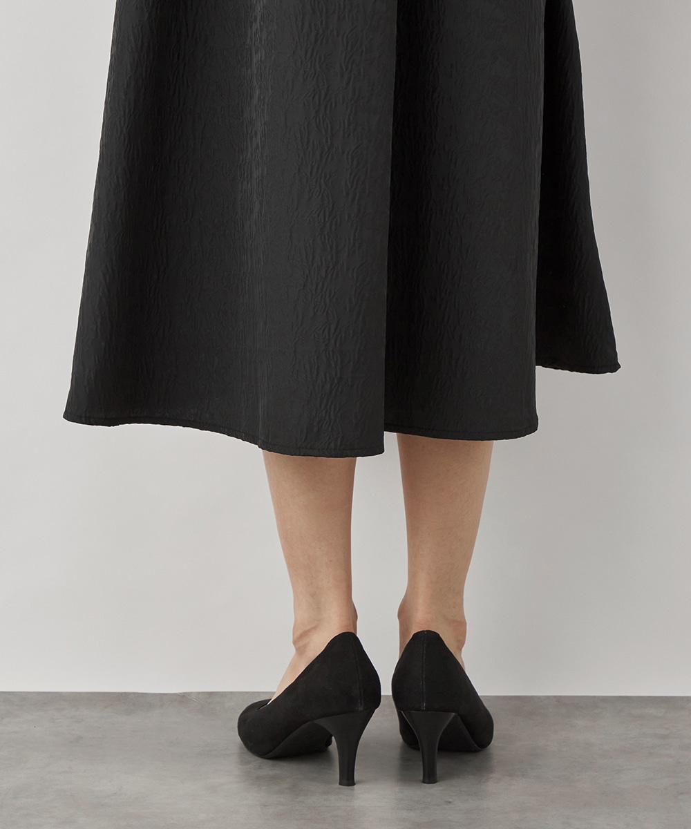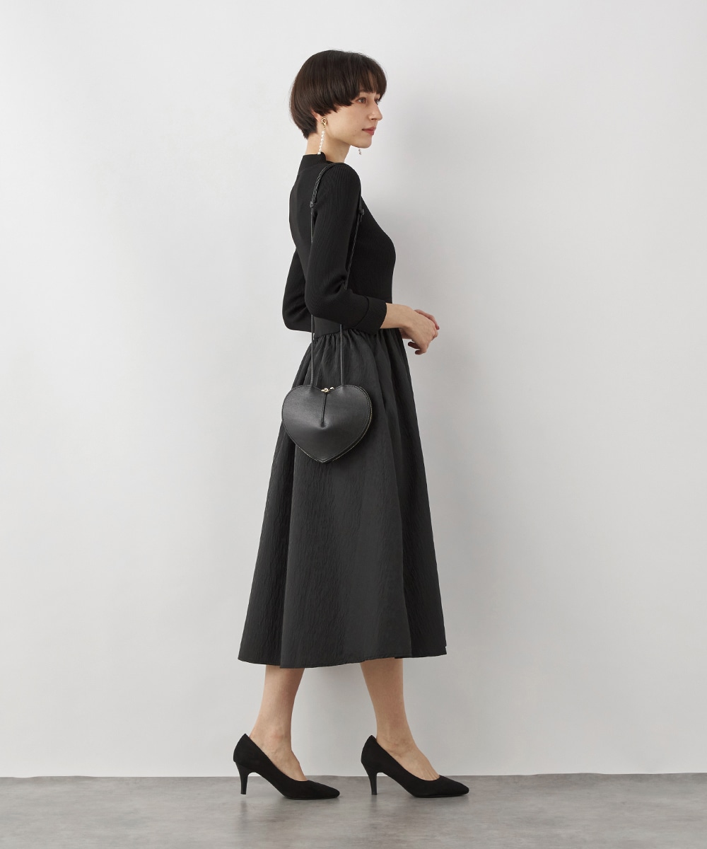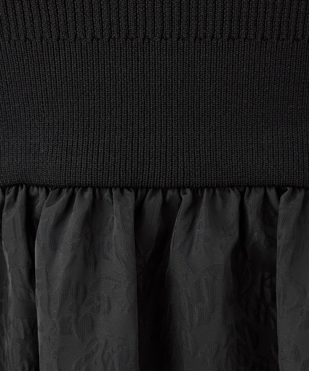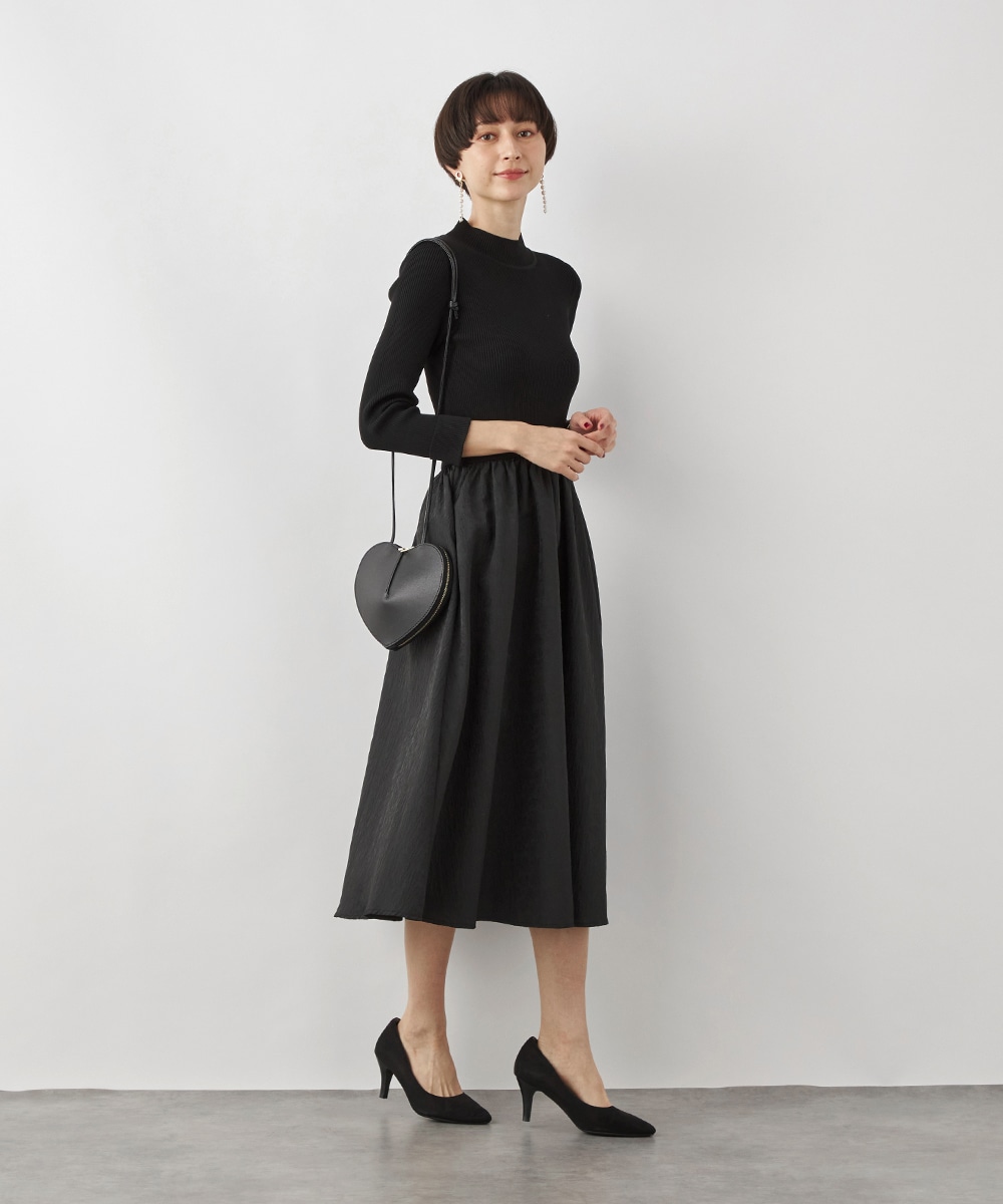 上身頃はポリエステル糸のニット、スカート部分は今季の気分にぴったりなジャカード素材を使用しています。さりげない柄の出方がエレガントな印象で、高級感のある表情も魅力です。適度なフレア感やミモレ丈のデザインはフェミニンさを引き立てます。アレンジ次第で幅広く活用できる1枚です。