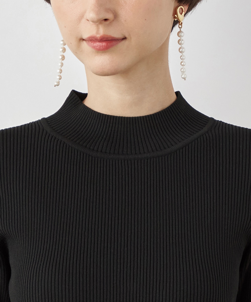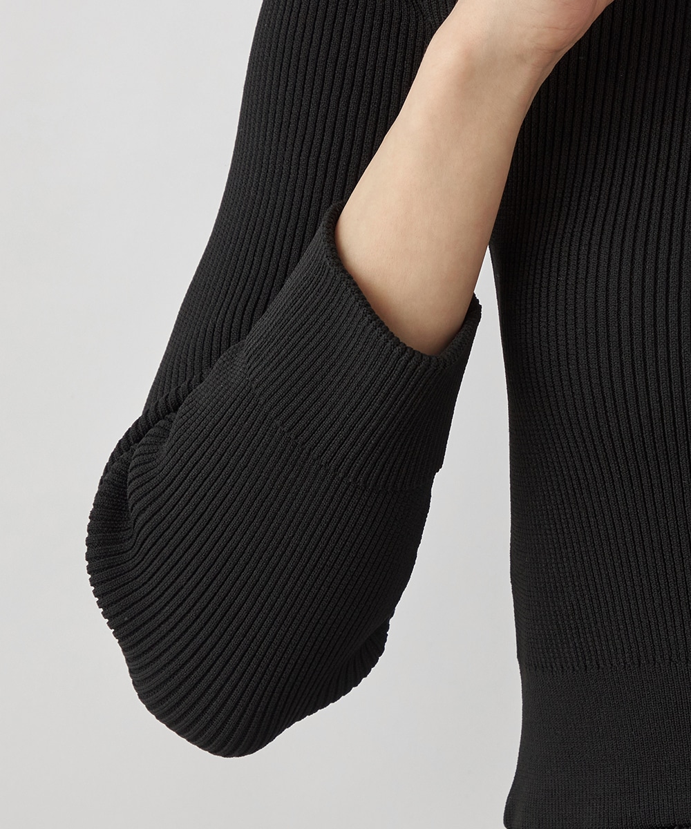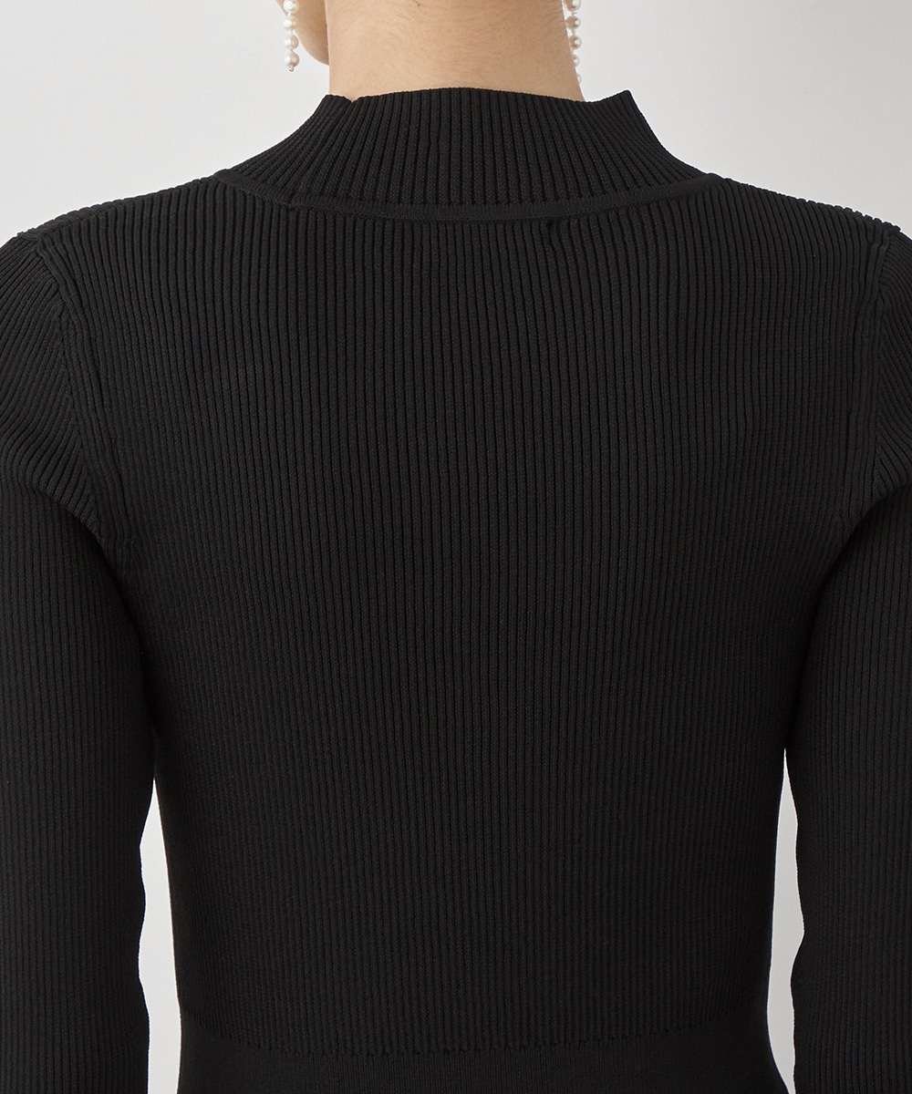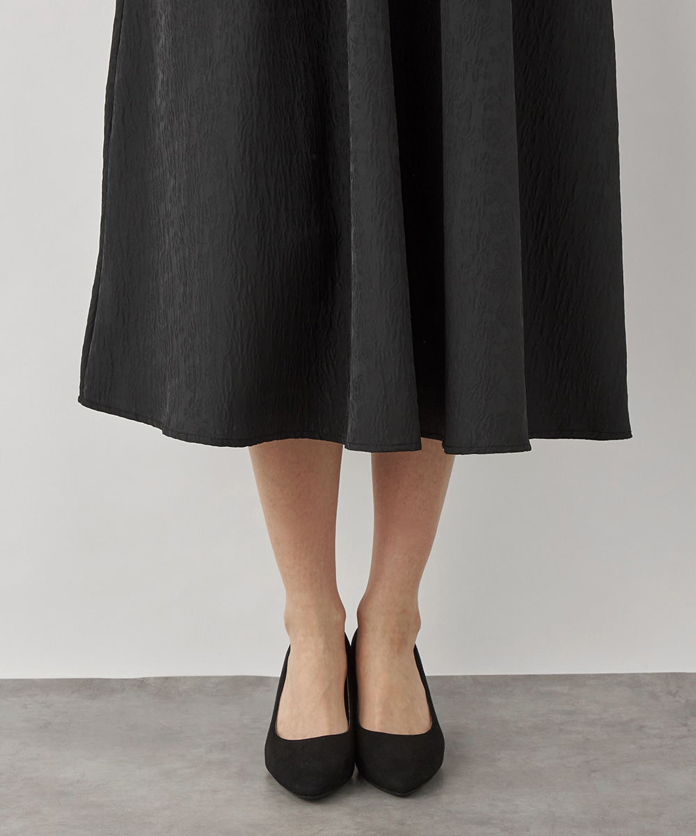 上身頃はポリエステル糸のニット、スカート部分は今季の気分にぴったりなジャカード素材を使用しています。さりげない柄の出方がエレガントな印象で、高級感のある表情も魅力です。適度なフレア感やミモレ丈のデザインはフェミニンさを引き立てます。アレンジ次第で幅広く活用できる1枚です。