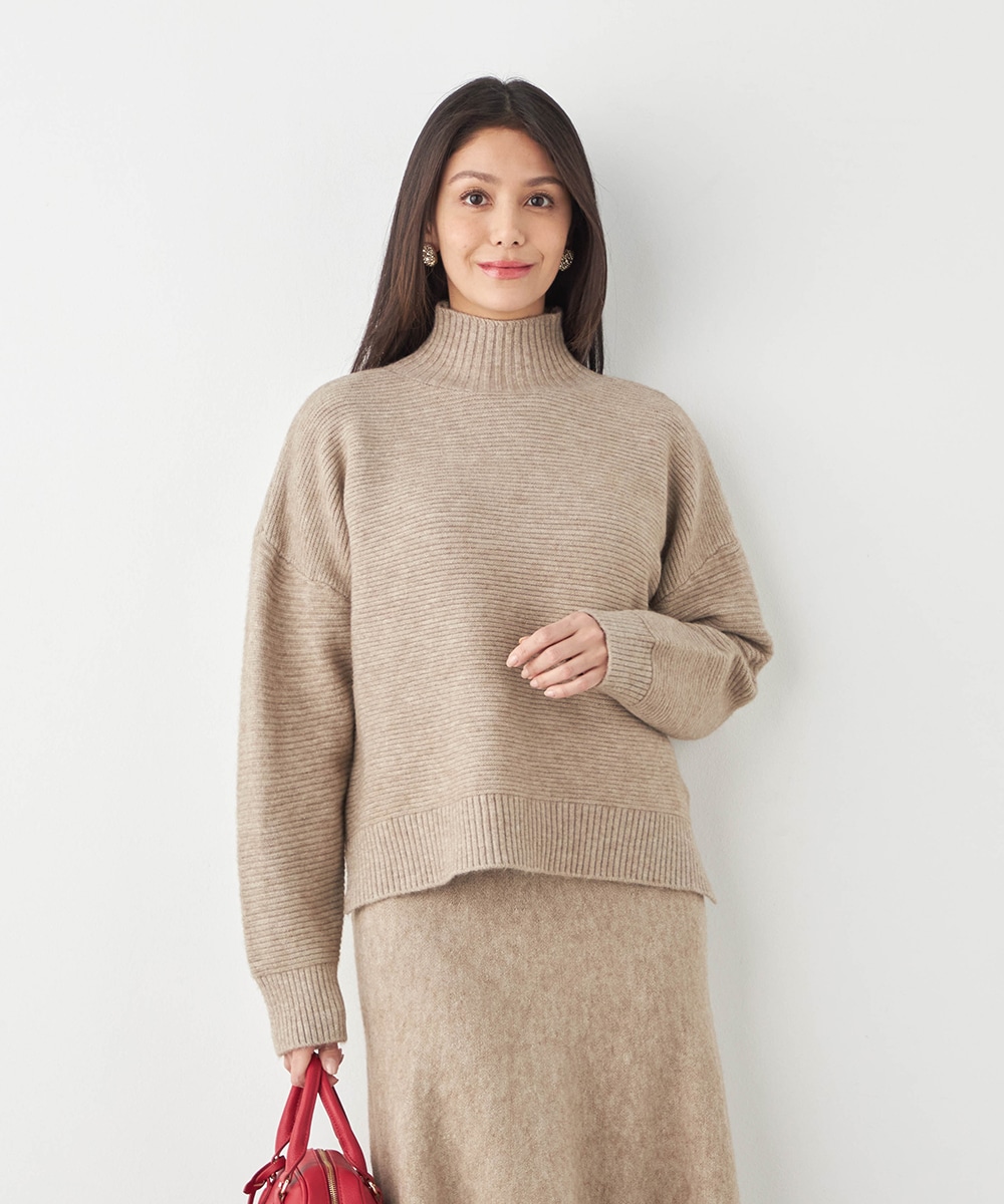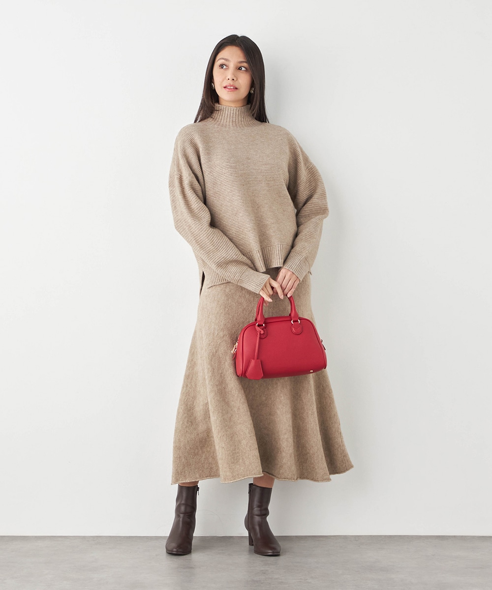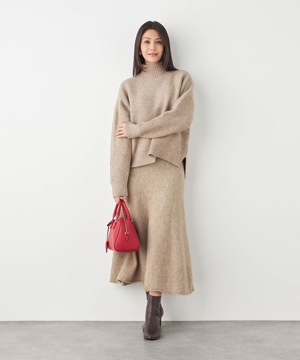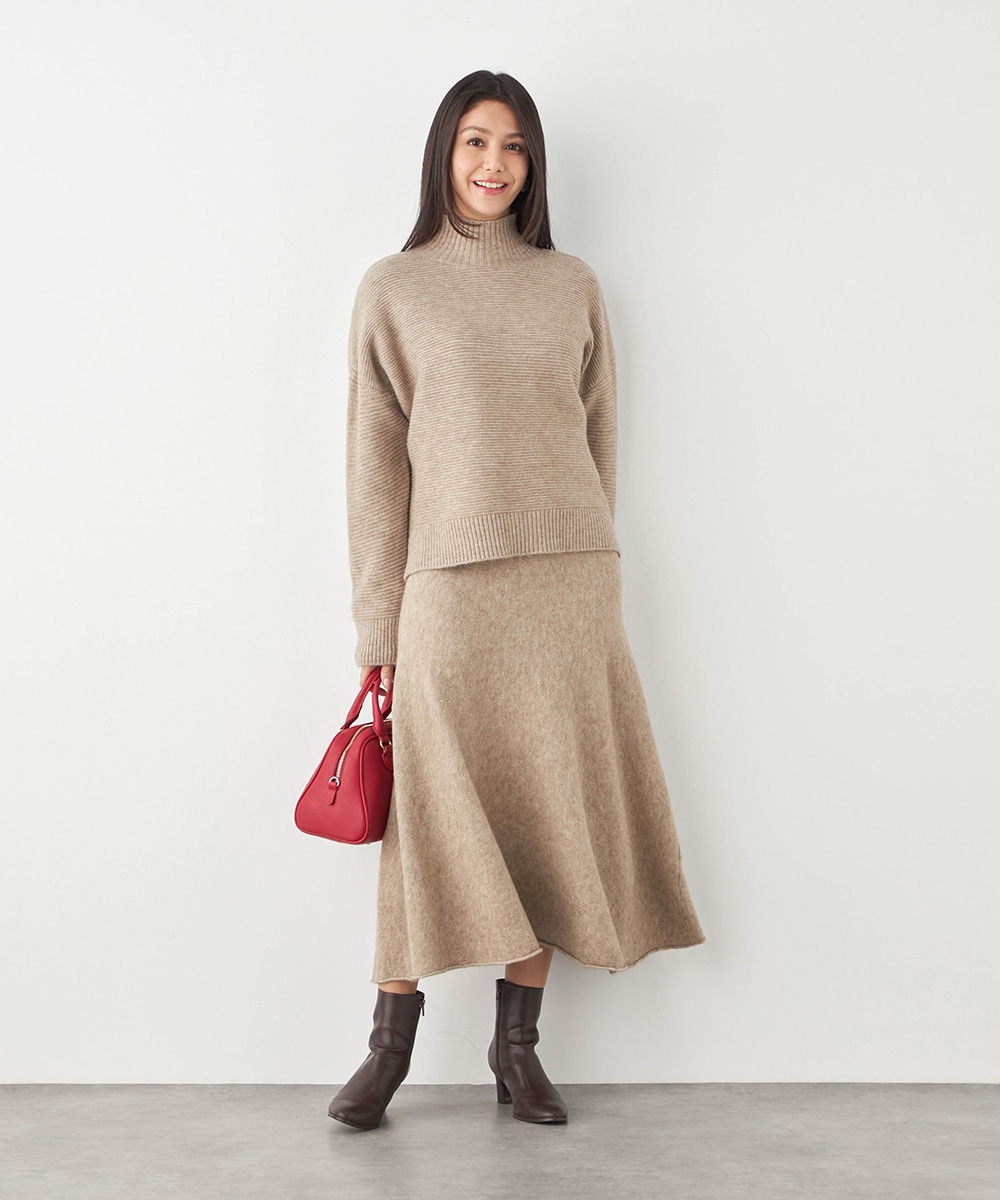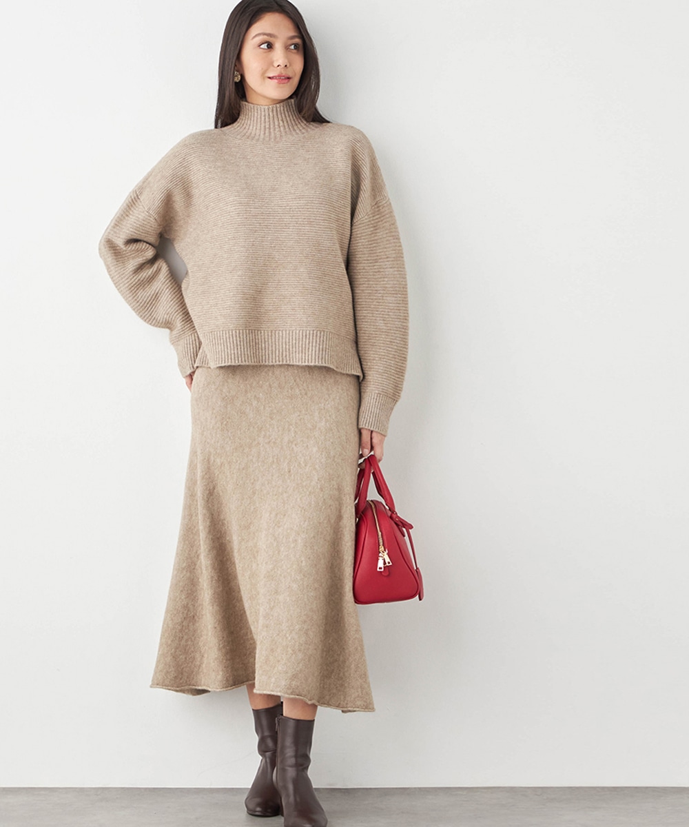 トップスは見た目も着心地も秋冬シーズンらしい印象のハイネックデザインです。ドロップショルダーのゆったりとしたシルエットがトレンドにマッチ。スカートはほどよいフレアシルエットとロング丈で大人っぽくフェミニンに穿きこなせます。ソフトな風合いでドレープがきれいに出るのも特徴です。