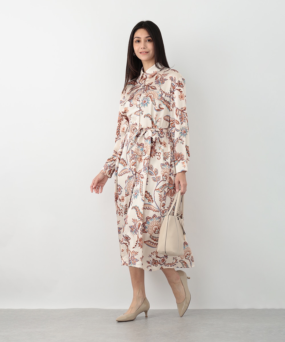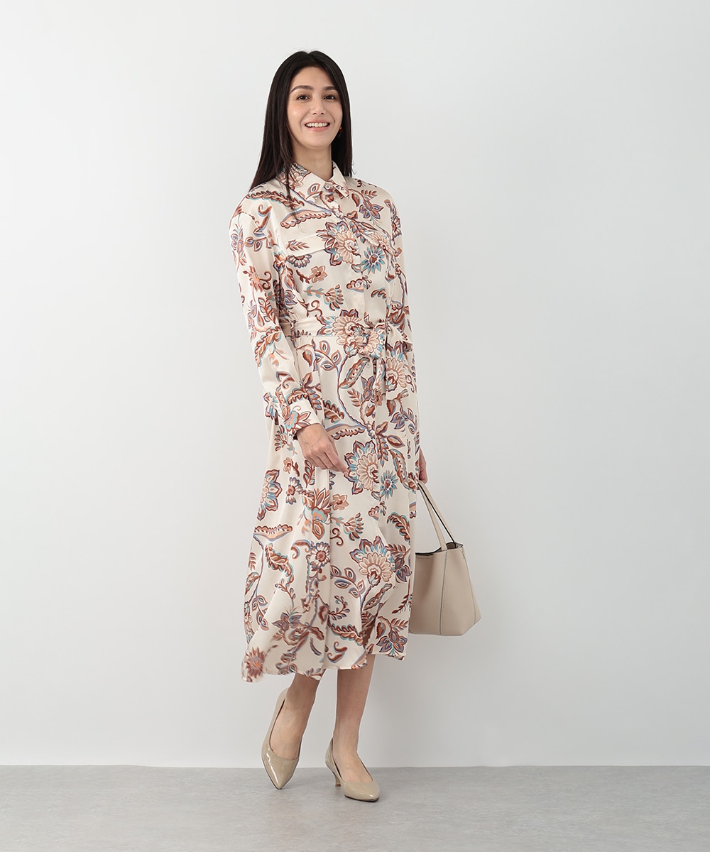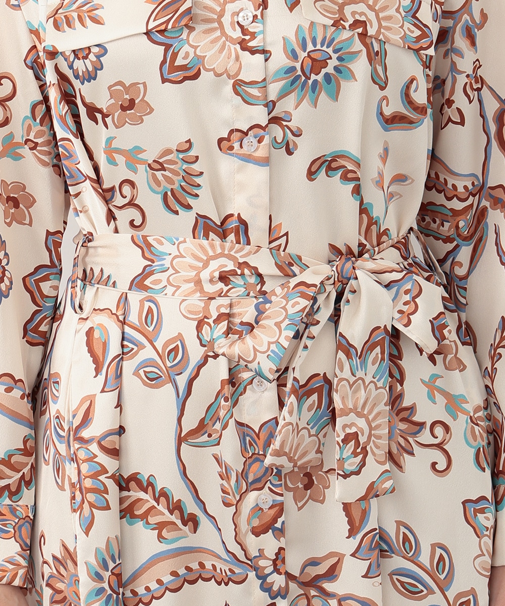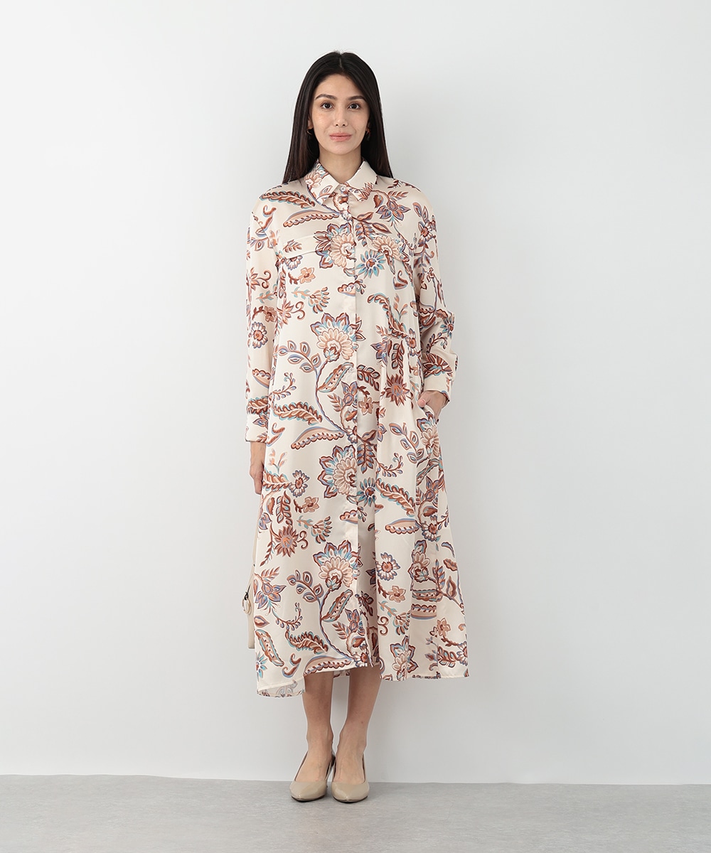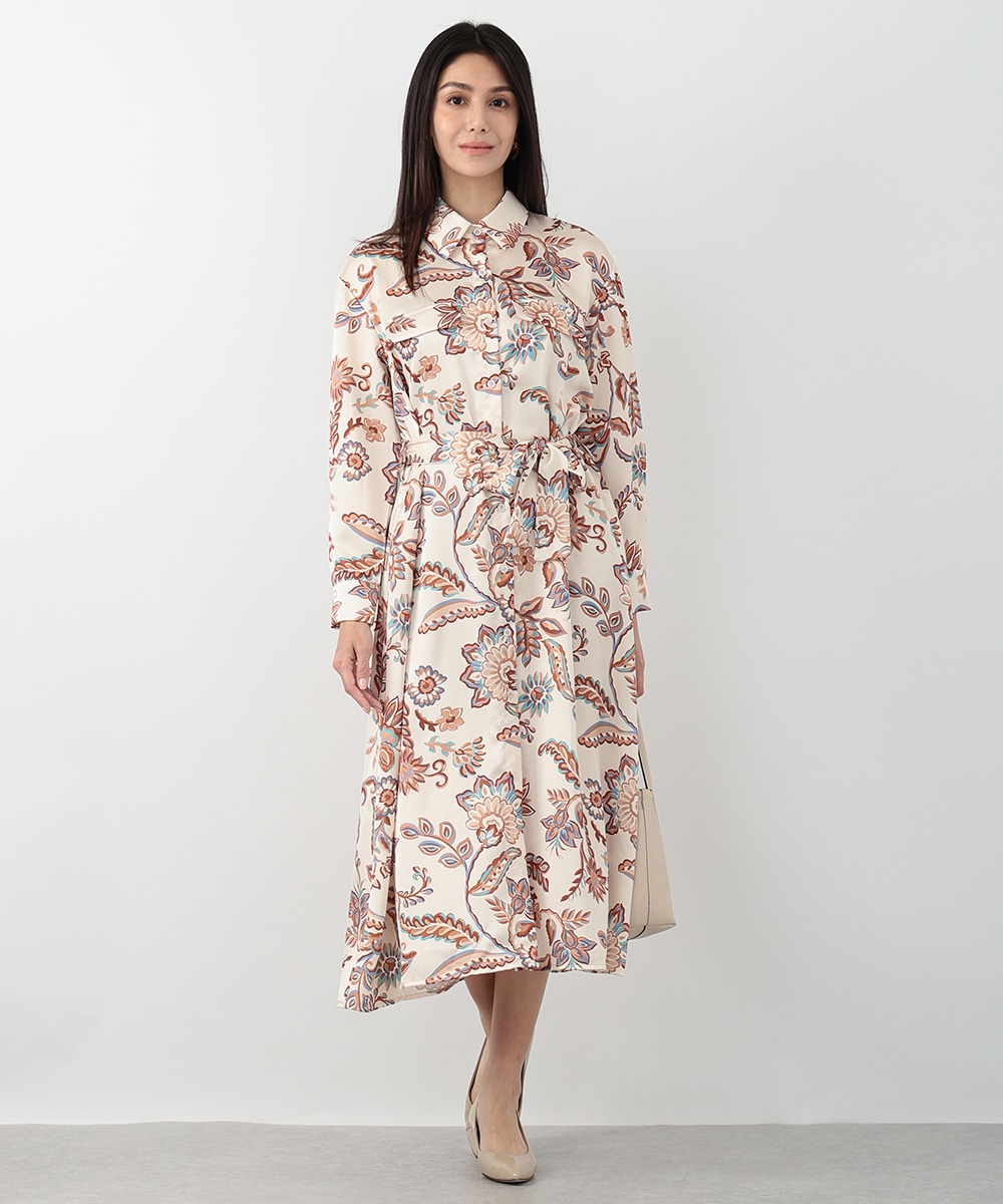ベージュのボタニカルプリントが上品な風合いを放つミディ丈シャツワンピース。同素材のリボンが付属しており、結ぶことでウエストマークすることができます。前開きなので軽い羽織りとしてお使いいただけるのもポイント。1枚で着用するのはもちろん、お手持ちのジャケットとレイヤードしたスタイリングもおすすめです。