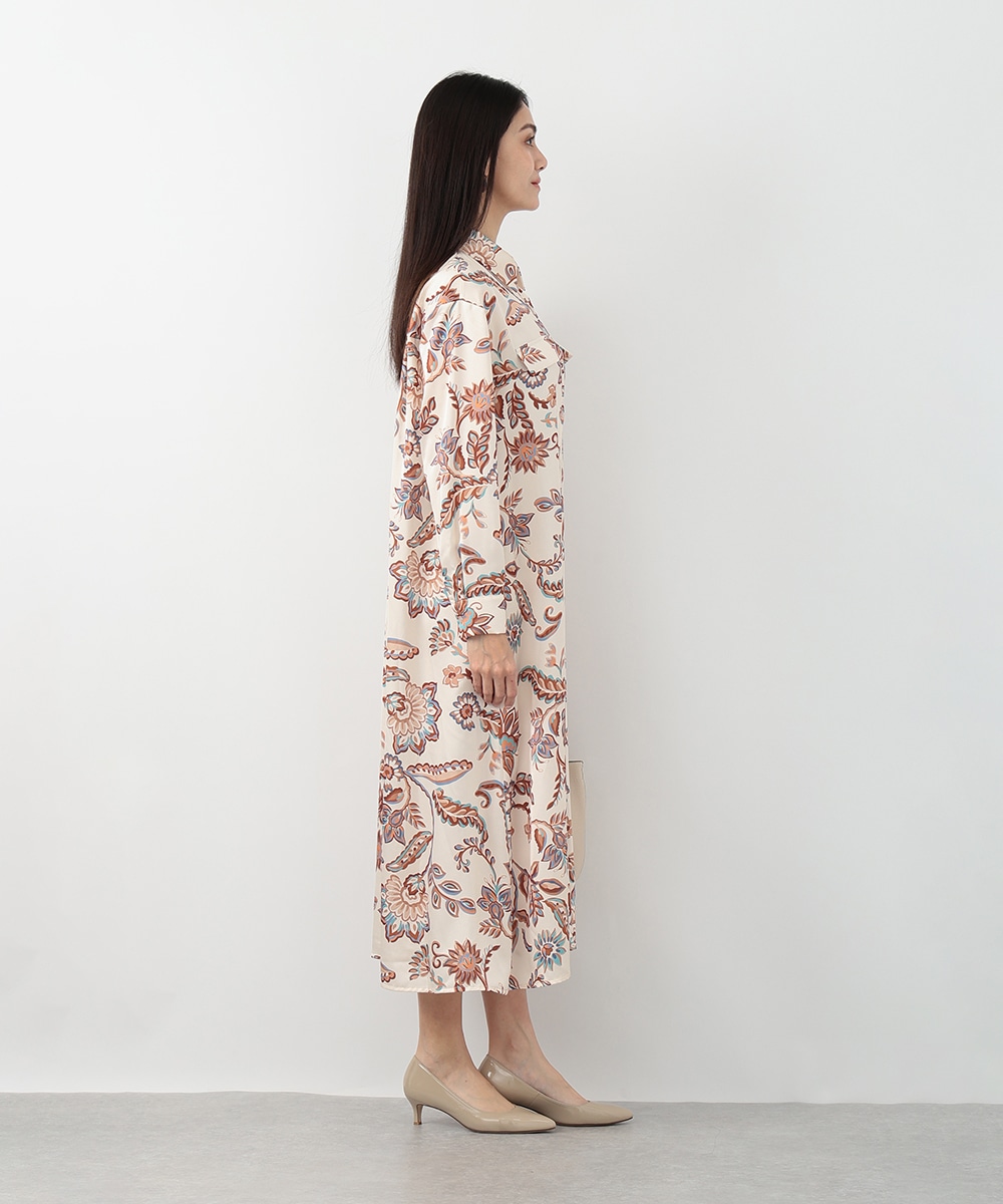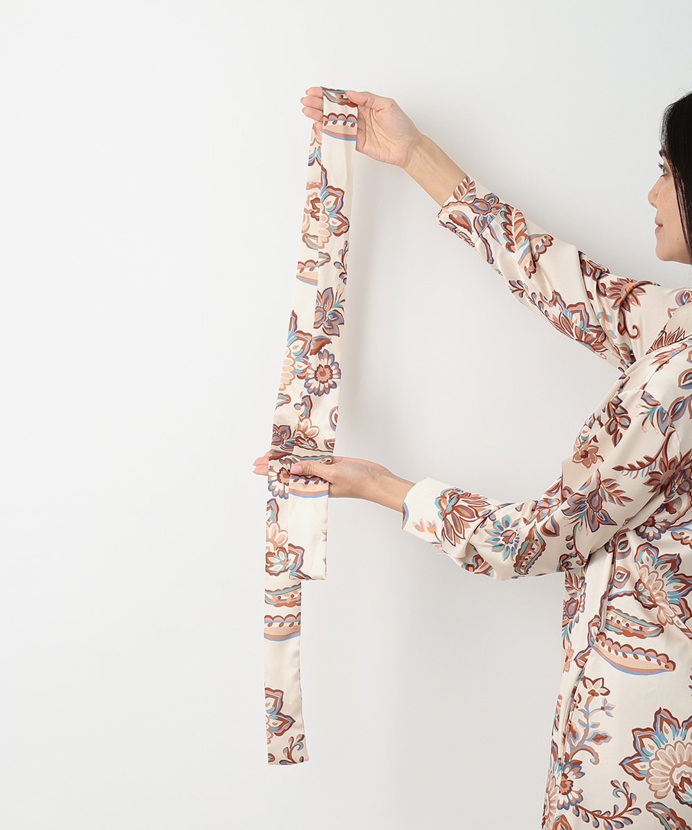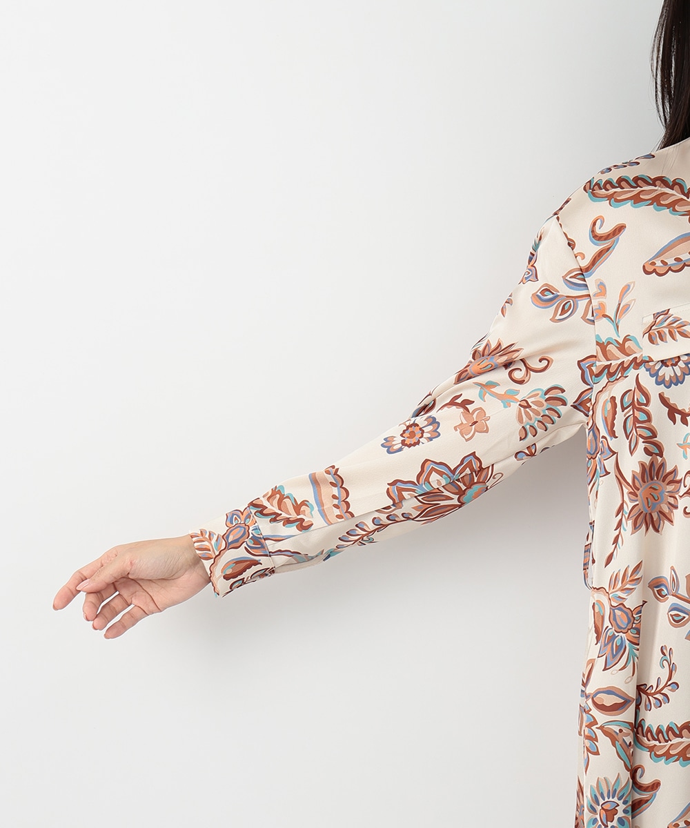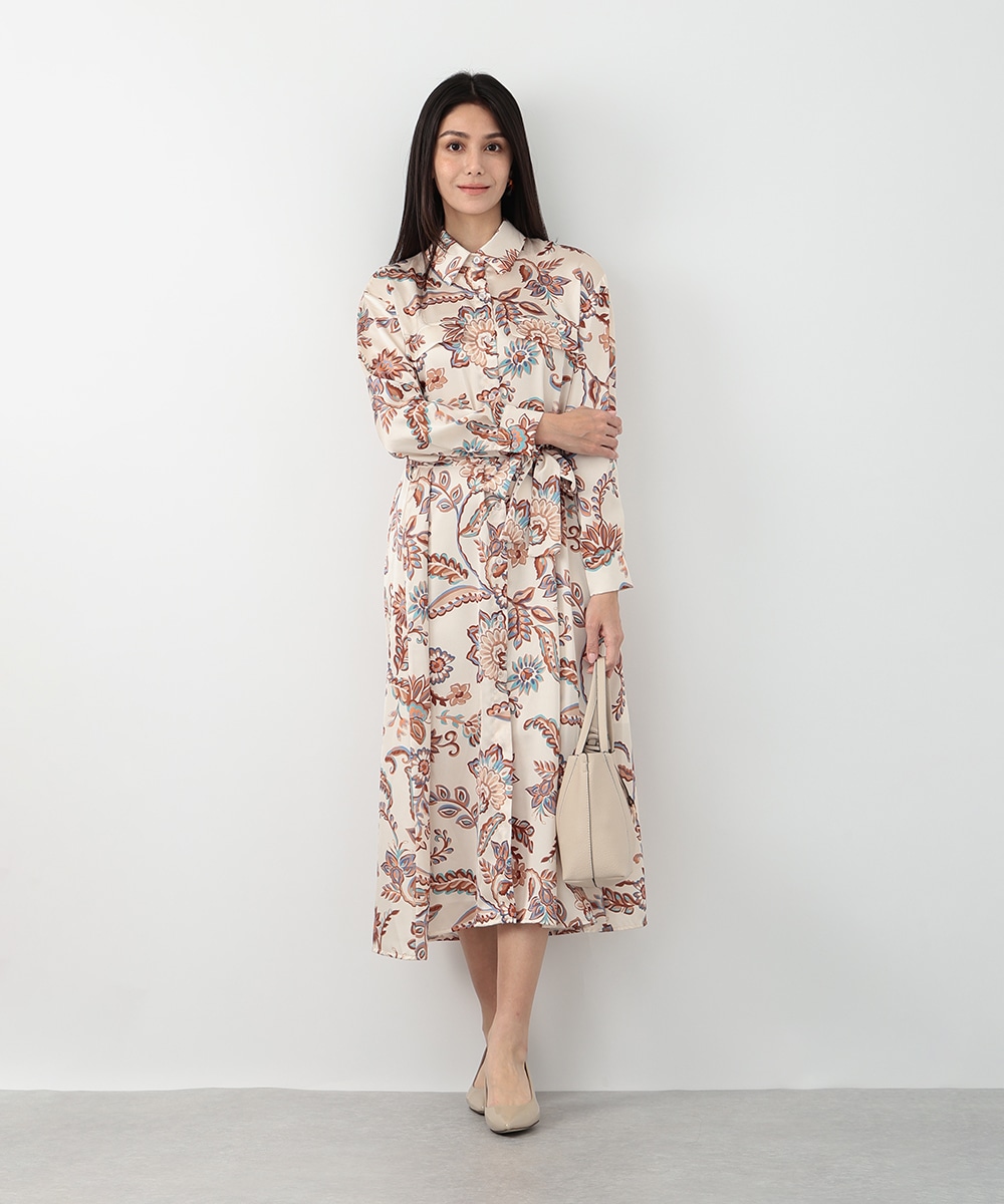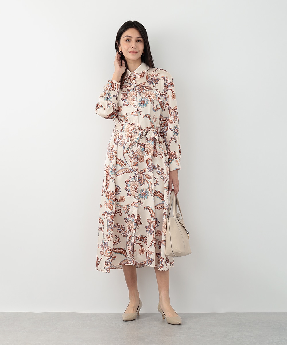ベージュのボタニカルプリントが上品な風合いを放つミディ丈シャツワンピース。同素材のリボンが付属しており、結ぶことでウエストマークすることができます。前開きなので軽い羽織りとしてお使いいただけるのもポイント。1枚で着用するのはもちろん、お手持ちのジャケットとレイヤードしたスタイリングもおすすめです。