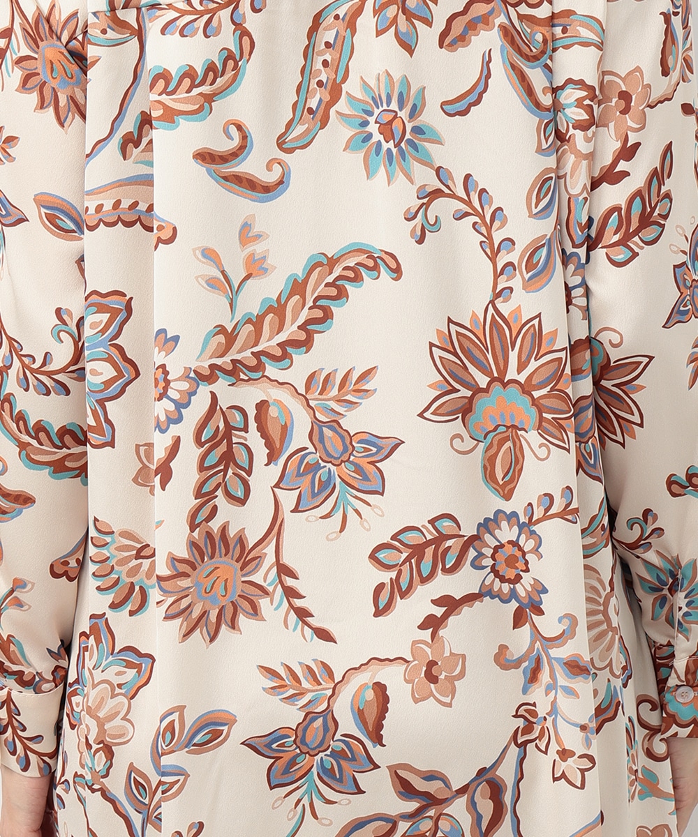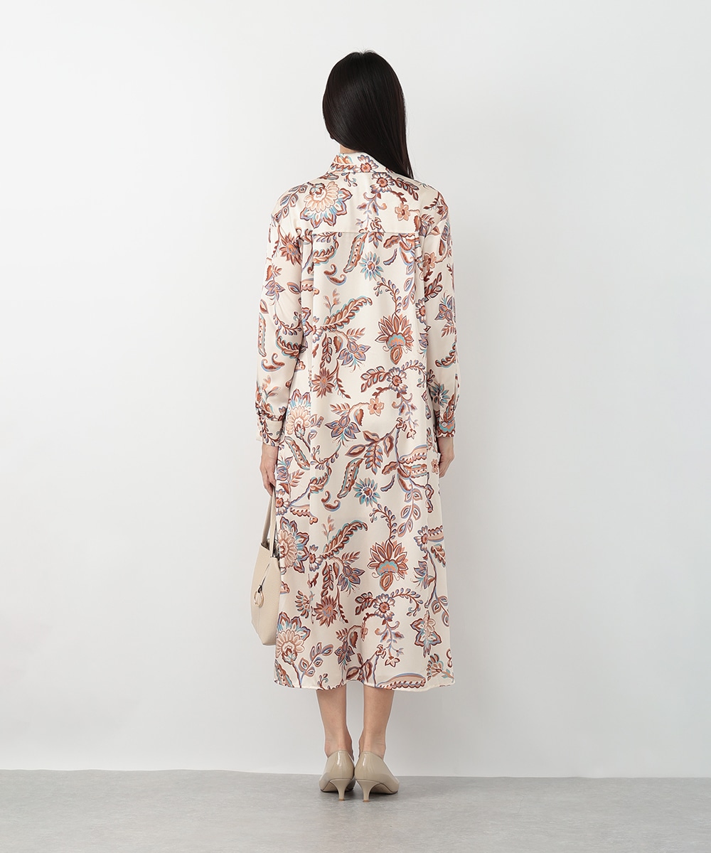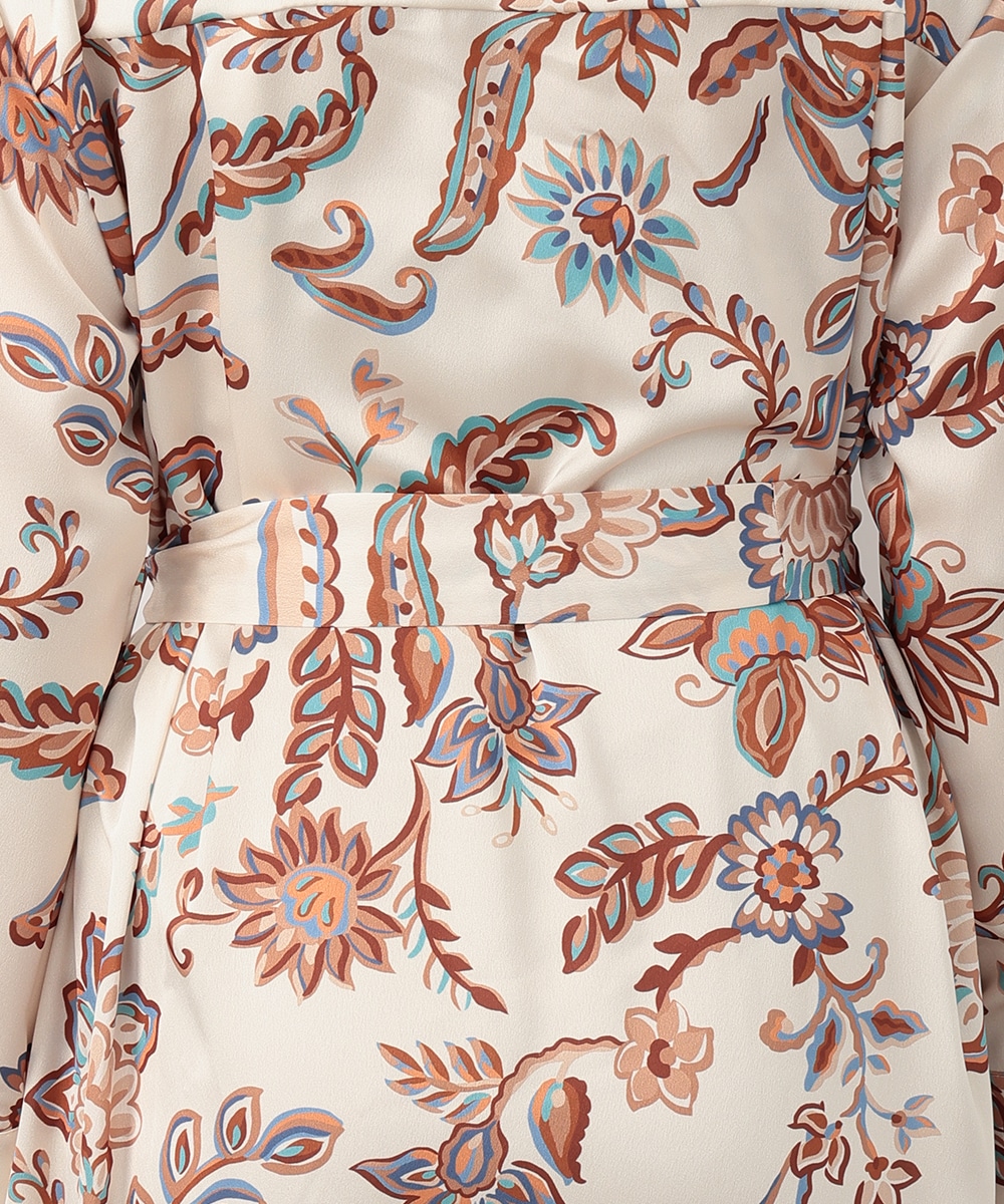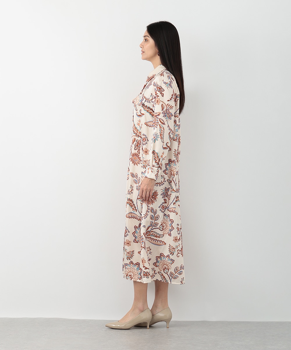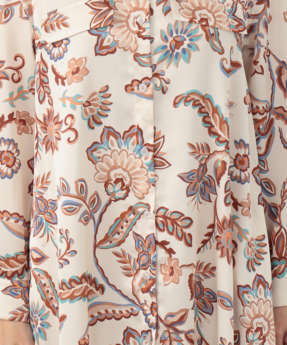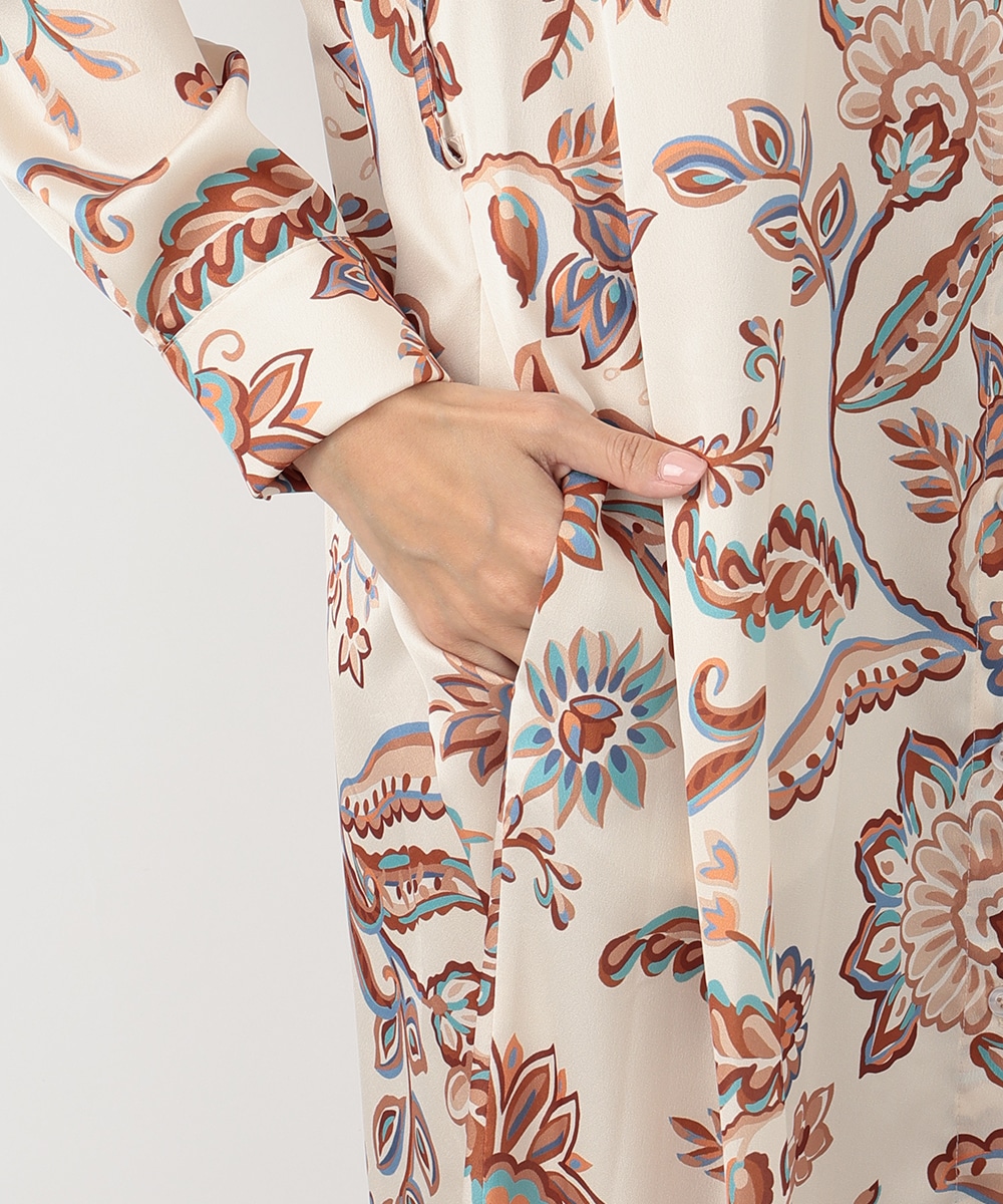 ベージュのボタニカルプリントが上品な風合いを放つミディ丈シャツワンピース。同素材のリボンが付属しており、結ぶことでウエストマークすることができます。前開きなので軽い羽織りとしてお使いいただけるのもポイント。1枚で着用するのはもちろん、お手持ちのジャケットとレイヤードしたスタイリングもおすすめです。