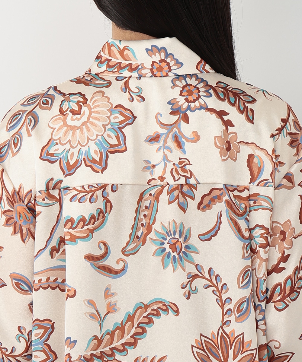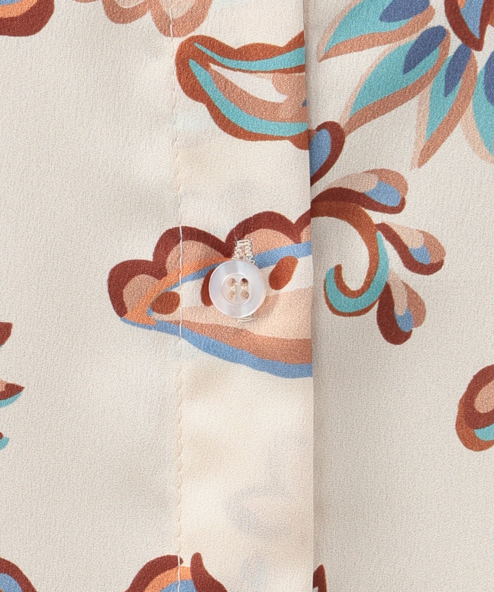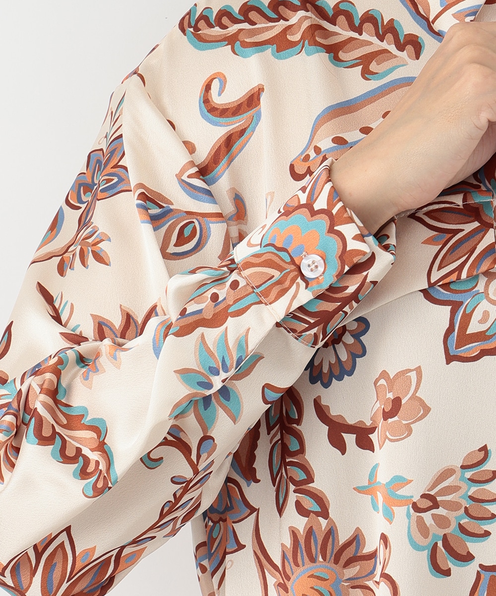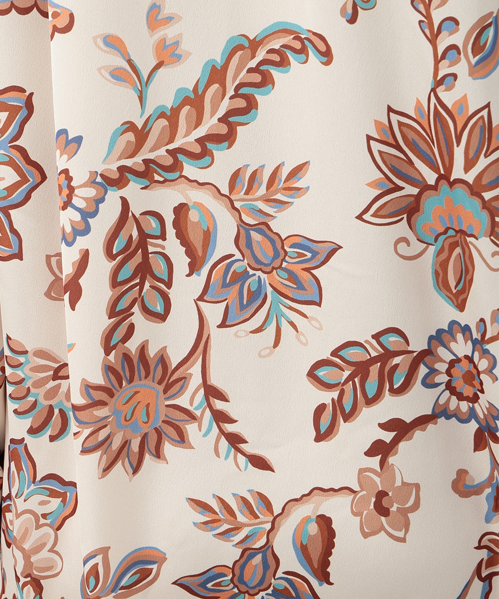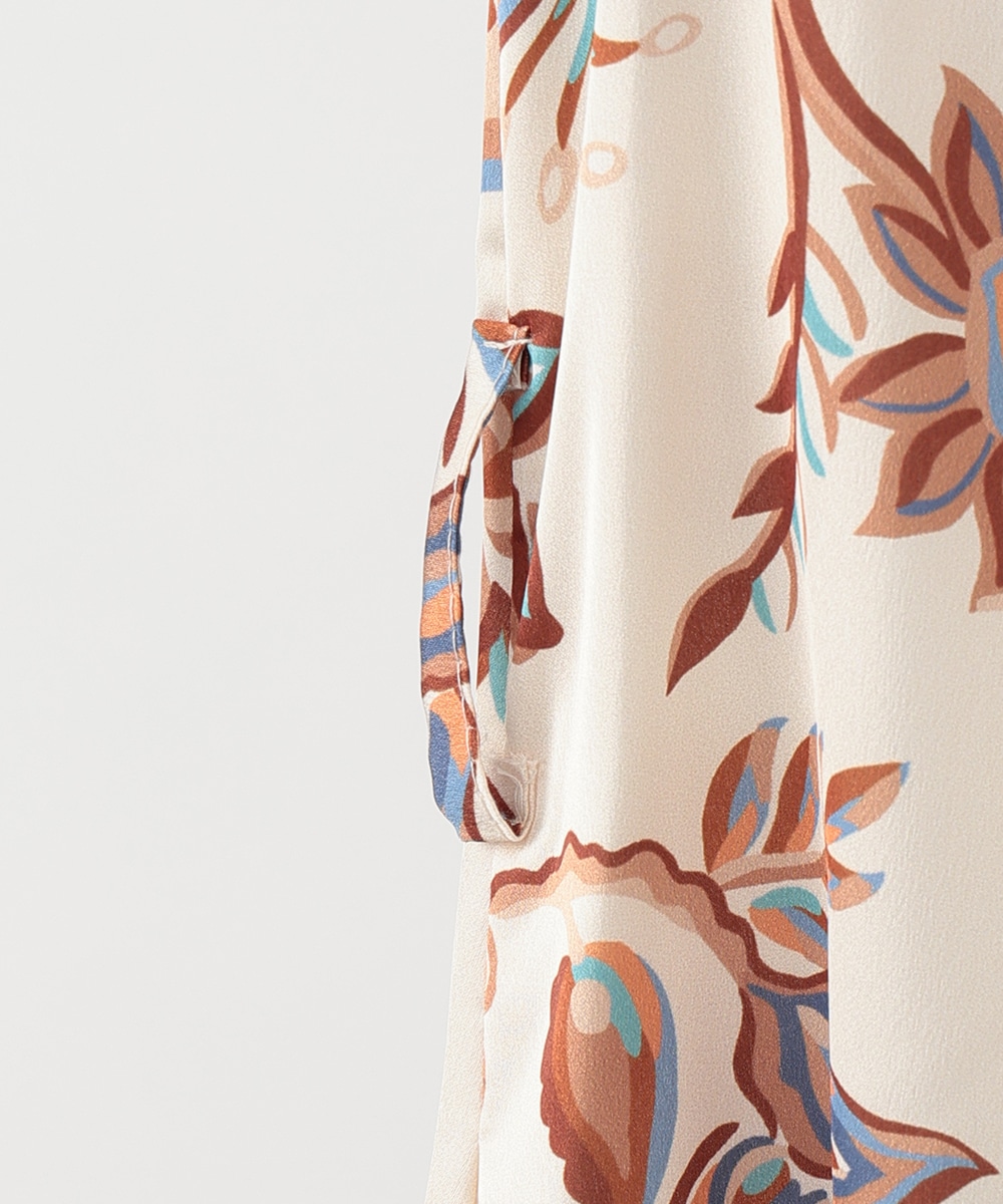 ベージュのボタニカルプリントが上品な風合いを放つミディ丈シャツワンピース。同素材のリボンが付属しており、結ぶことでウエストマークすることができます。前開きなので軽い羽織りとしてお使いいただけるのもポイント。1枚で着用するのはもちろん、お手持ちのジャケットとレイヤードしたスタイリングもおすすめです。