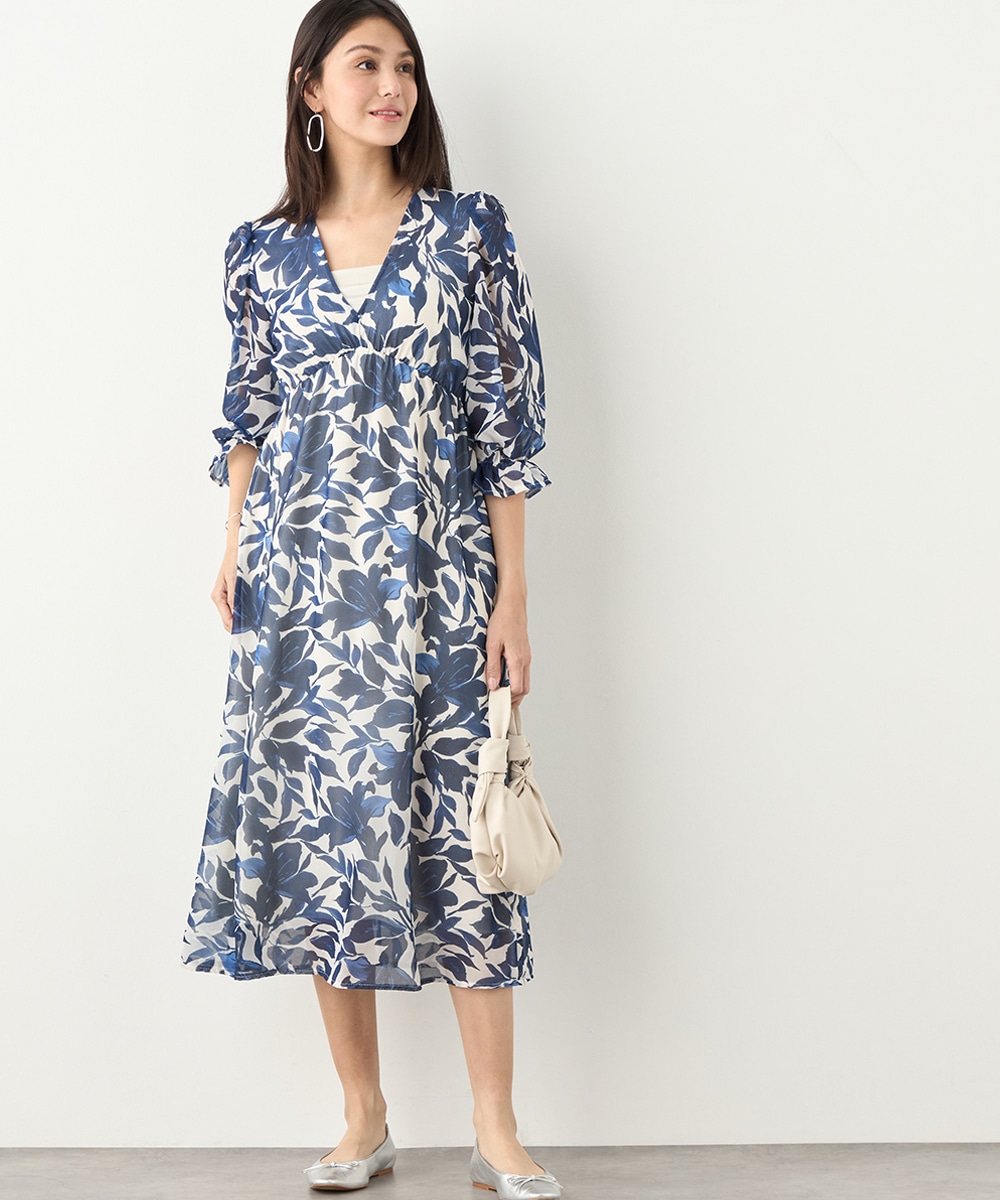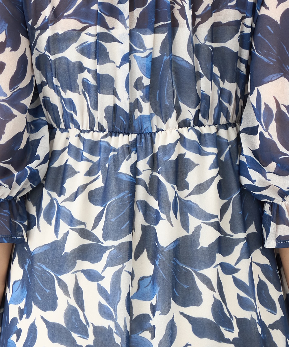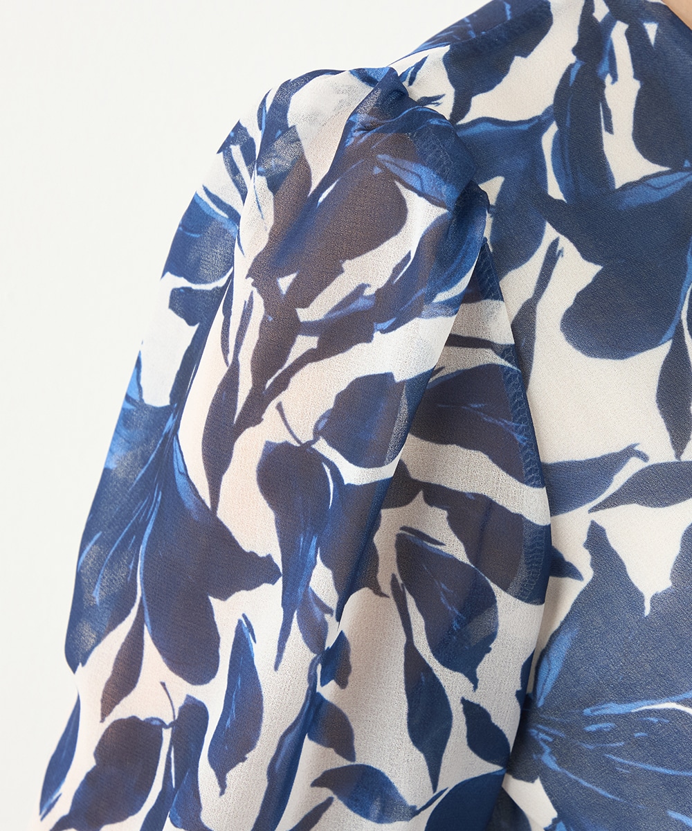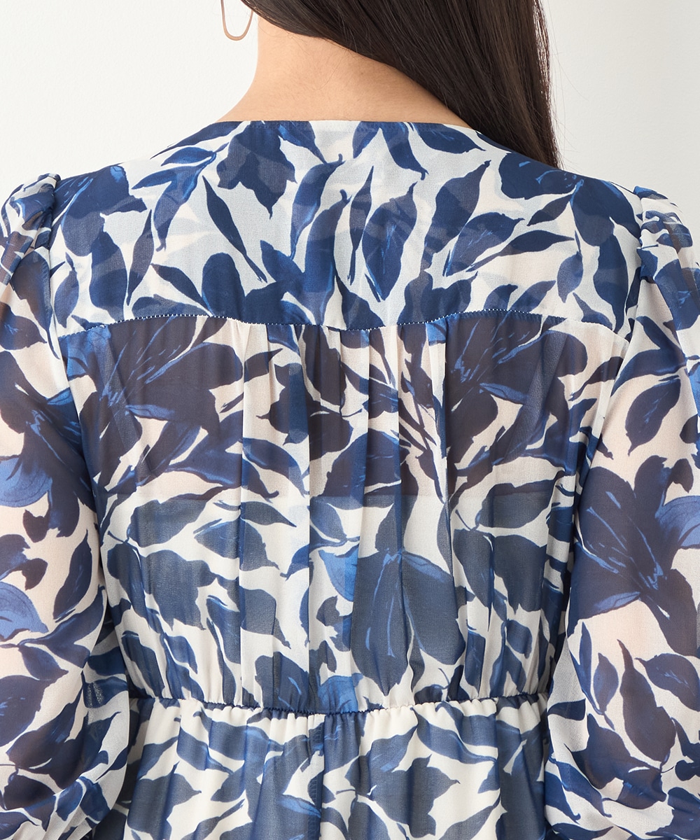 大きく描かれたフラワーが女性らしく華やかな印象です。深めのVネックでフェイスラインがすっきりと見えるのもポイント。胸下に切り替えを取り入れており、スタイルにメリハリが加わっています。たっぷりのギャザーが作り出すきれいなラインも特徴です。生地には繊細な透け感があり、軽やかに着こなせます。